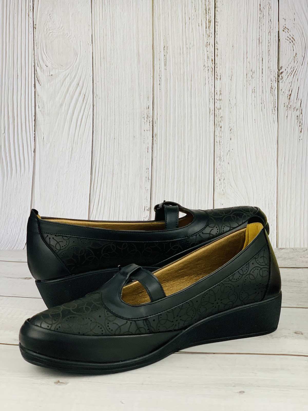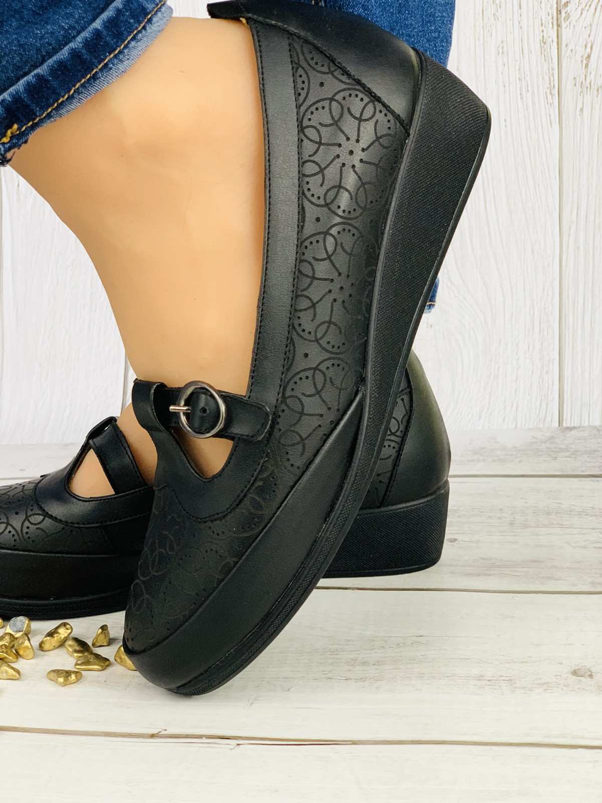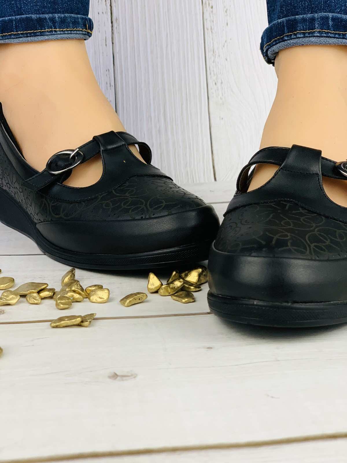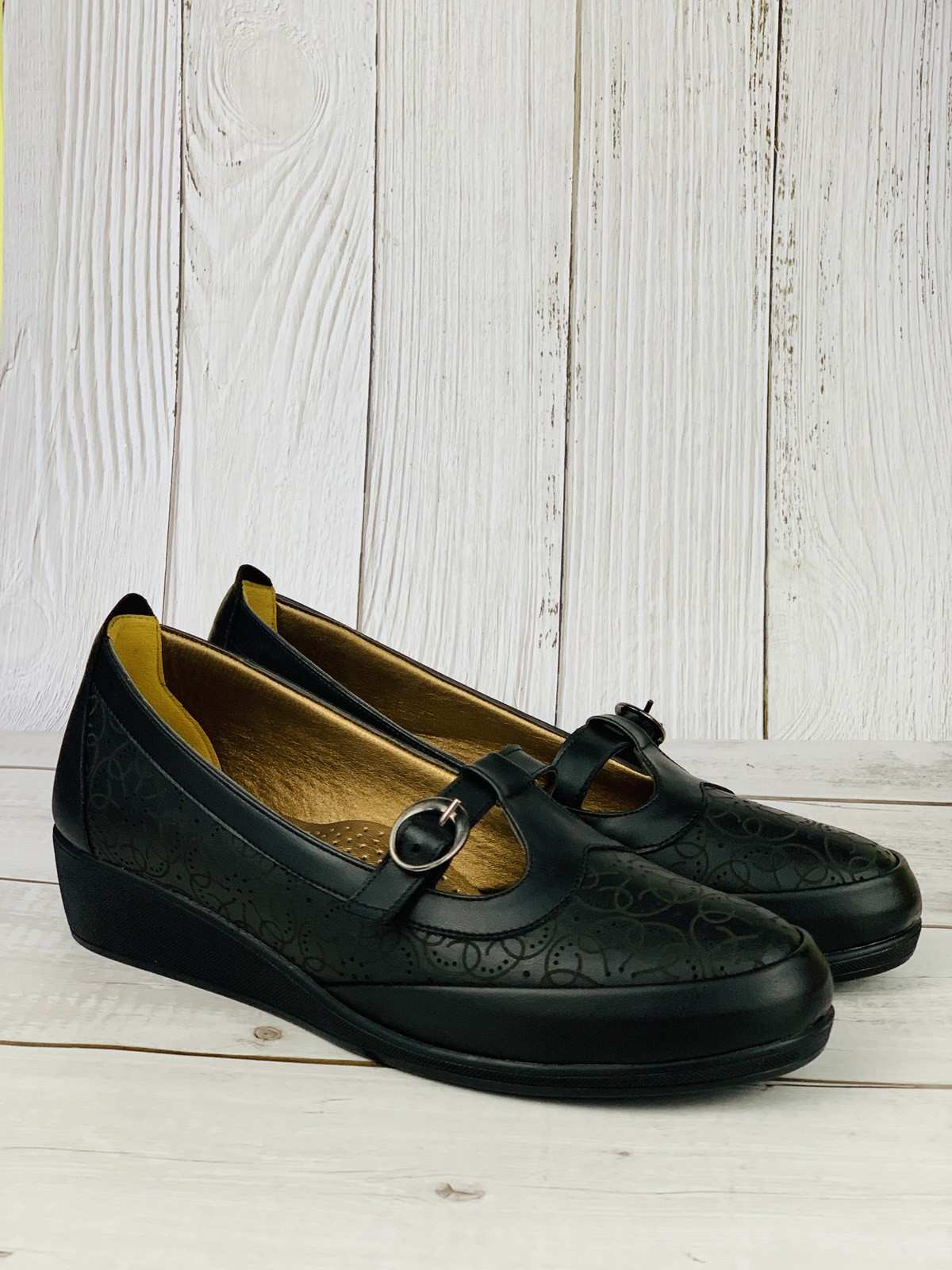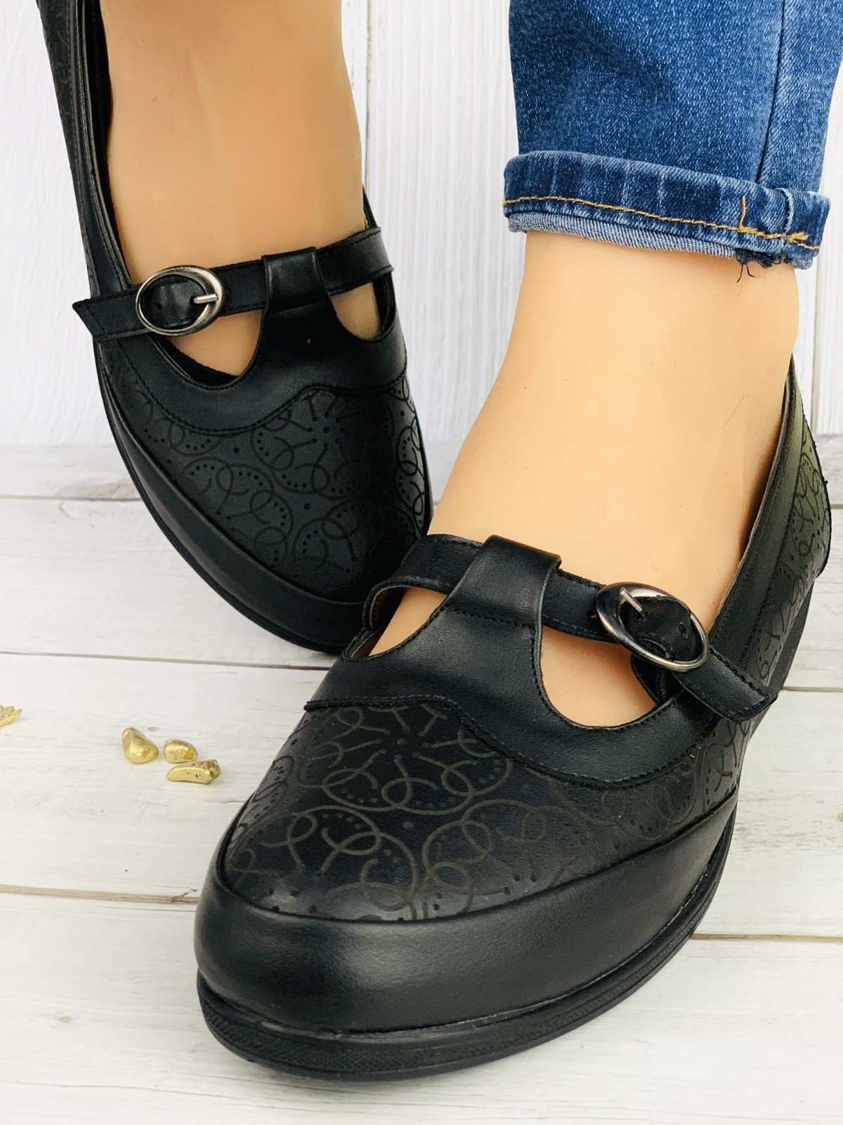 حذاء نسائي مريح باللون الأسود بحزام وإغلاق ذهبي، كعب طبي متوسط