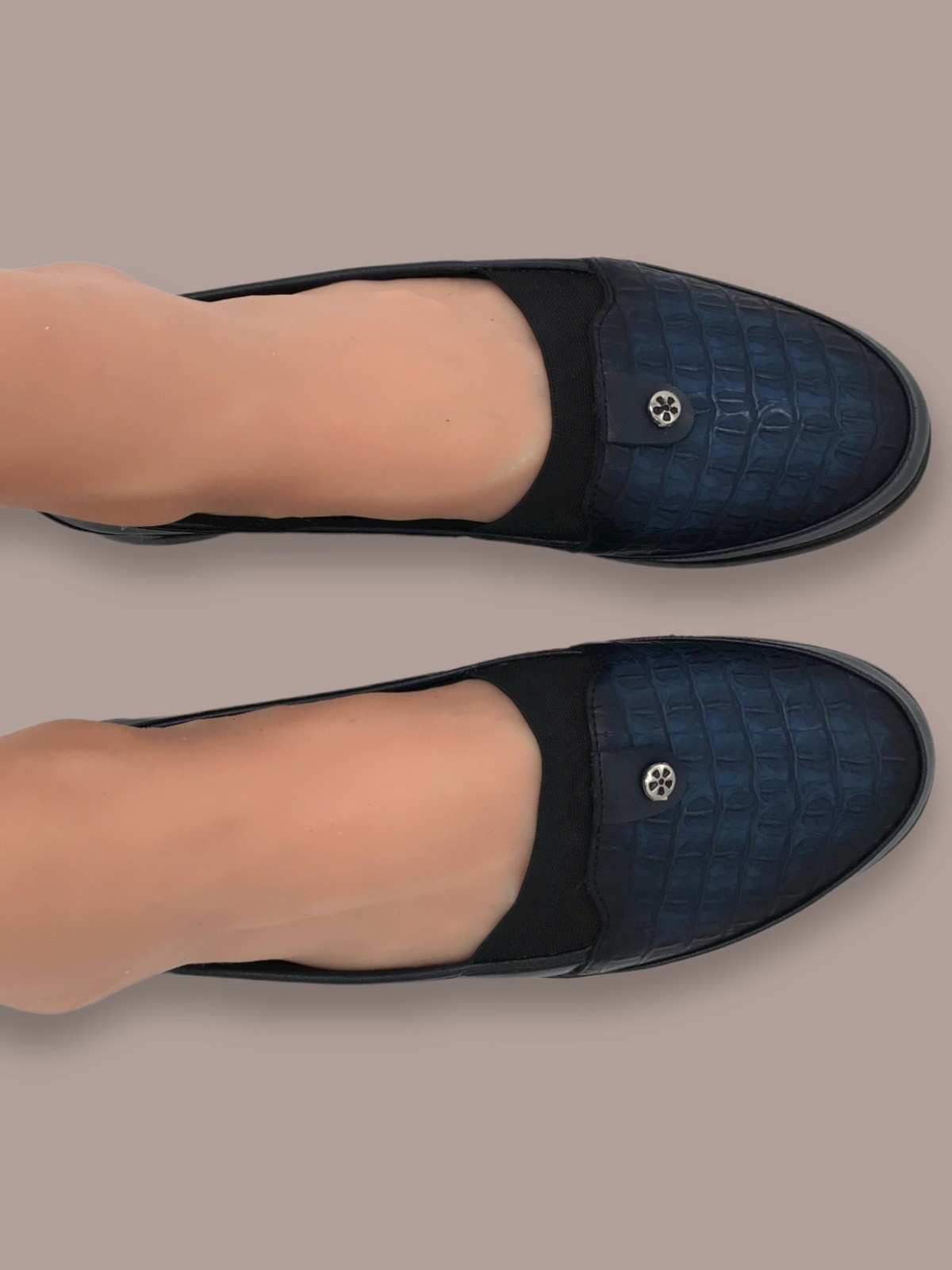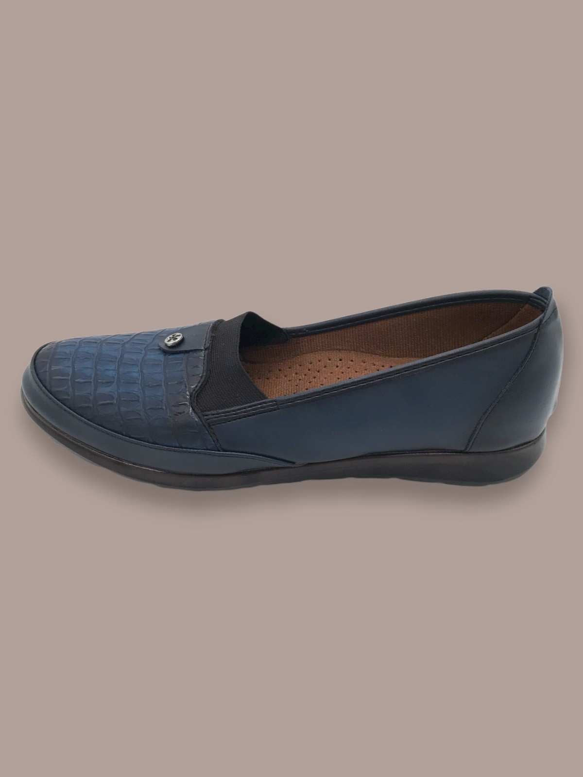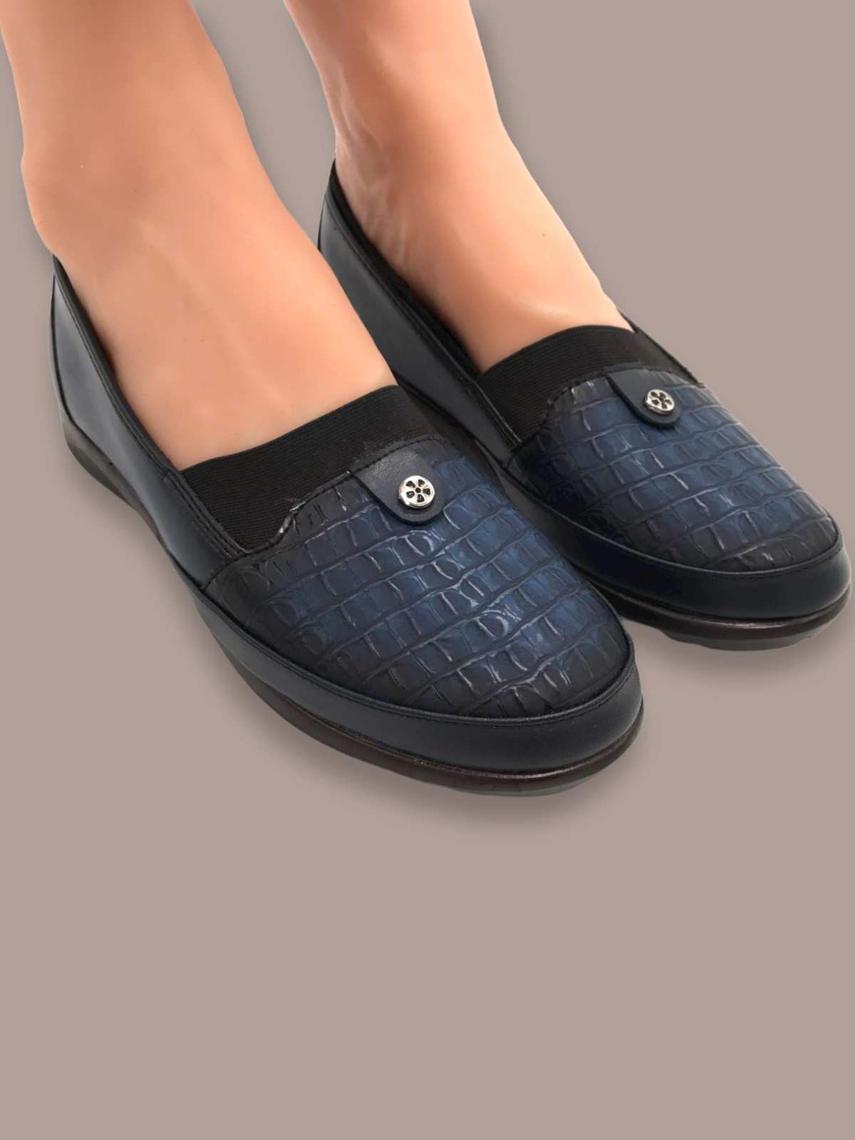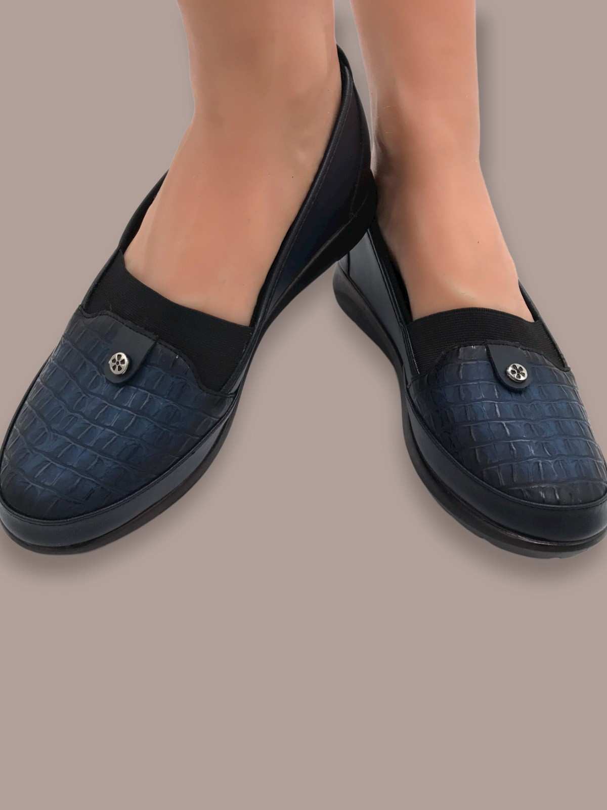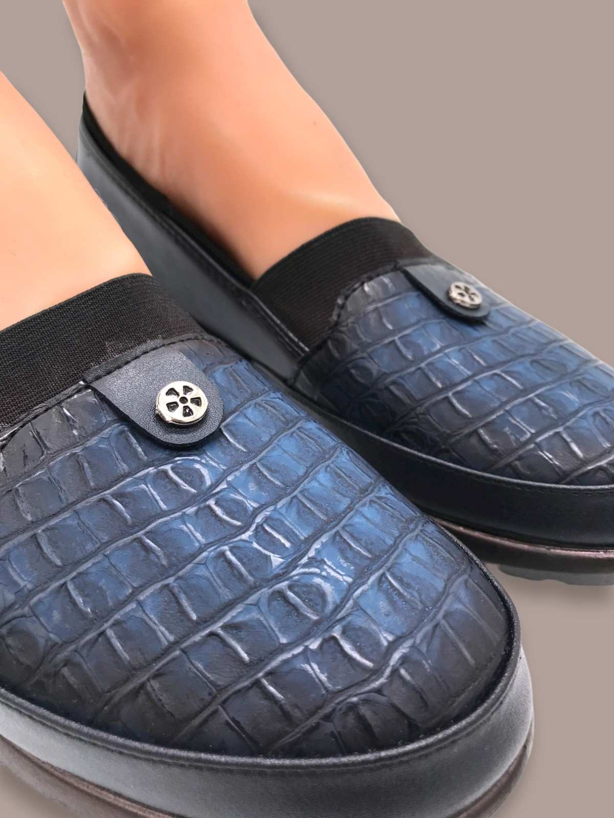 حذاء نسائي مريح باللون الأزرق مع اللون الأسود بإبزيم نحاسي في المنتصف، كعب طبي متوسط