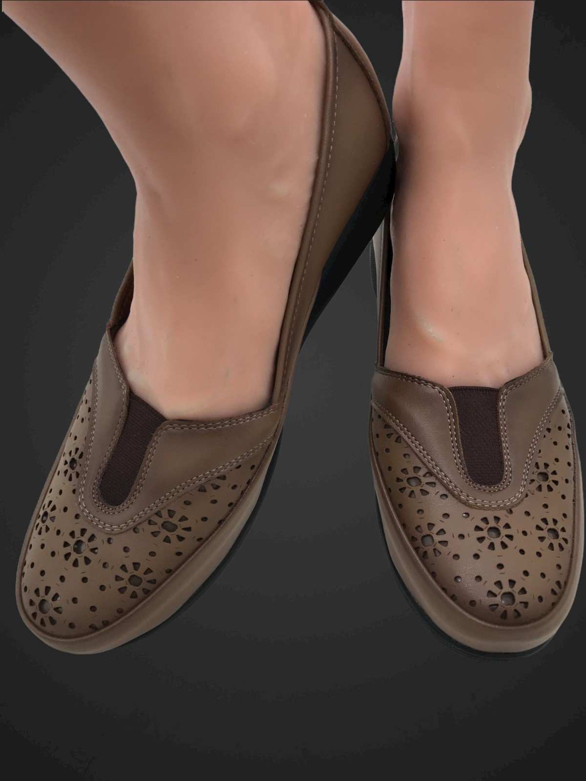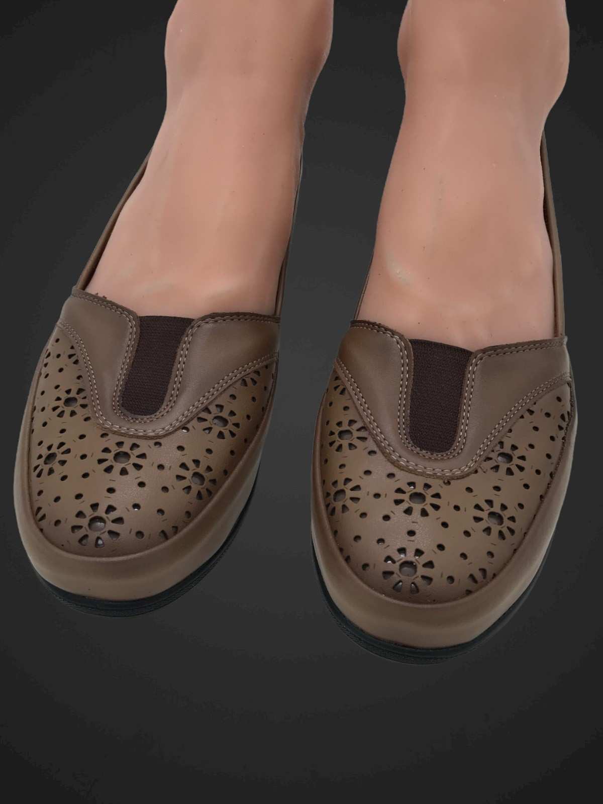 حذاء نسائي مريح بني فاتح مع شريط مطاطي في الوسط، كعب طبي متوسط