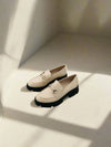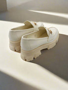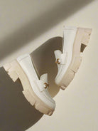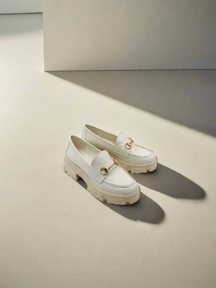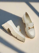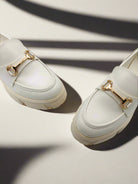 حذاء لوفر بسلسلة ذهبية وكعب عريض - أبيض