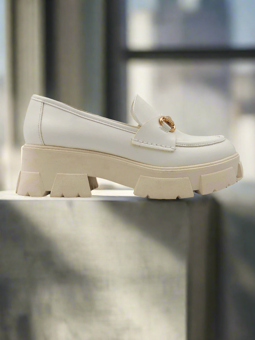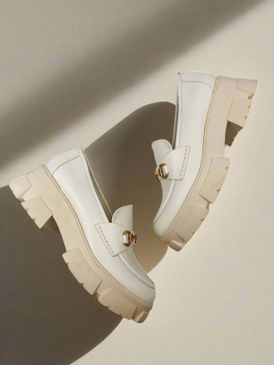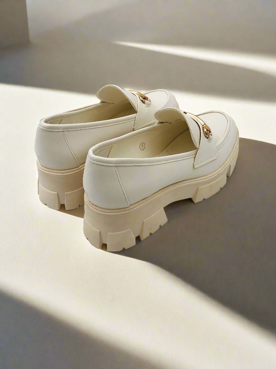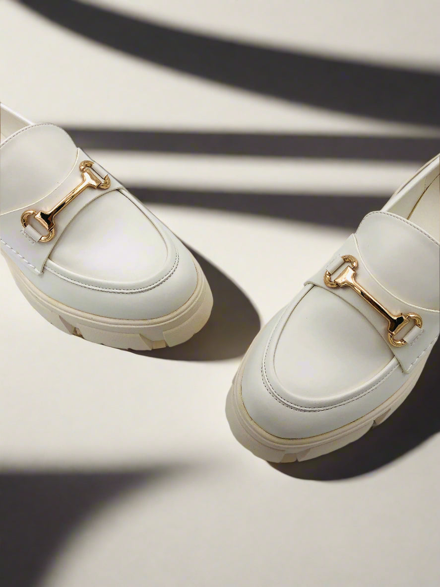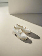 حذاء لوفر نسائي أنيق وعصري باللون الأبيض، مع وسادة قدم مبطنة للراحة، سلسلة ذهبية، ونعل بيج. مثالي لإكمال إطلالات مختلفة.