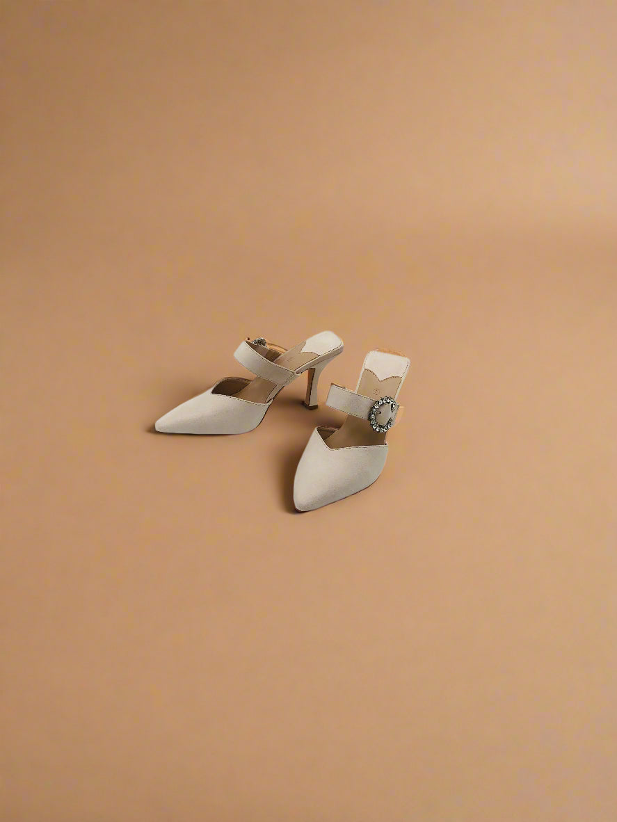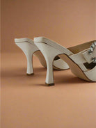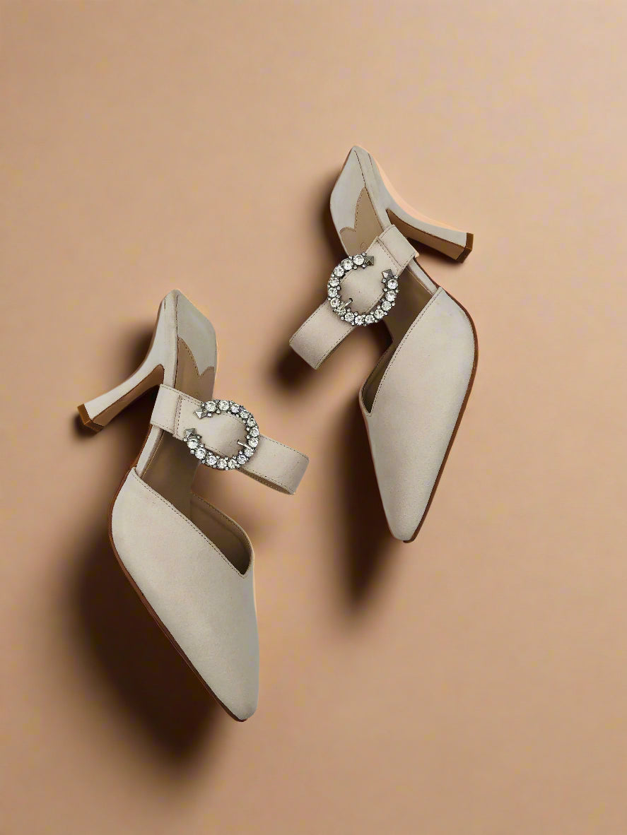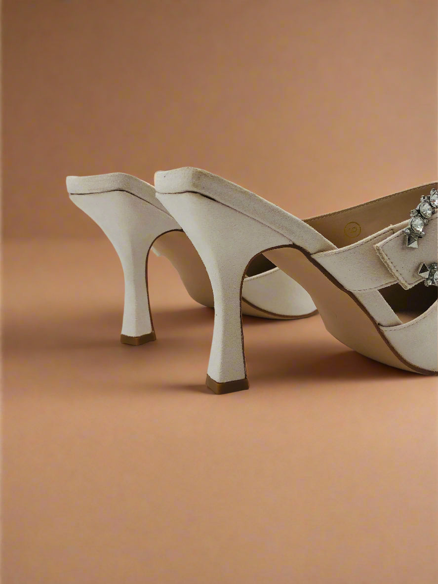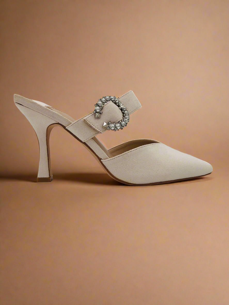 ميولز مريح نسائي مفتوح من الخلف باللون البيج، بكعب عالي، مزود ببكلة مرصعة بأحجار الراين ومقدمة مدببة، مصمم لسهولة الارتداء.