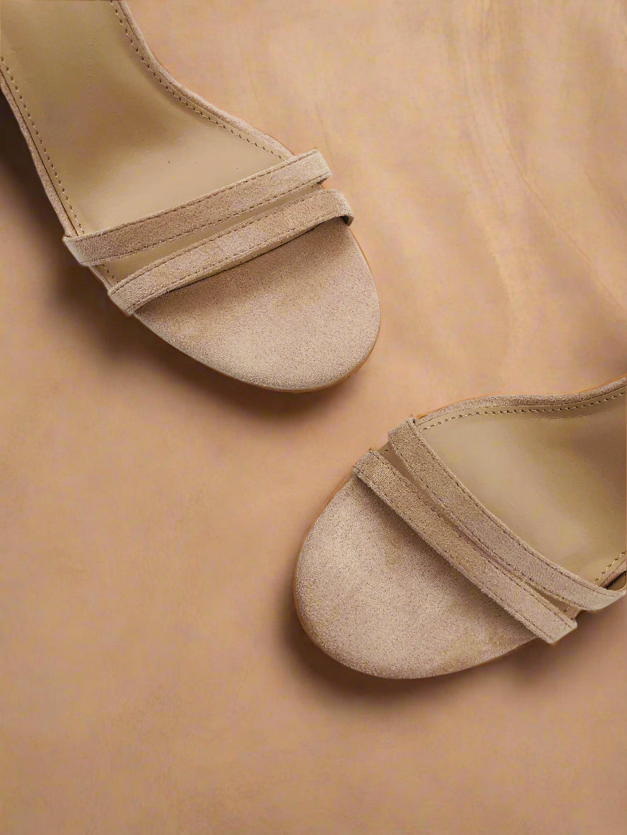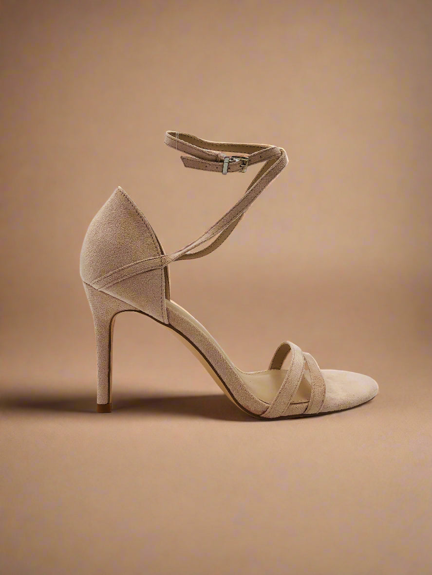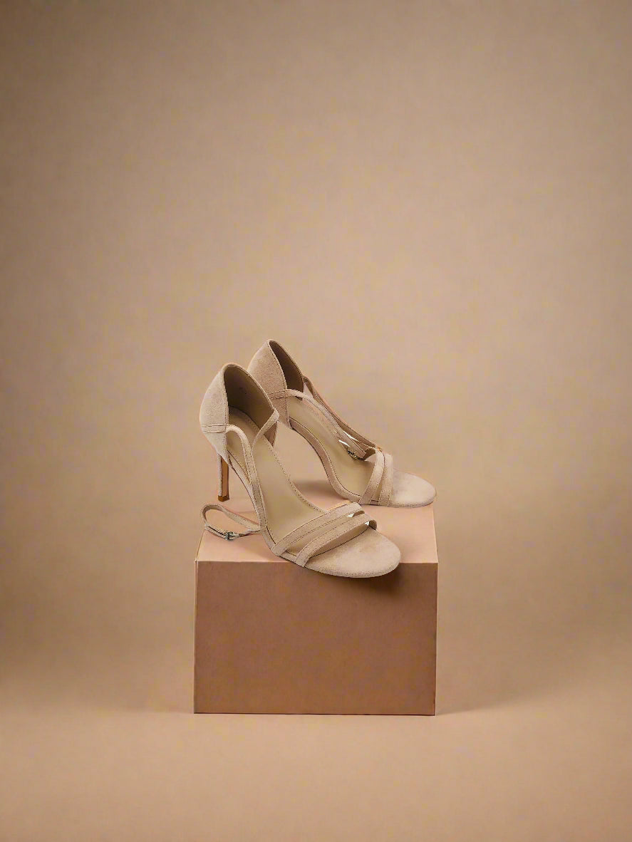 صندل بيج بمقدمة مدورة مع حزام رفيع وبكلة إغلاق، مزود بكعب ستيليتو. مثالية مع أي إطلالة.