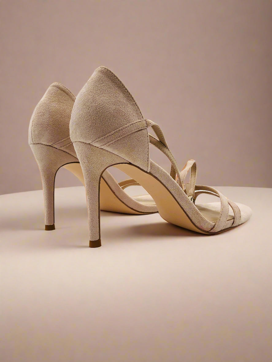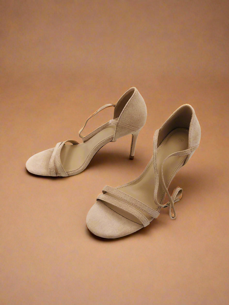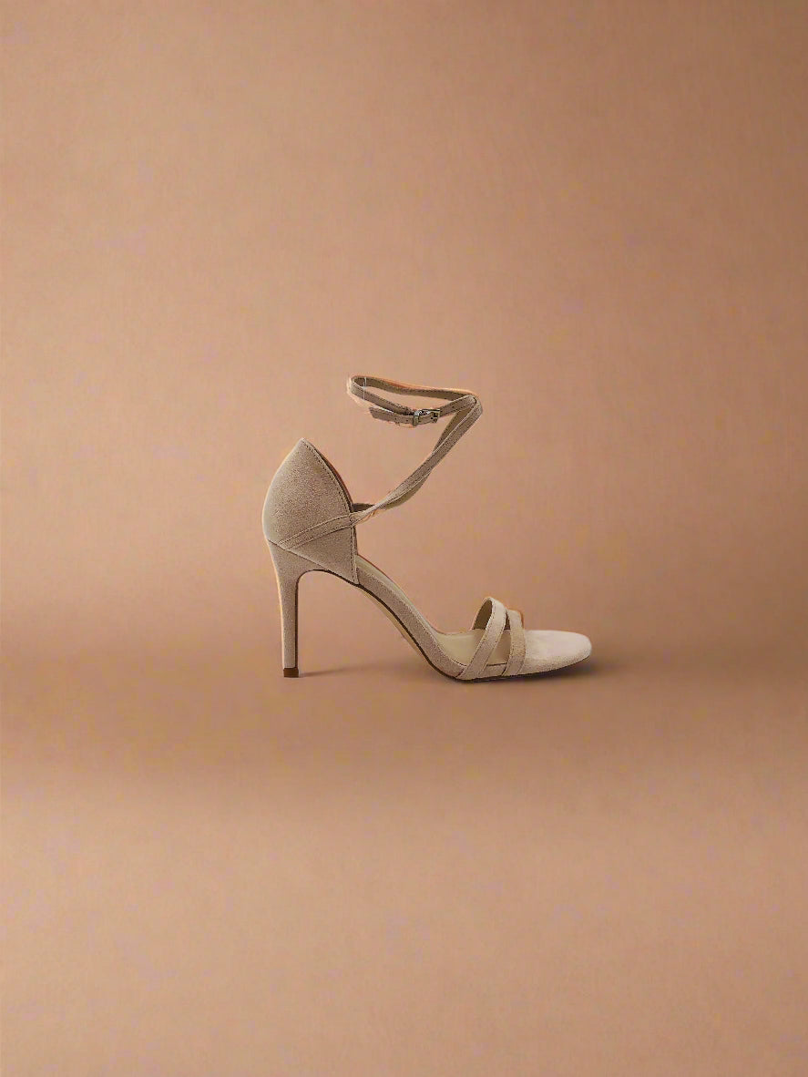 صندل بيج بمقدمة مدورة مع حزام رفيع وبكلة إغلاق، مزود بكعب ستيليتو. مثالية مع أي إطلالة.