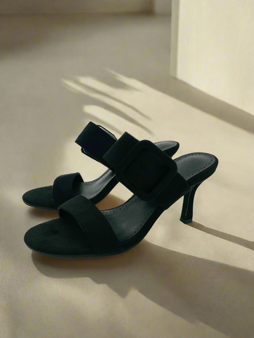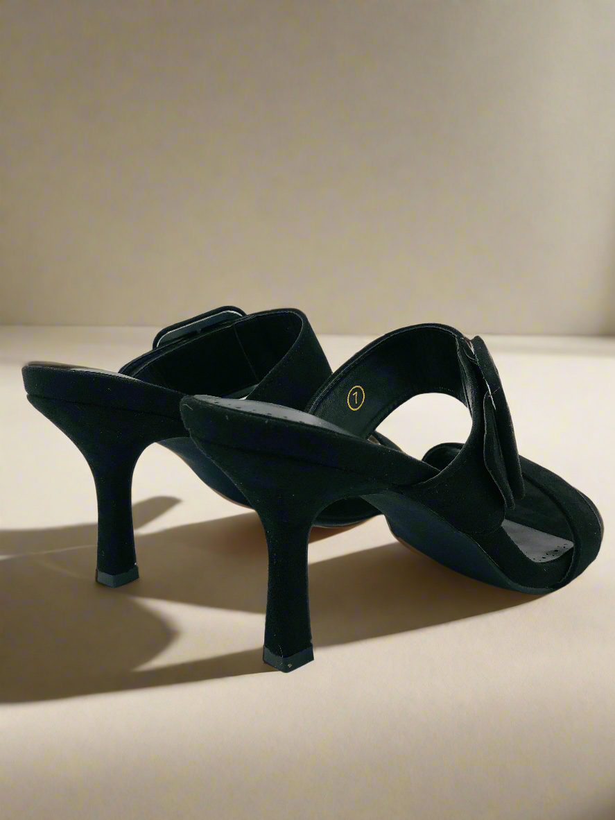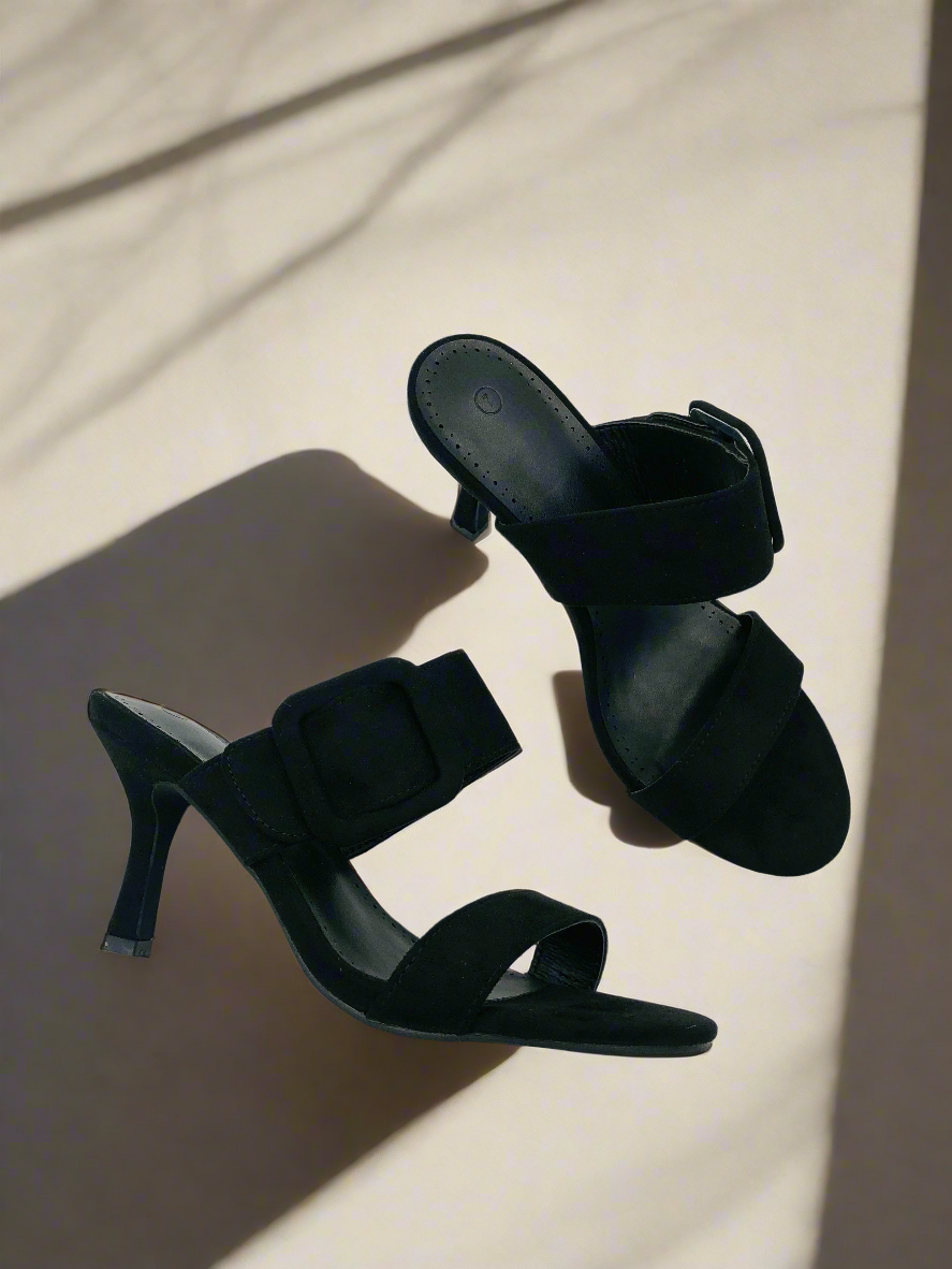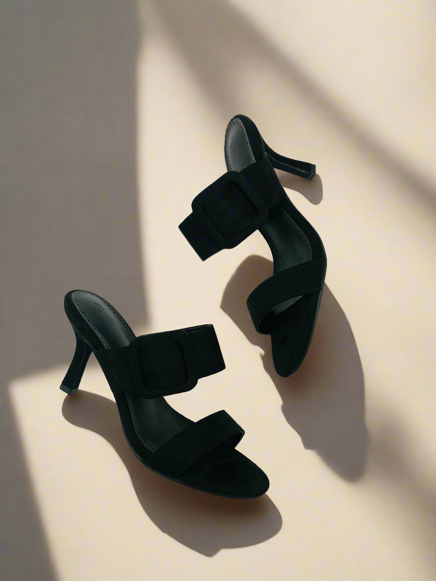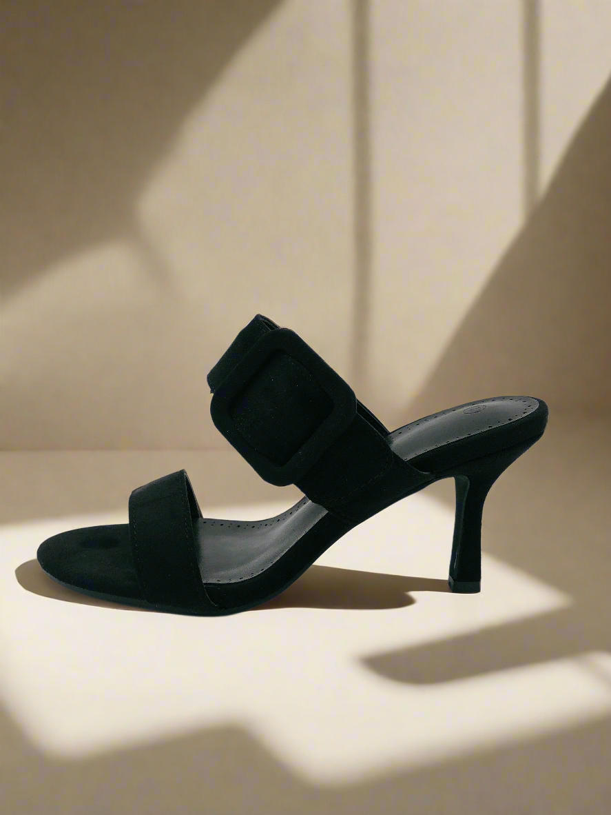 ميولز باللون الأسود مفتوحة بتصميم مدور من الأمام، بكعب رفيع متوسط الارتفاع وحزامين. مثالية للإطلالات الرسمية وغير الرسمية.
