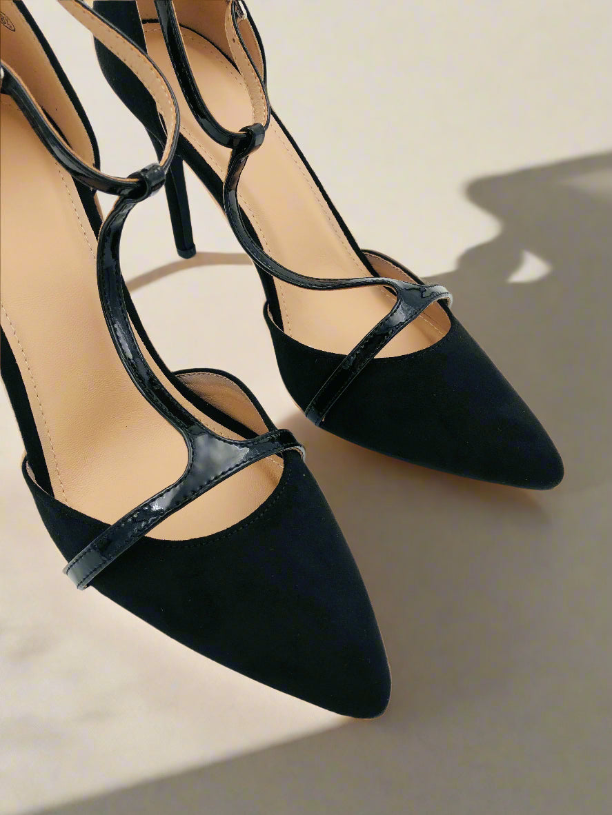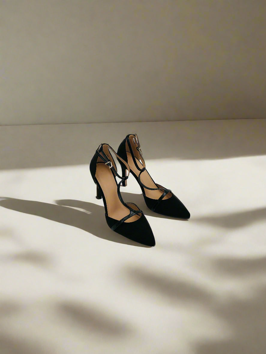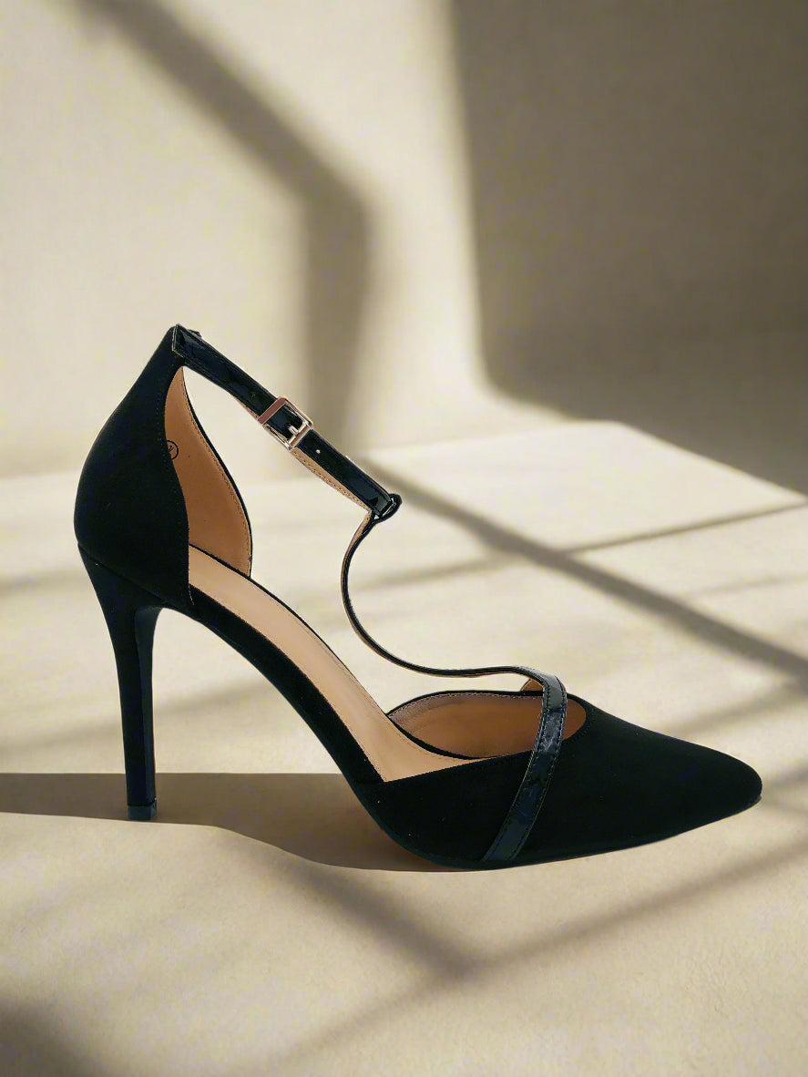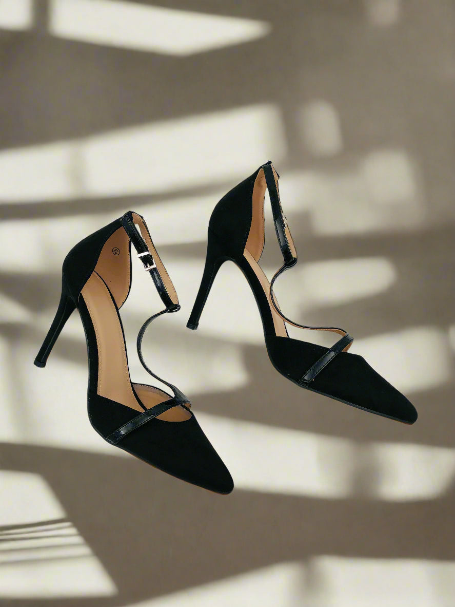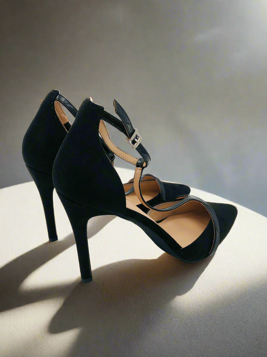حذاء ستيليتو أسود مخملي بكعب عالي ومقدمة مدببة، مزود بحزام رفيع قابل للتعديل حول الكاحل، ليمنحك إطلالة أنيقة ومريحة.