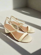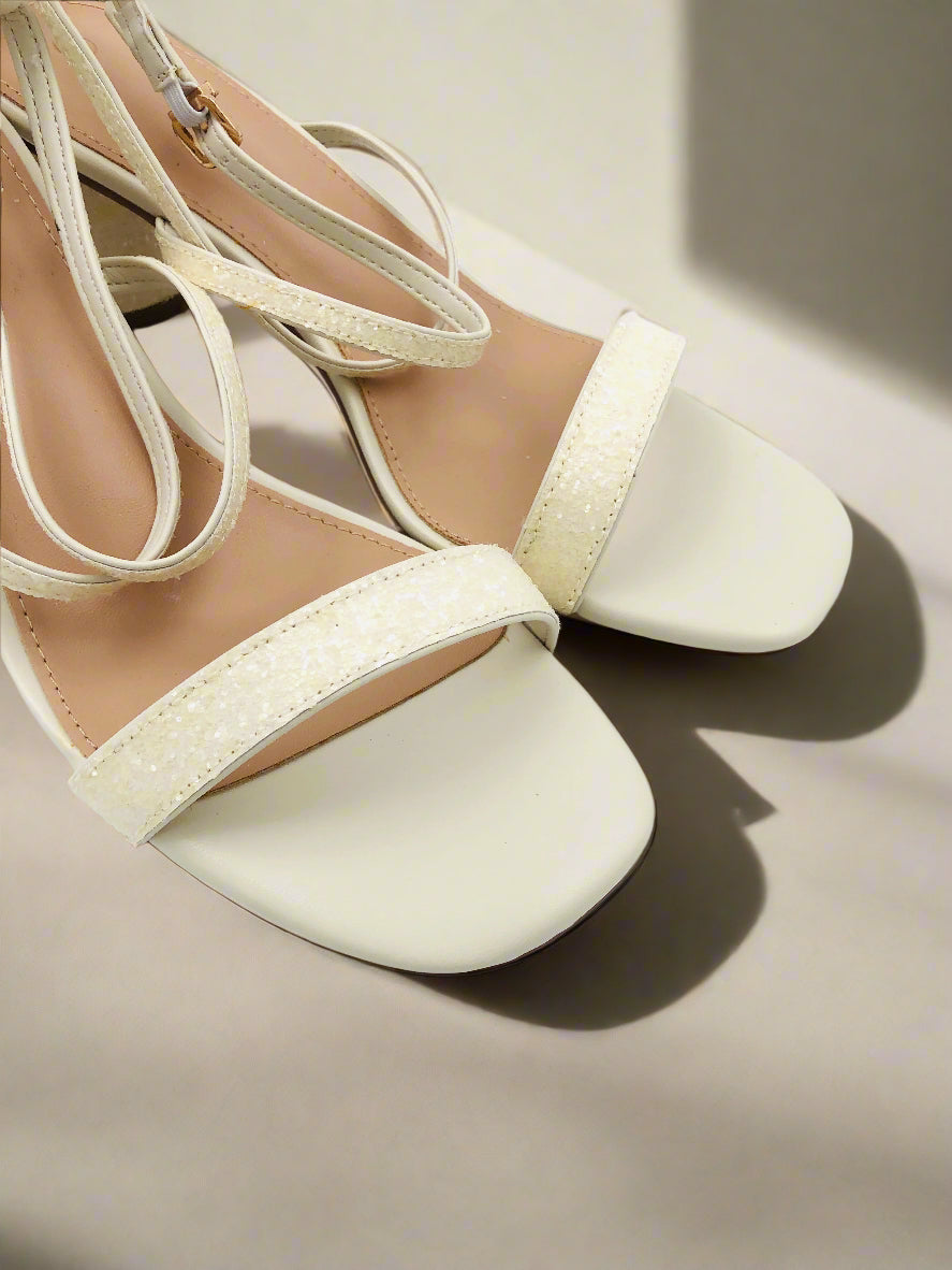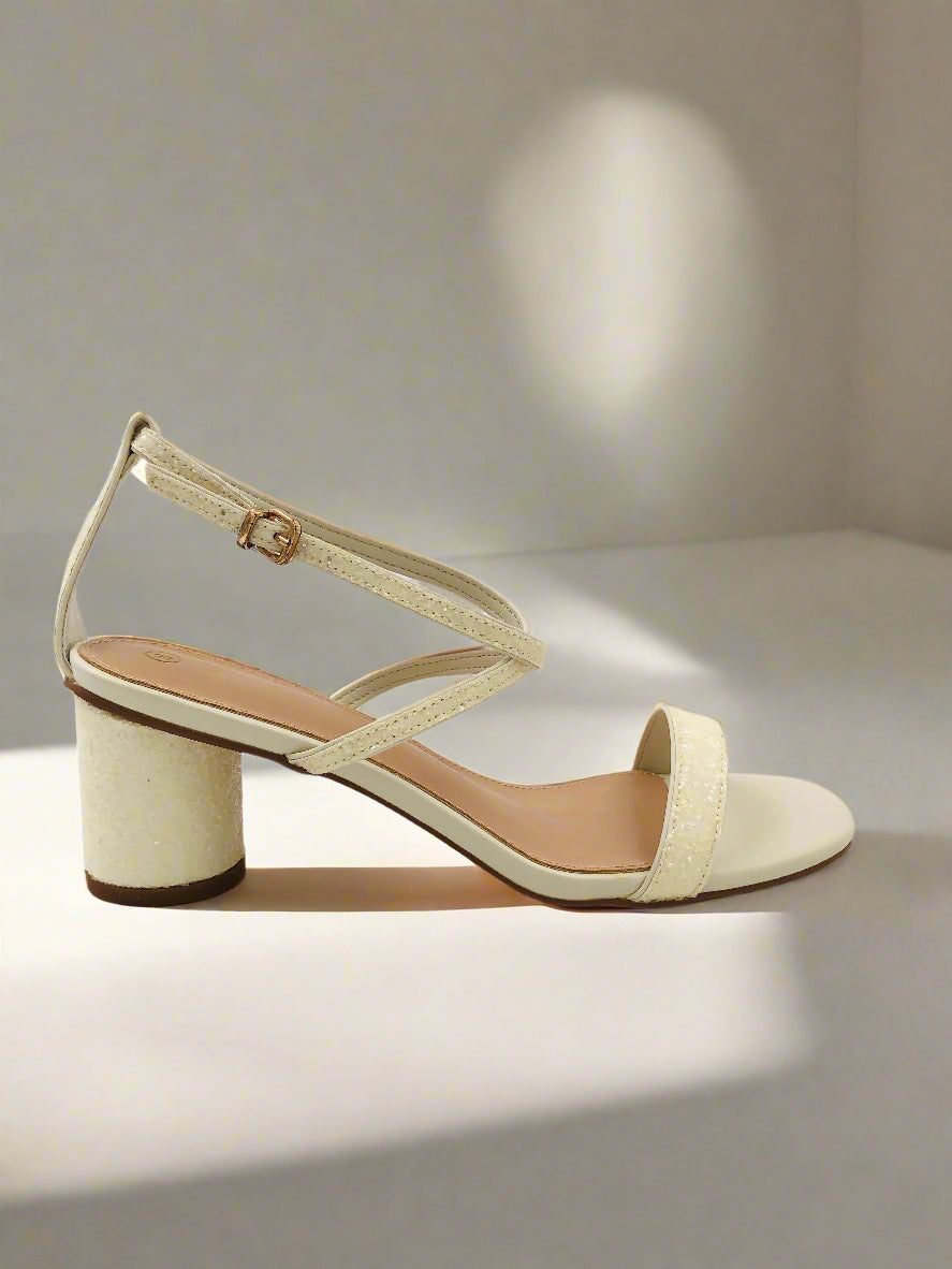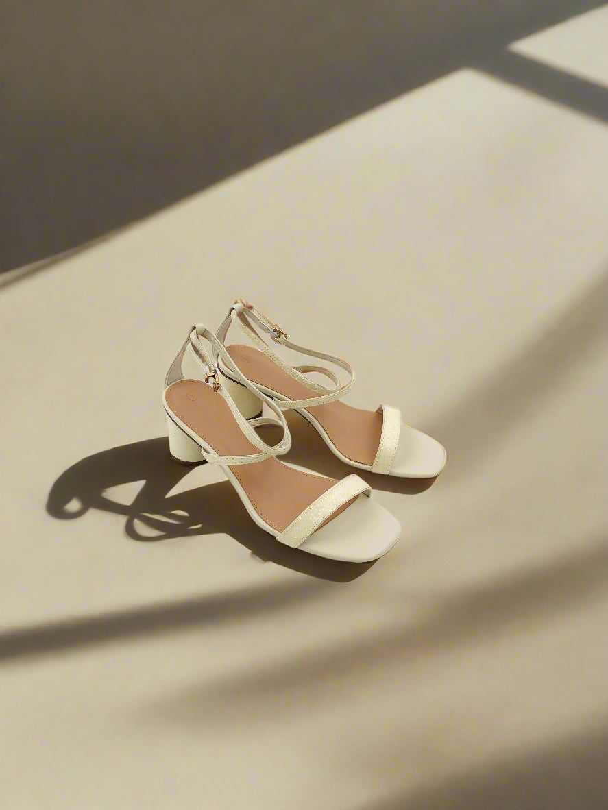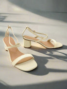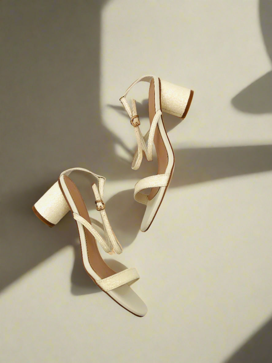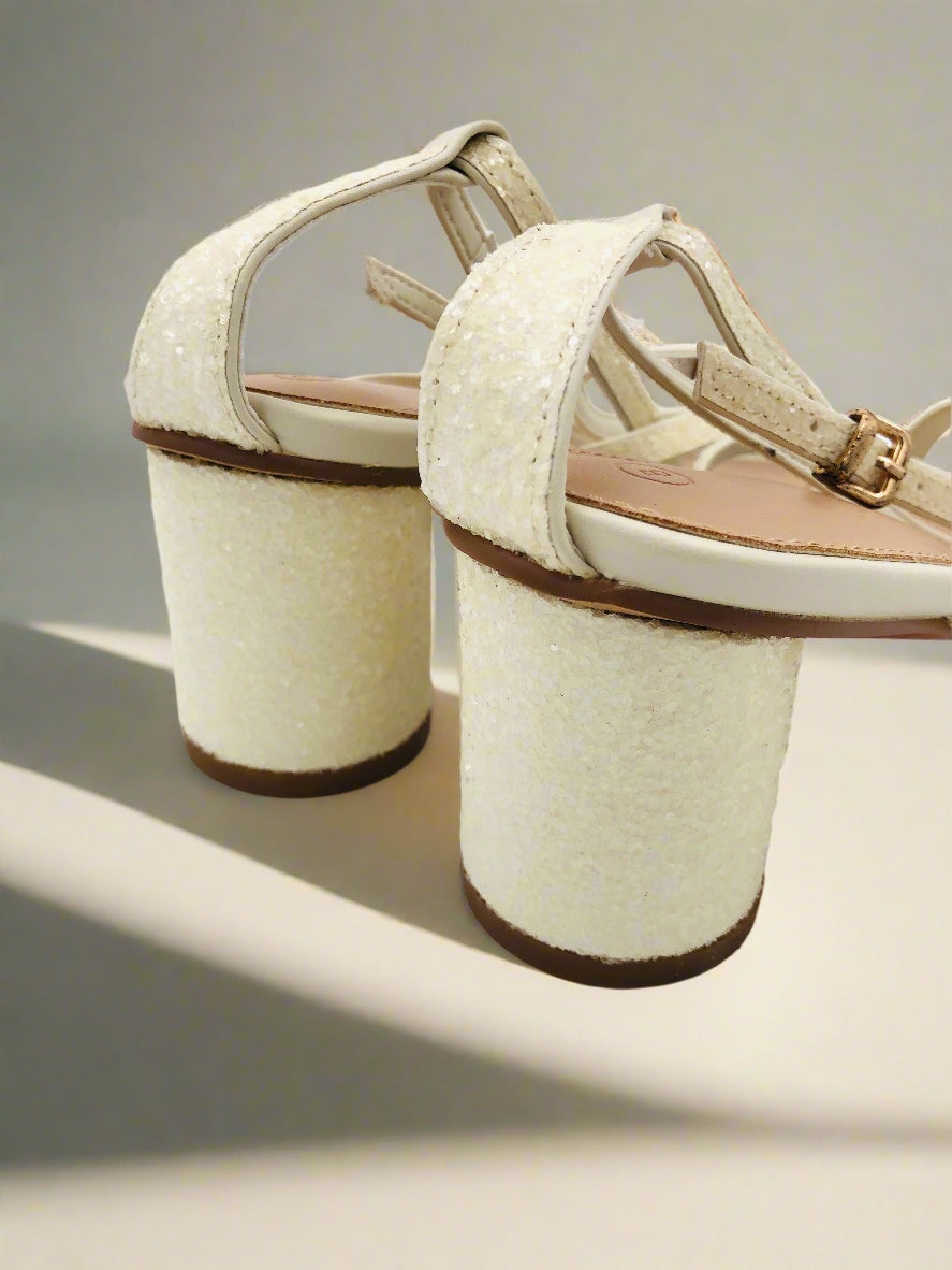 صندل أبيض بحزام قابل للتعديل وكعب منخفض سميك مع نعل مبطن للراحة. مثالية للمناسبات والإطلالات اليومية.