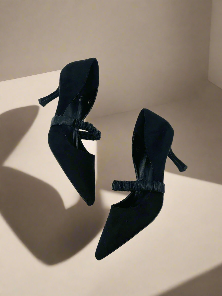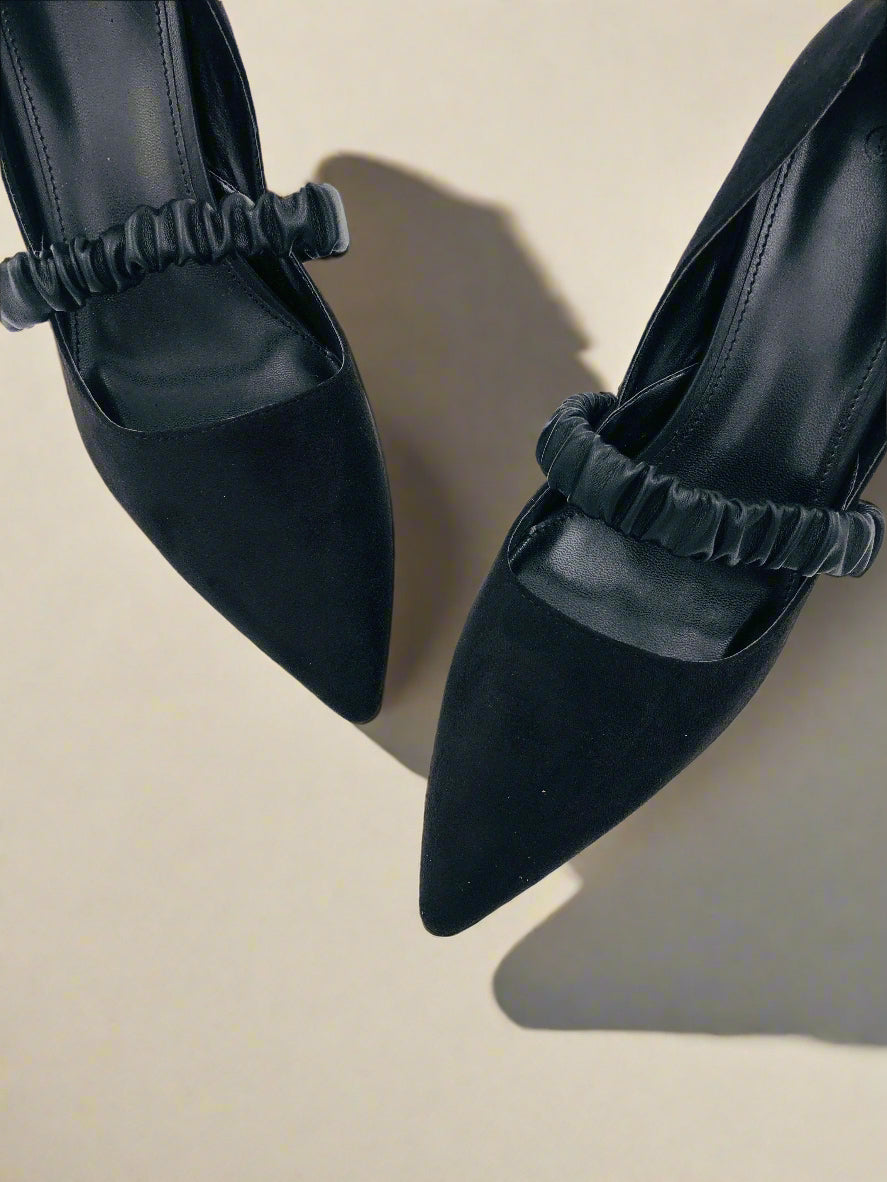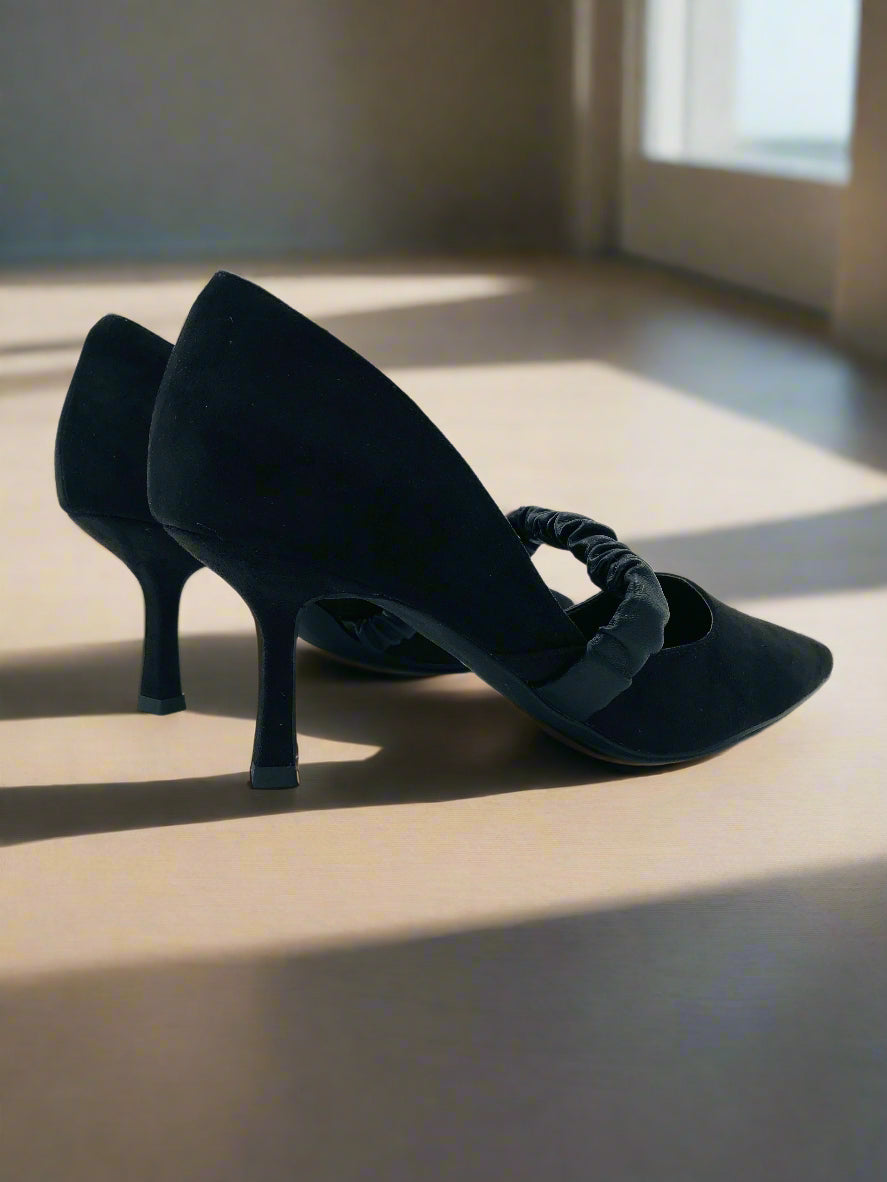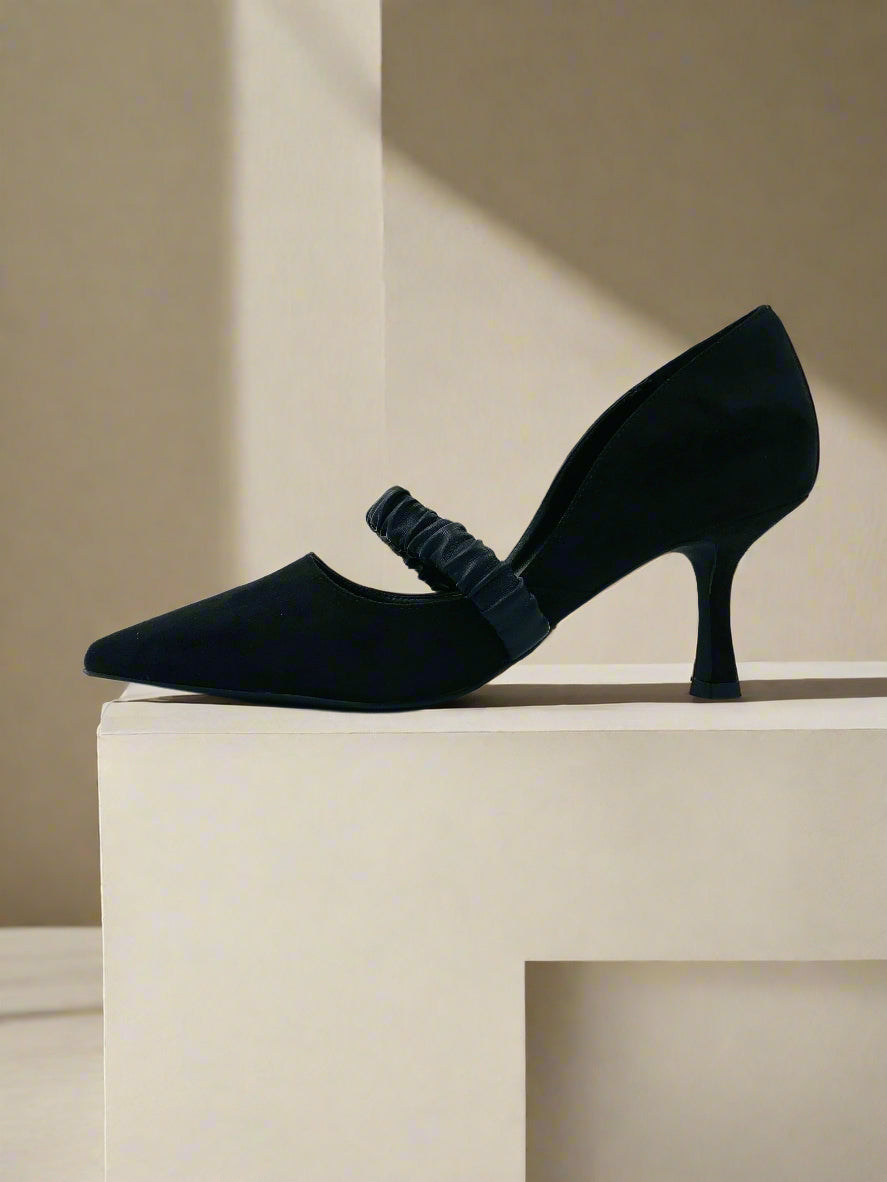 حذاء أسود بكعب متوسط مع مقدمة مدببة وحزام رقيق، تضيف لمسة من الأناقة والجاذبية لأي إطلالة.