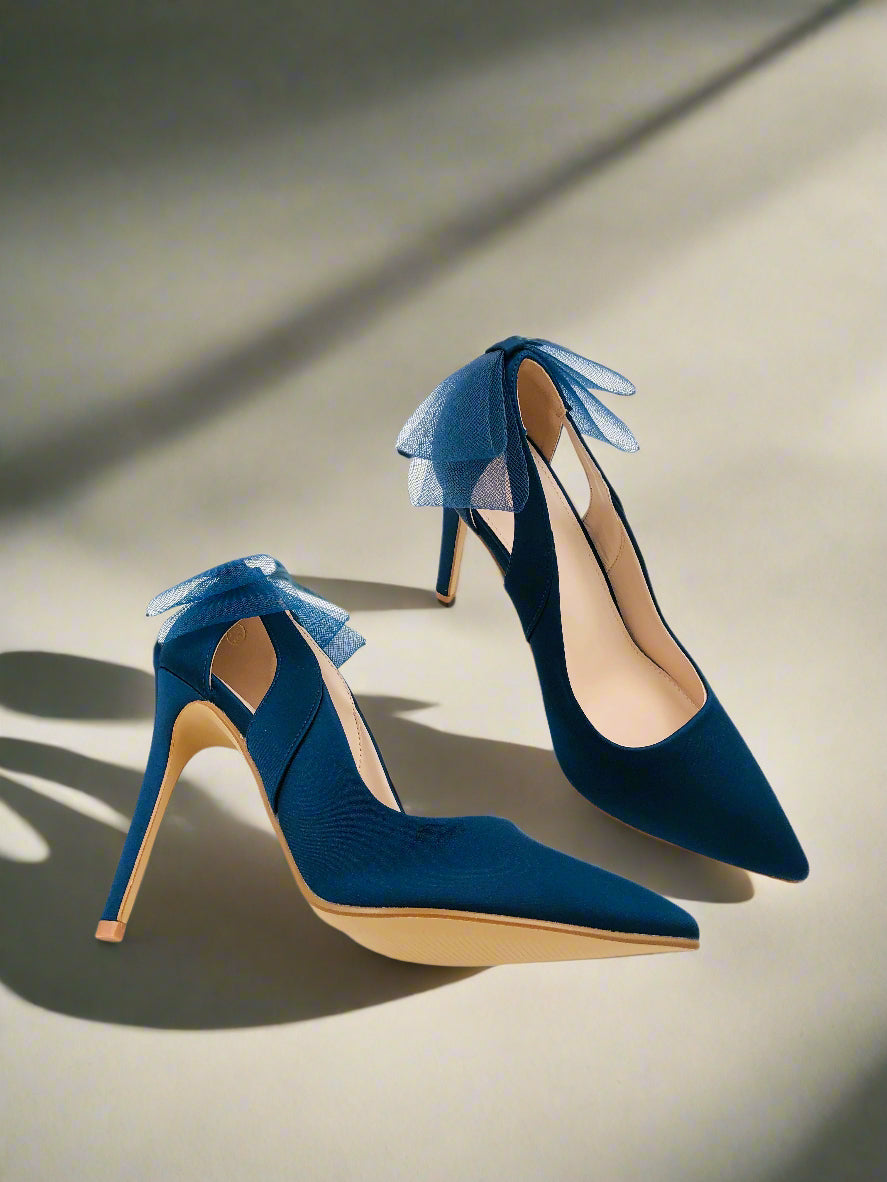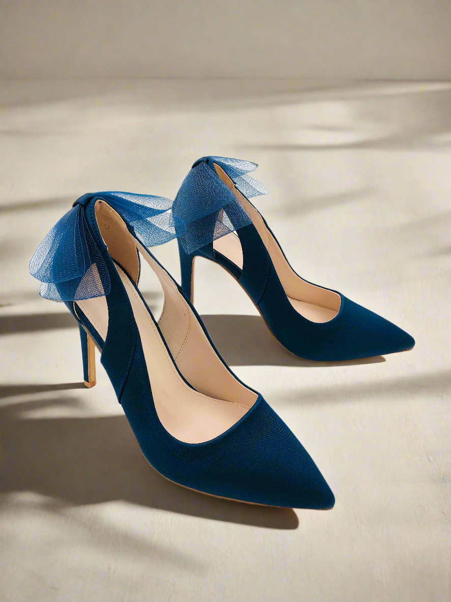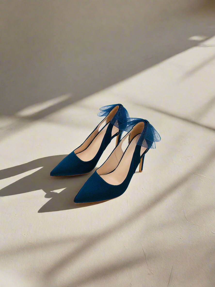 حذاء ستيليتو أنيق أزرق مدبب، اختيار مثالي للإطلالات الرسمية والحفلات، يتميز بتصميم أنيق مع فيونكة خلفية تضفي لمسة أنثوية رائعة على إطلالتك.