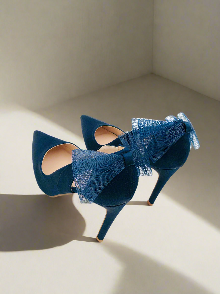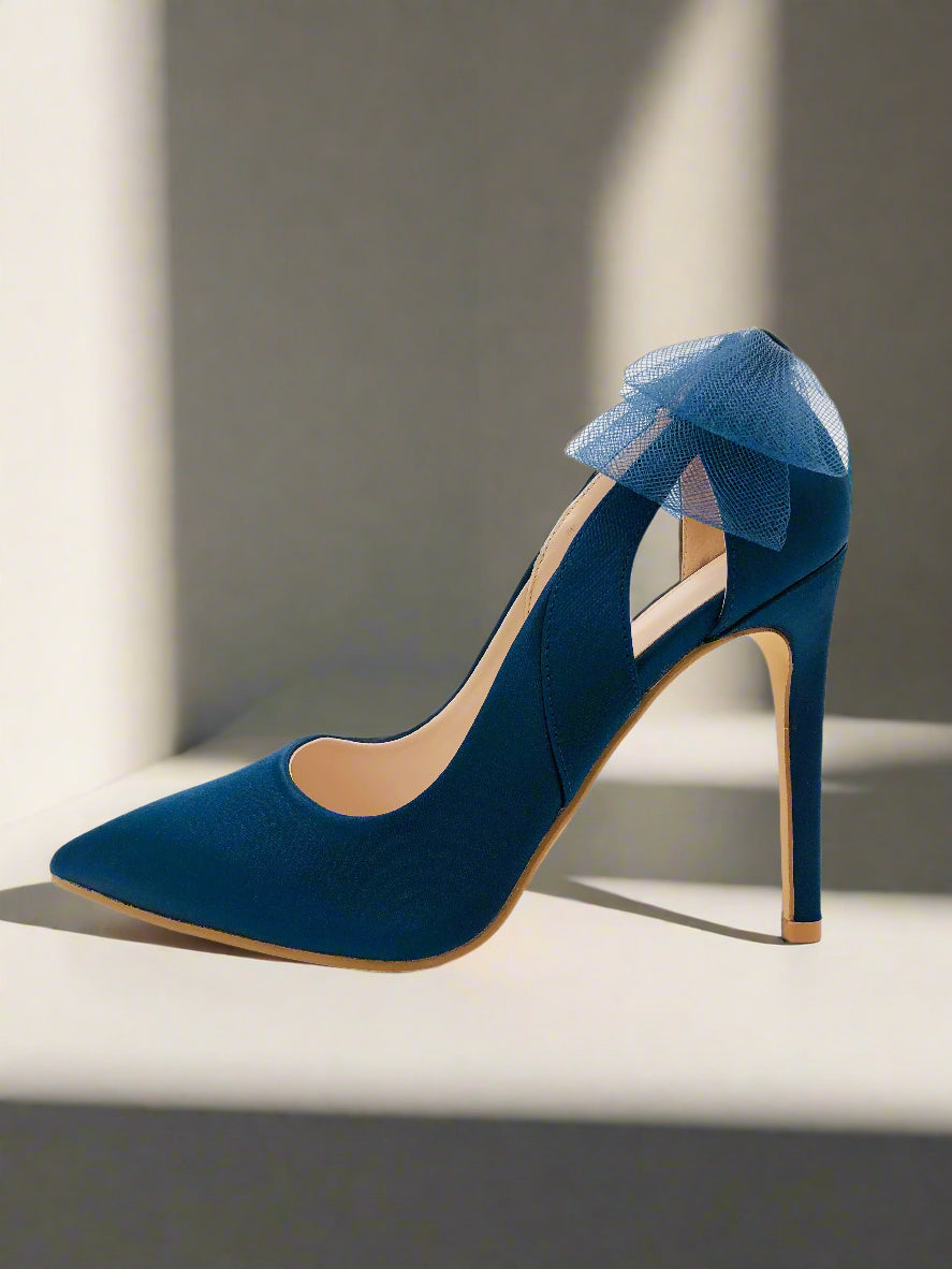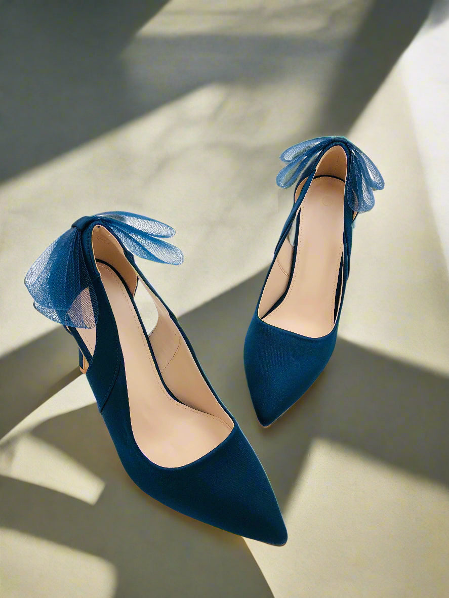 حذاء ستيليتو أنيق أزرق مدبب، اختيار مثالي للإطلالات الرسمية والحفلات، يتميز بتصميم أنيق مع فيونكة خلفية تضفي لمسة أنثوية رائعة على إطلالتك.
