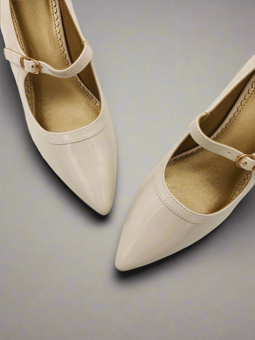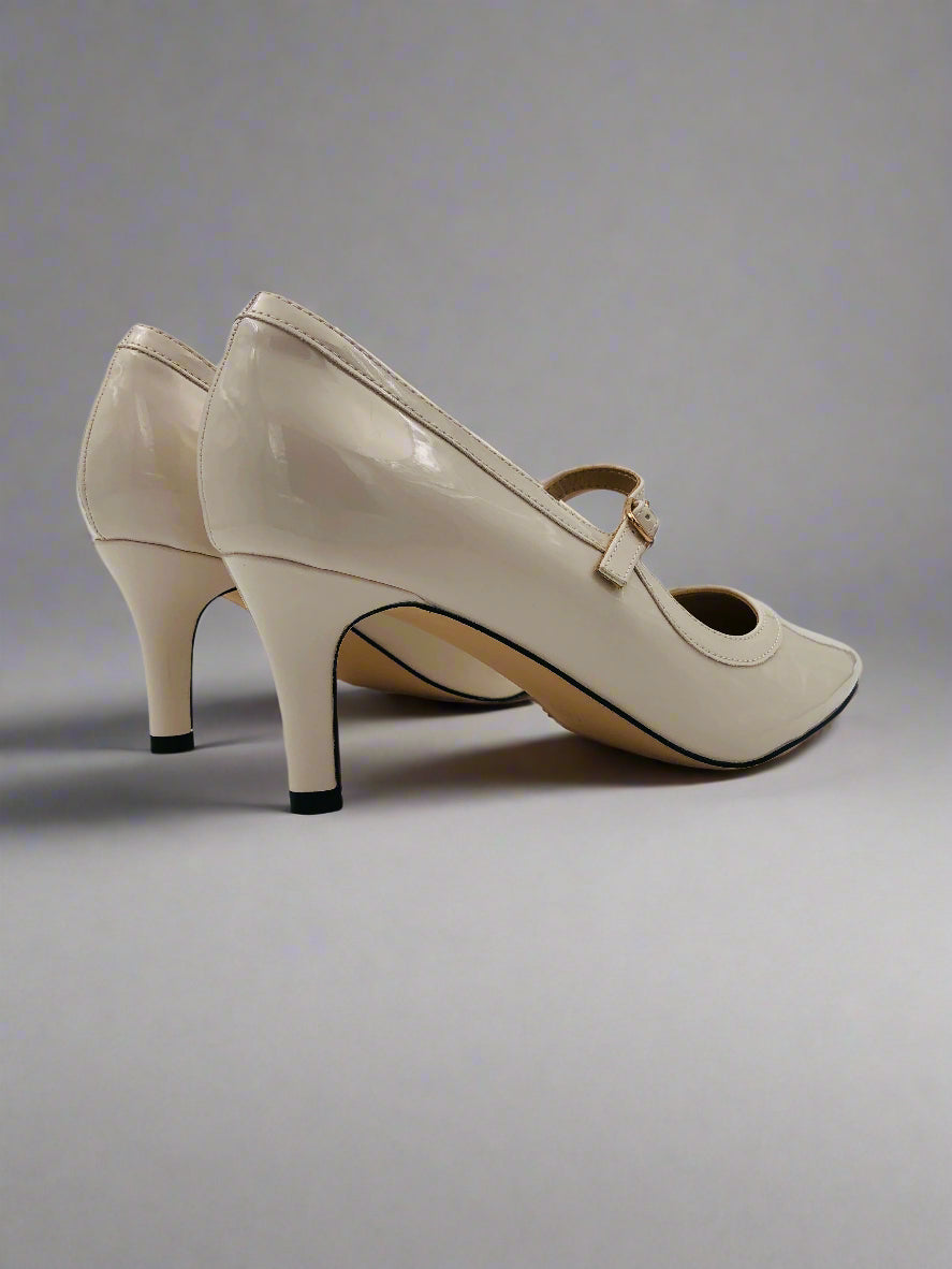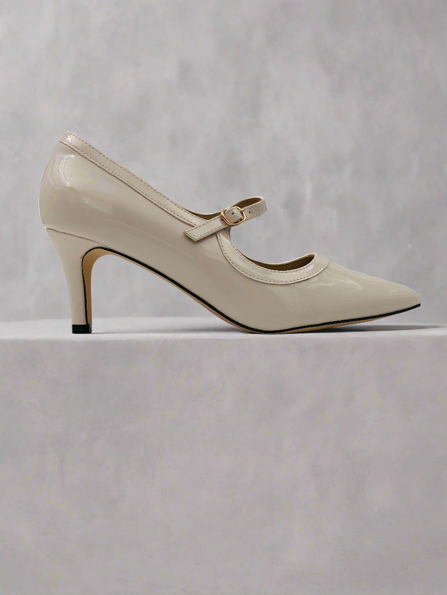 حذاء بيج بكعب متوسط الارتفاع ذو طرف مدبب وحزام رقيق قابل للتعديل، يضيف لمسة من الأناقة والسحر لأي إطلالة.