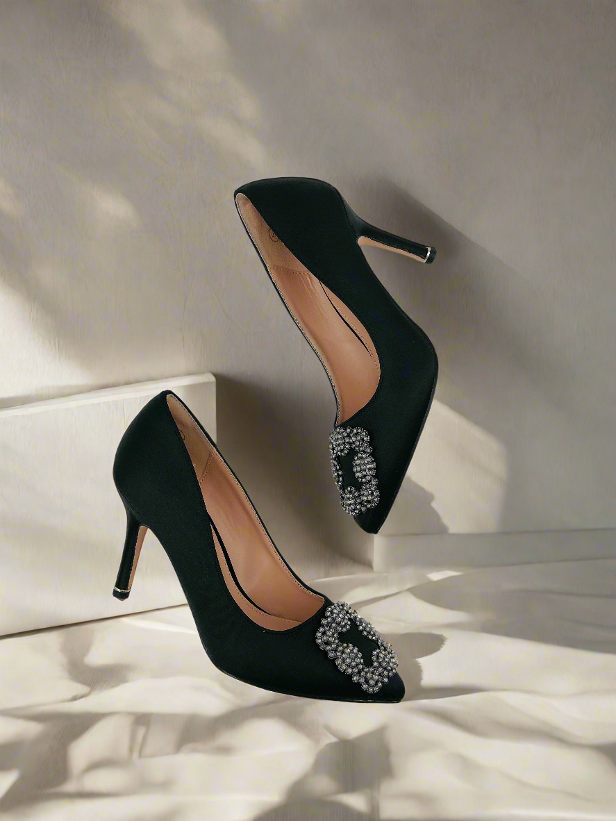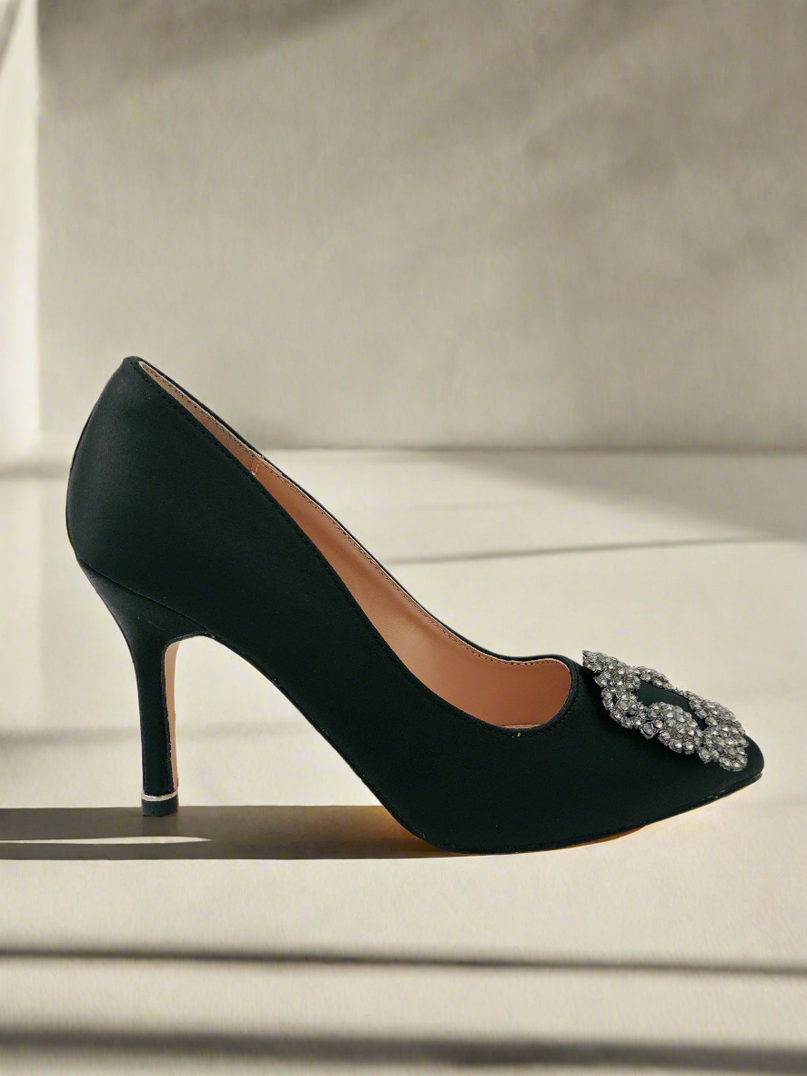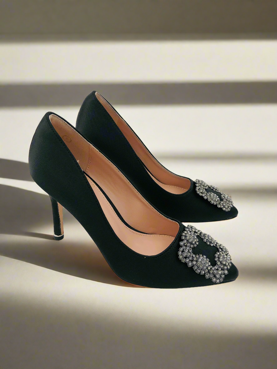 حذاء ستيليتو أسود بكعب رفيع ومقدمة مدببة، مزود بمشبك مربع فضي من الأمام وعناصر تزيينية صغيرة. يتميز بتصميم أنيق وفاخر، مما يجعله الخيار المثالي للحفلات والسهرات.