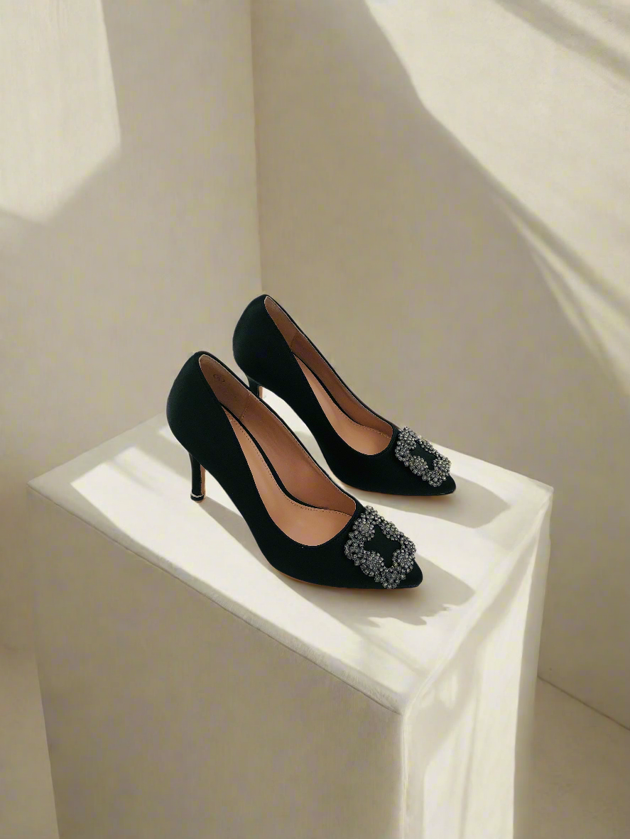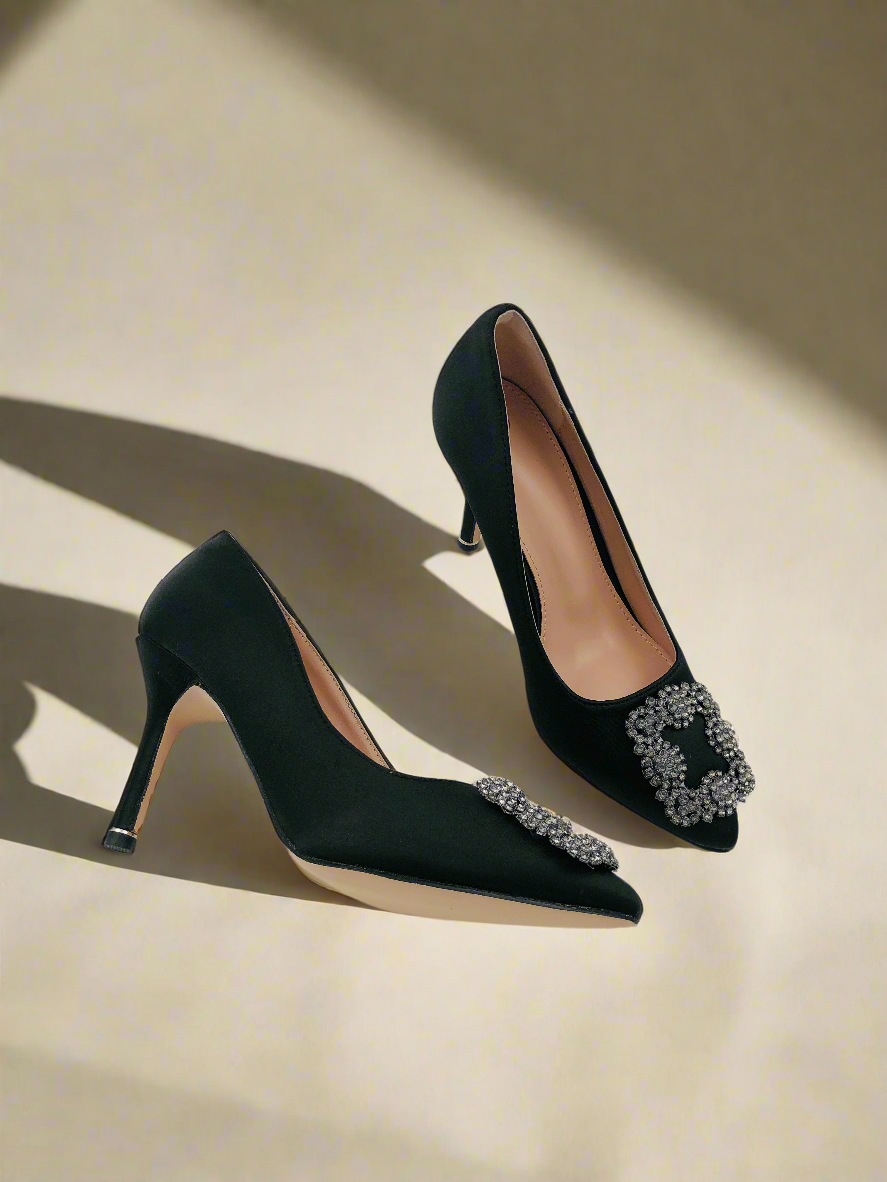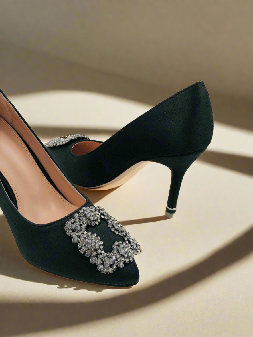 حذاء ستيليتو أسود بكعب رفيع ومقدمة مدببة، مزود بمشبك مربع فضي من الأمام وعناصر تزيينية صغيرة. يتميز بتصميم أنيق وفاخر، مما يجعله الخيار المثالي للحفلات والسهرات.