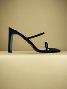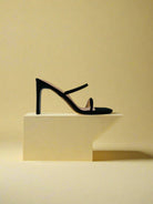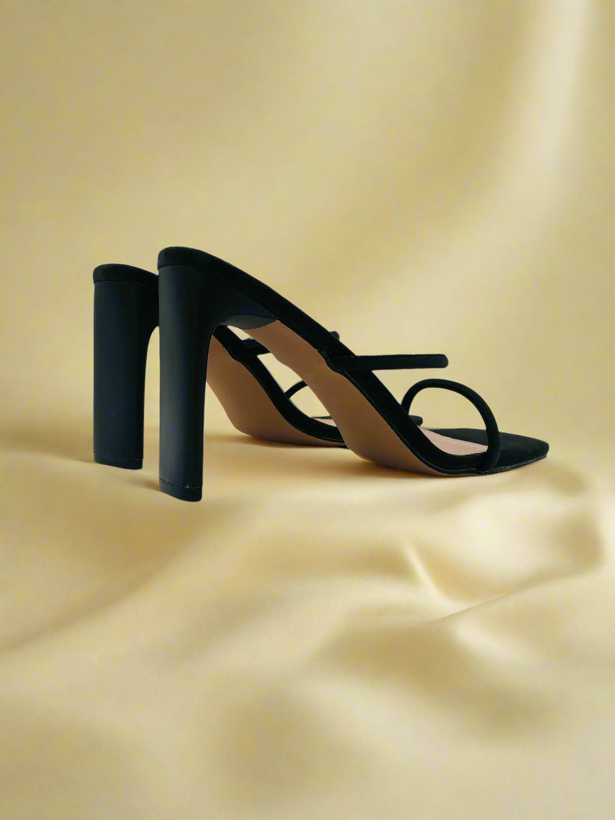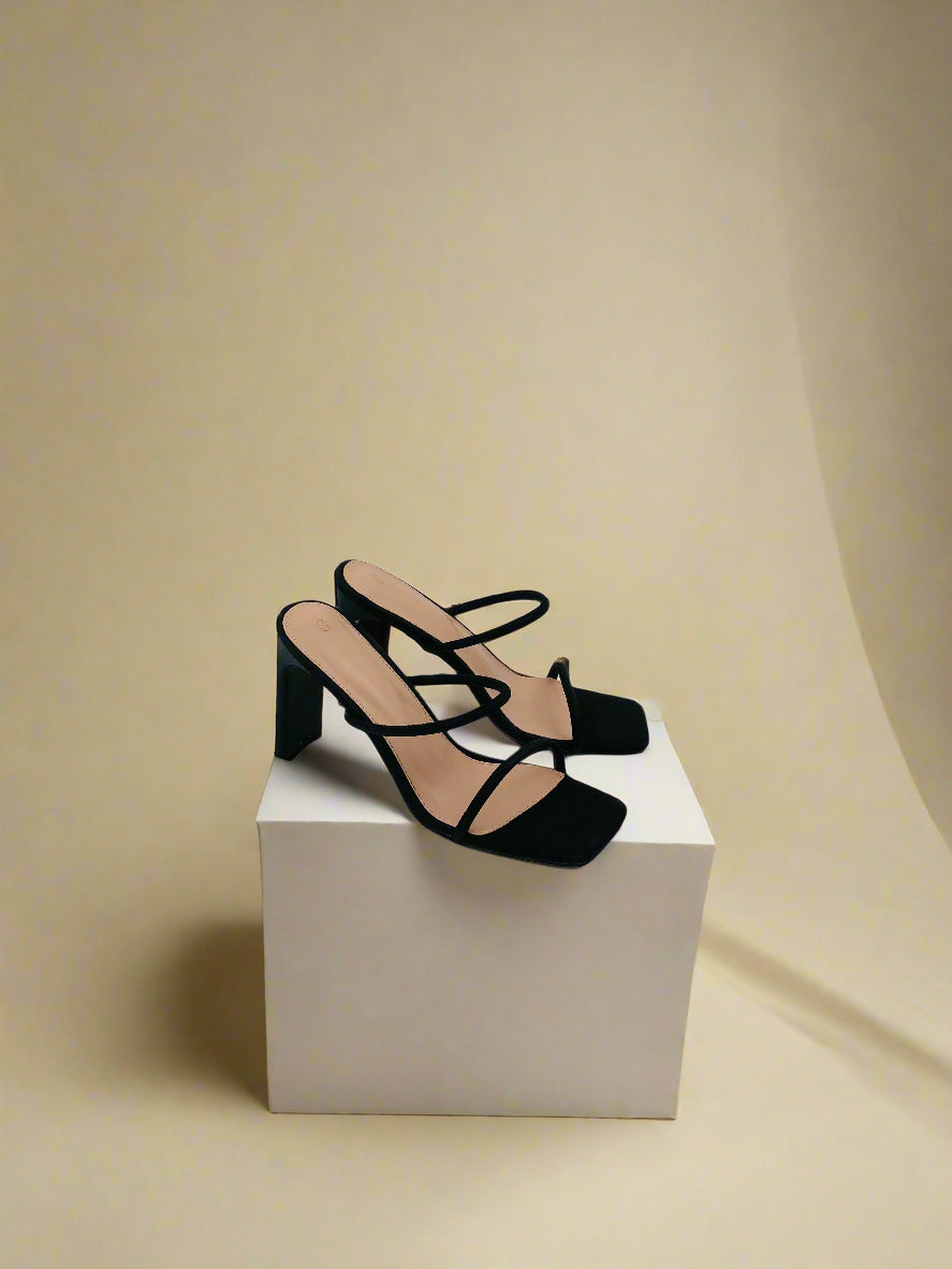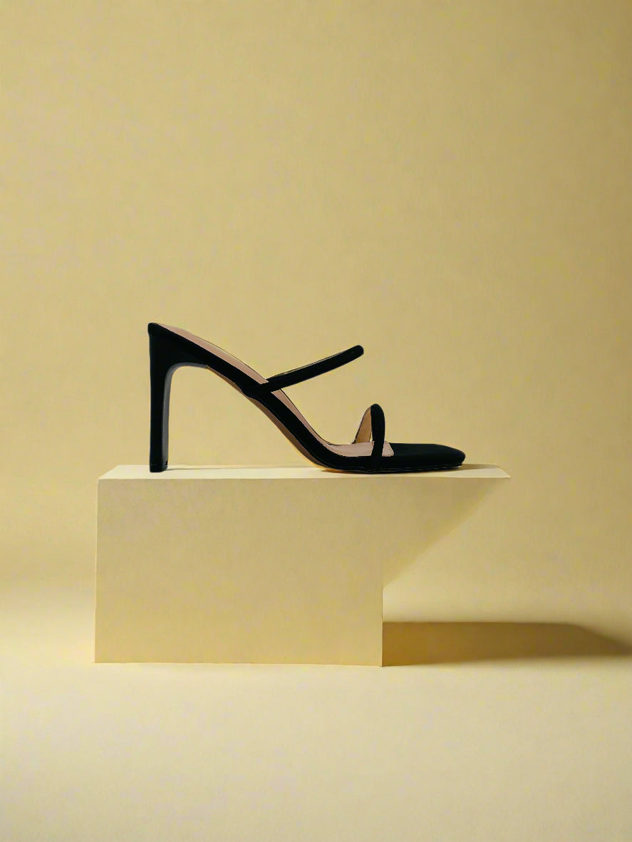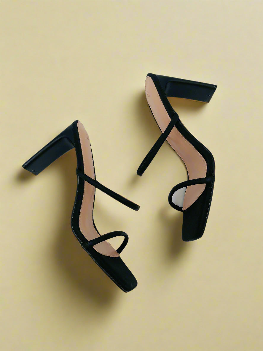 صندل أسود بكعب عالٍ بتصميم بسيط وأنيق، مع حزام رفيع، مما يضفي لمسة من الرقي والأنوثة.