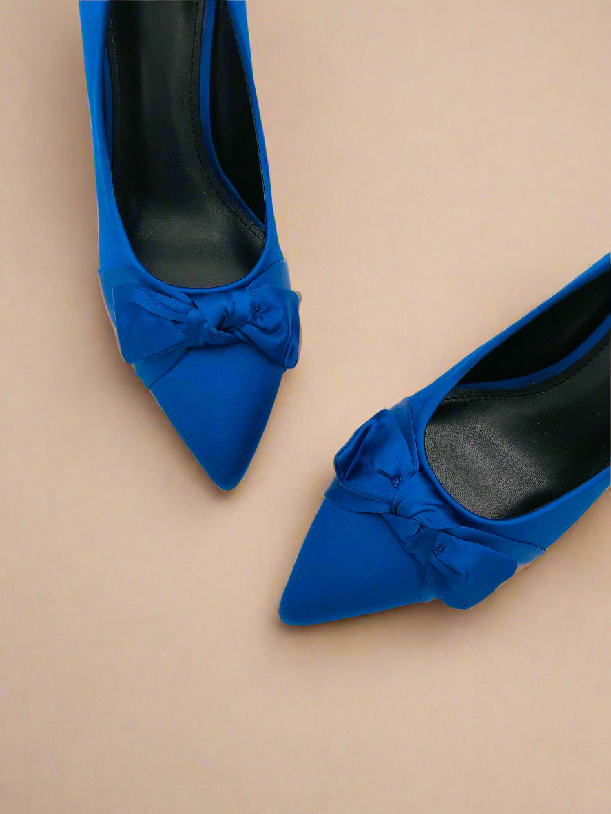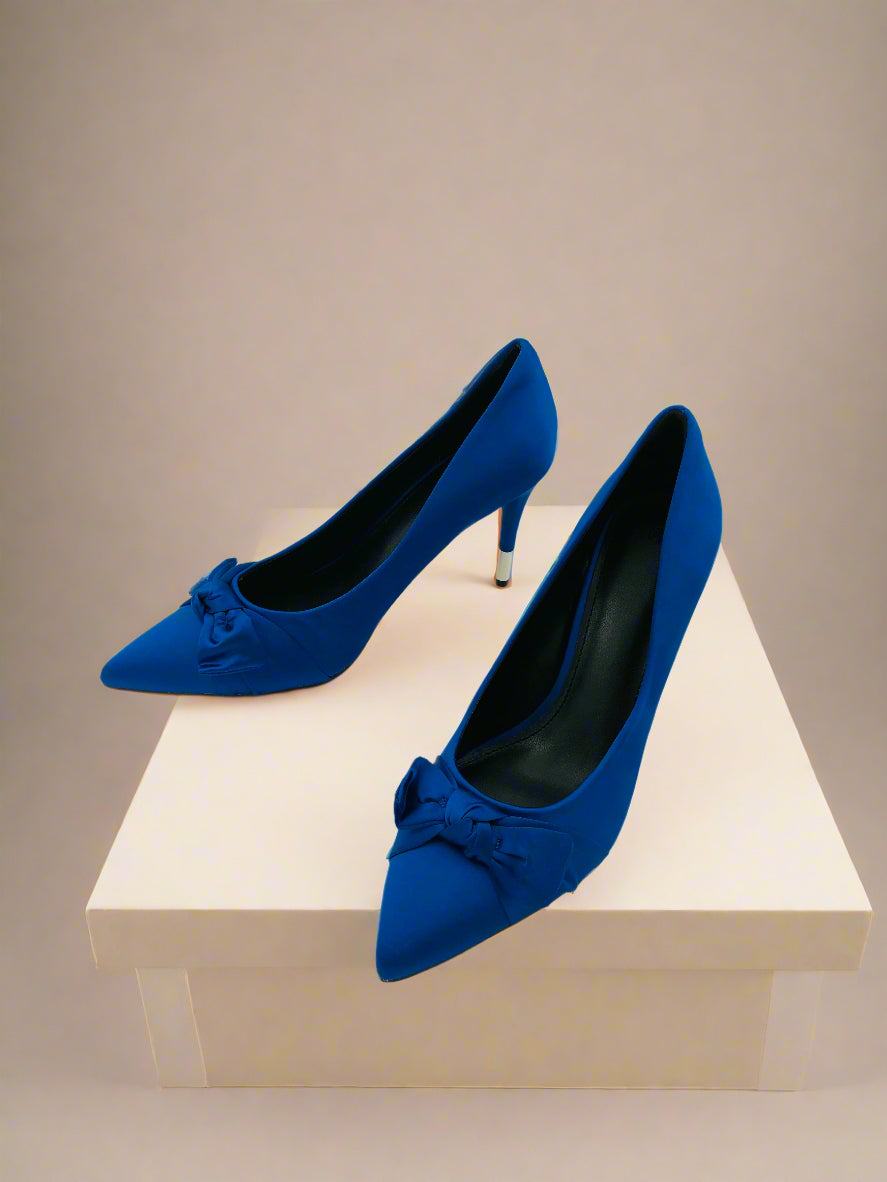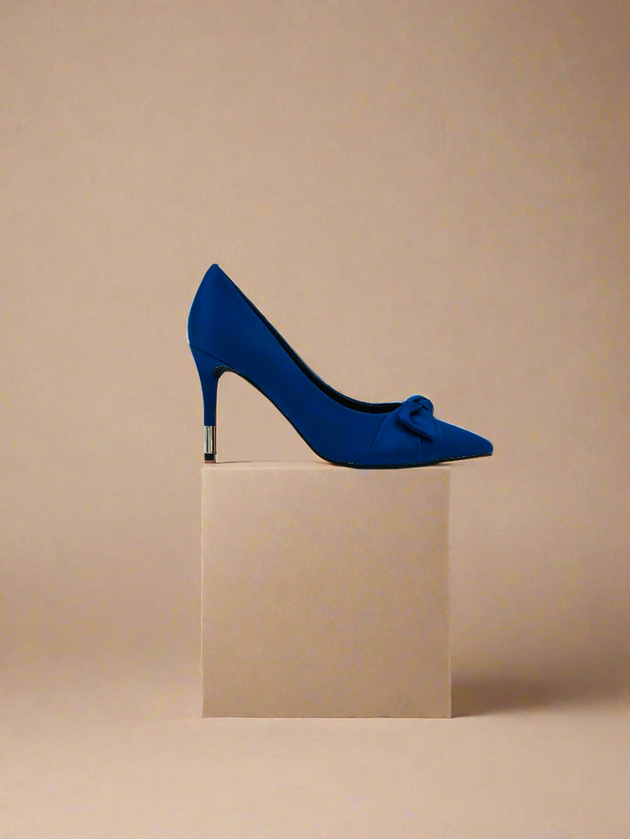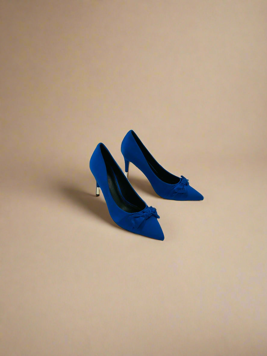 حذاء ستليتو أزرق مدبب، مصمم لمظهر أنيق وأنثوي. يتميز بكعب عالٍ وفيونكة صغيرة في المقدمة، مما يضيف لمسة من السحر.