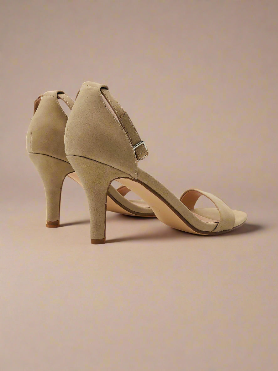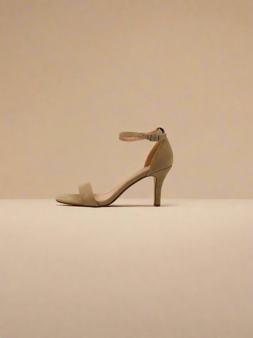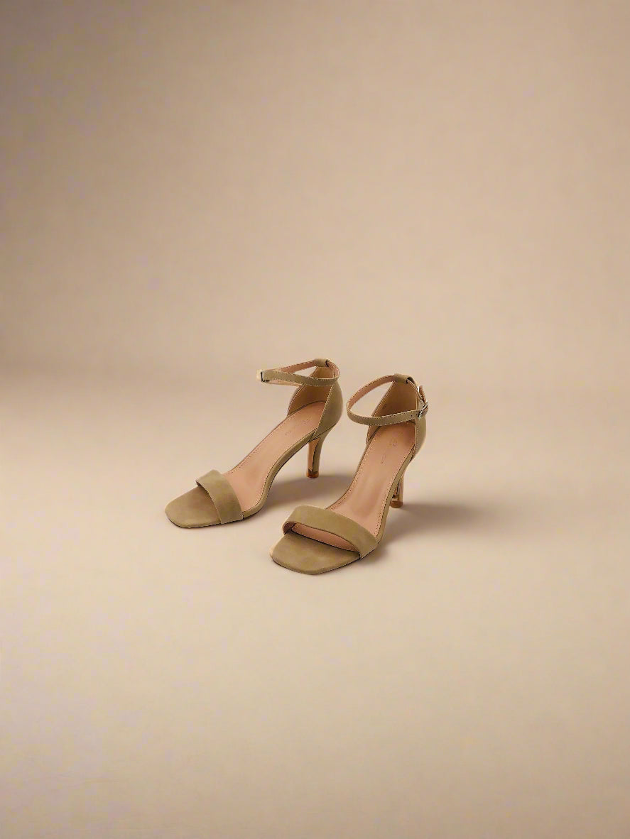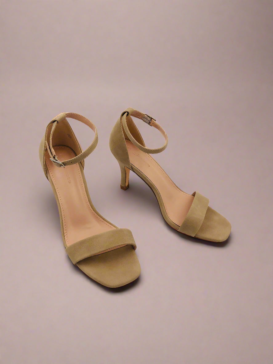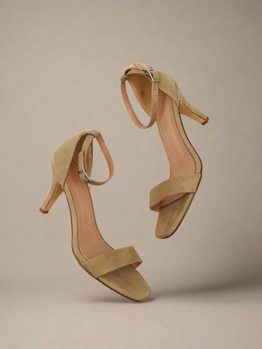 صندل كاكي بمقدمة مربعة وكعب متوسط الارتفاع وحزام قابل للتعديل عند الكاحل للنساء. مثالي لجميع المناسبات.