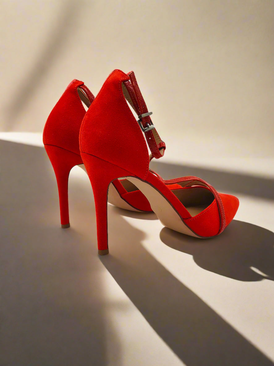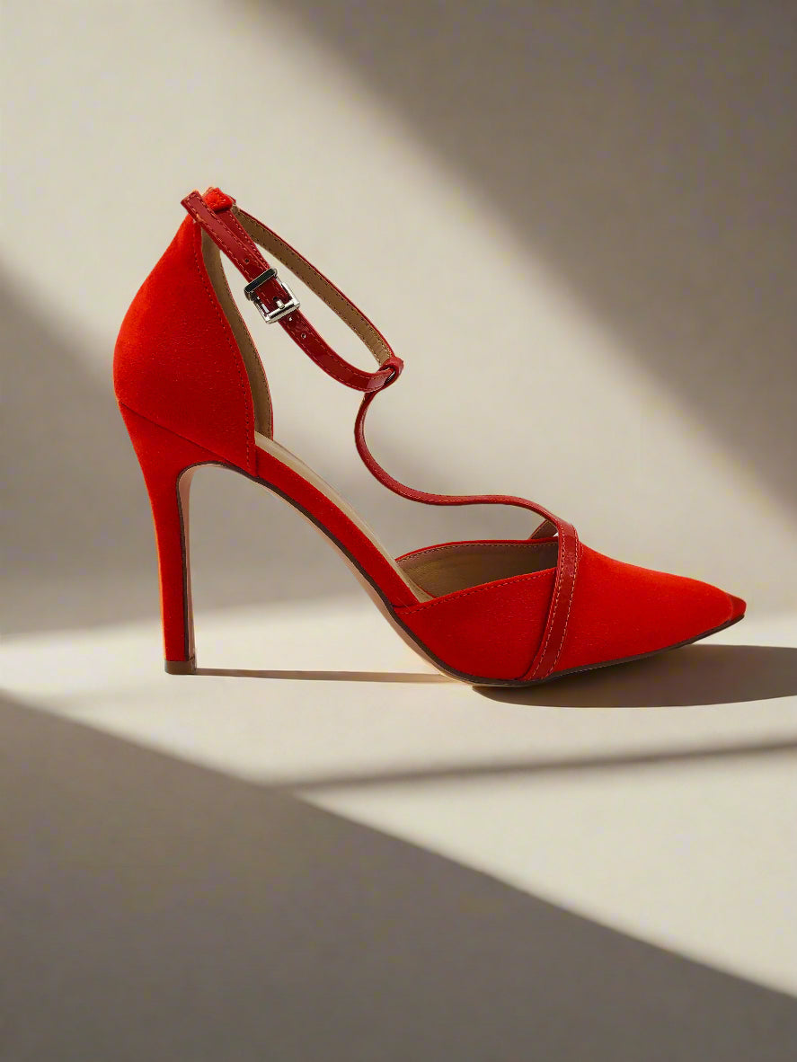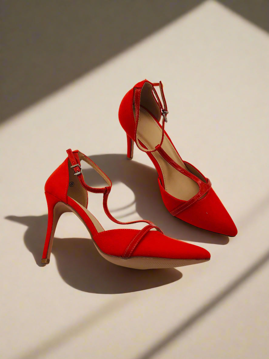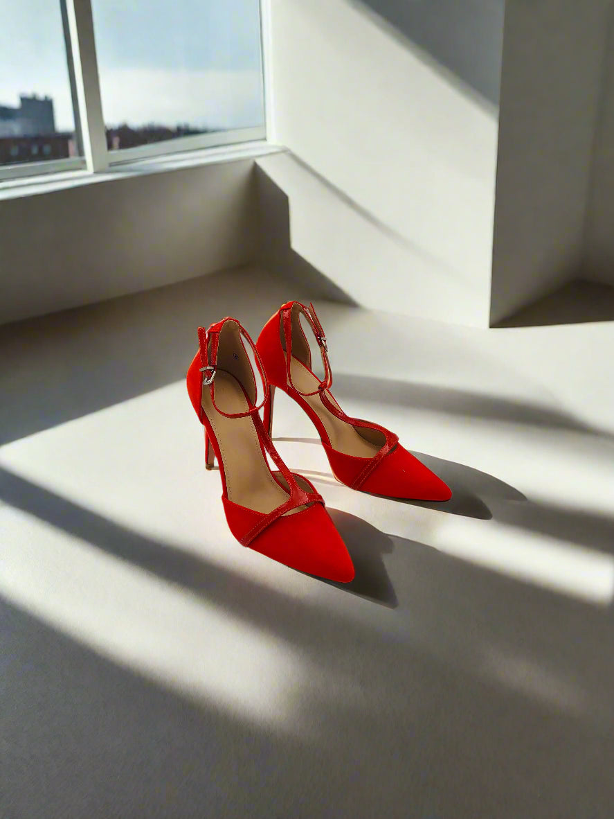 حذاء ستيليتو أحمر مخملي بكعب عالي ومقدمة مدببة، مزود بحزام رفيع قابل للتعديل حول الكاحل، ليمنحك إطلالة أنيقة ومريحة.