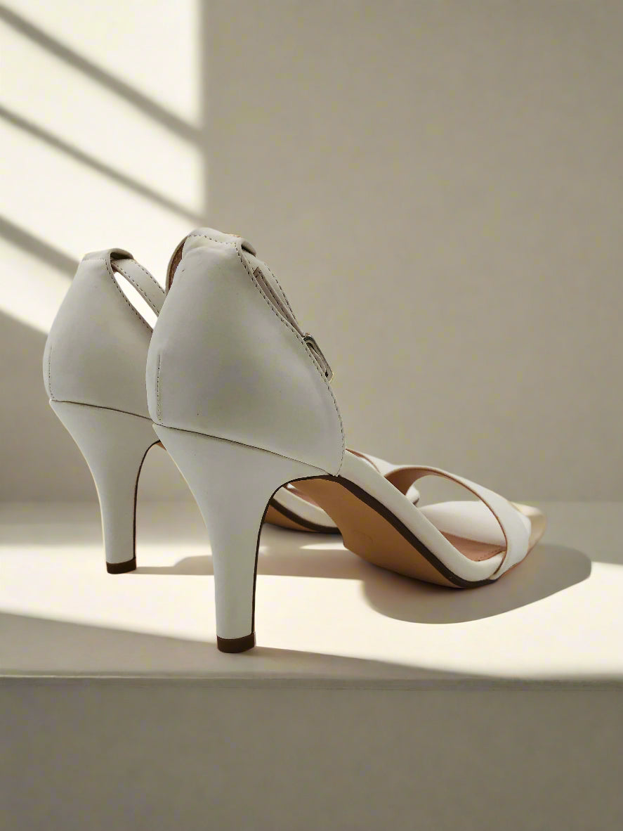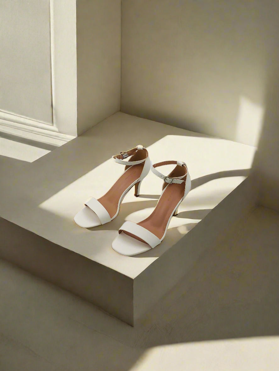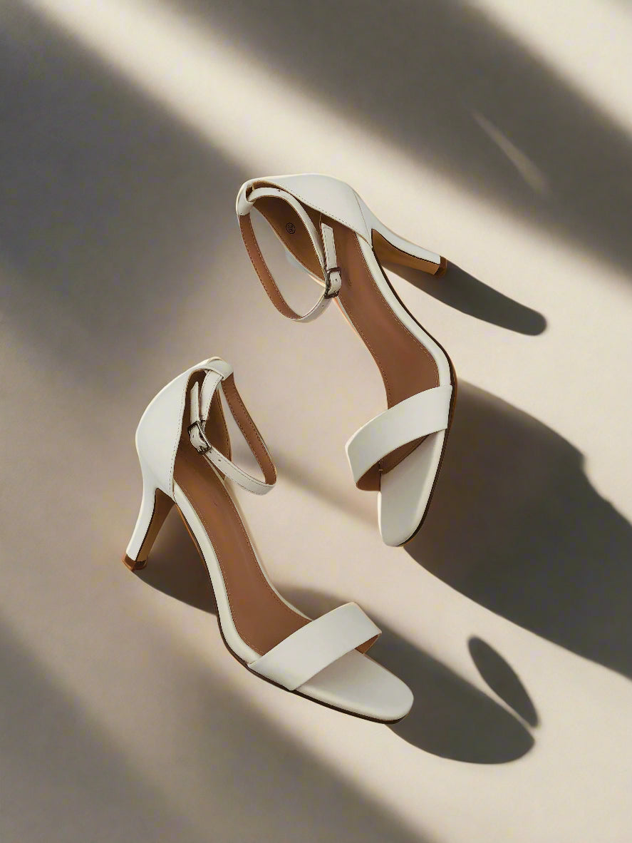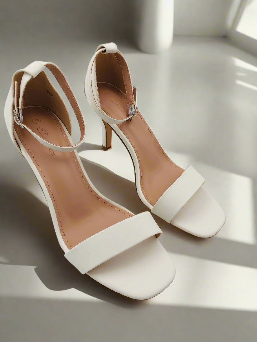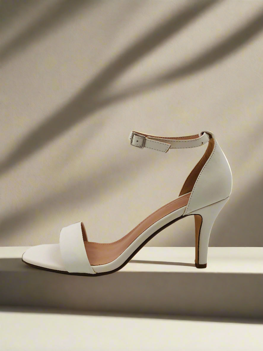 صندل أبيض بمقدمة مربعة وكعب متوسط الارتفاع وحزام قابل للتعديل عند الكاحل للنساء. مثالي لجميع المناسبات.