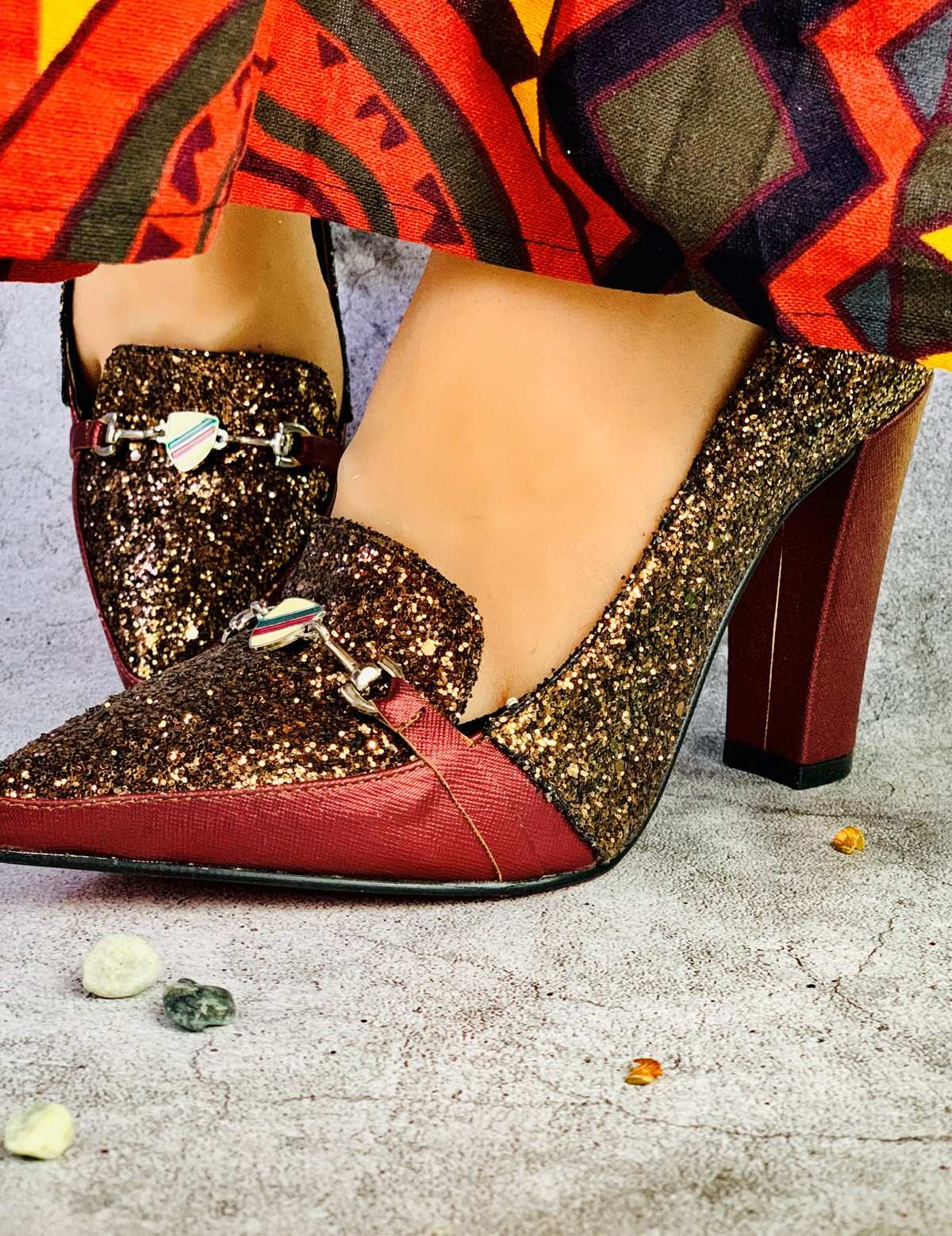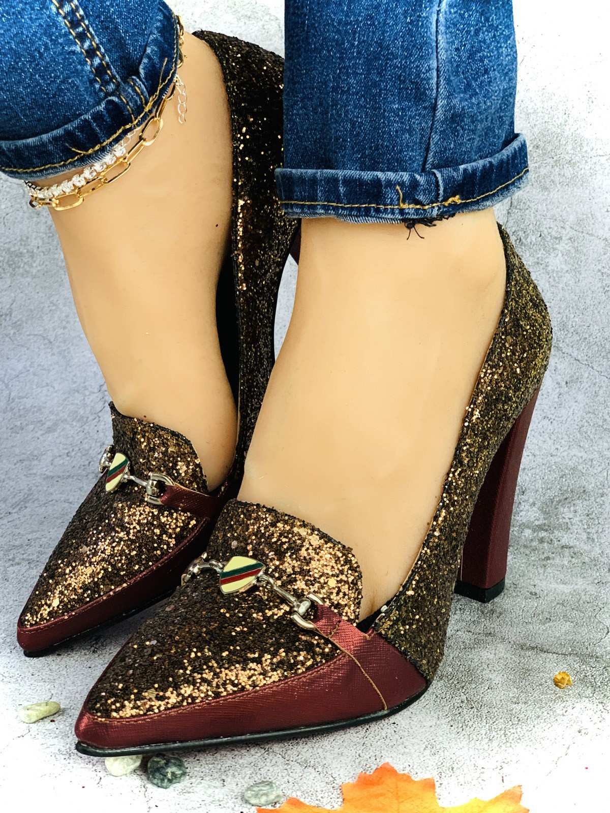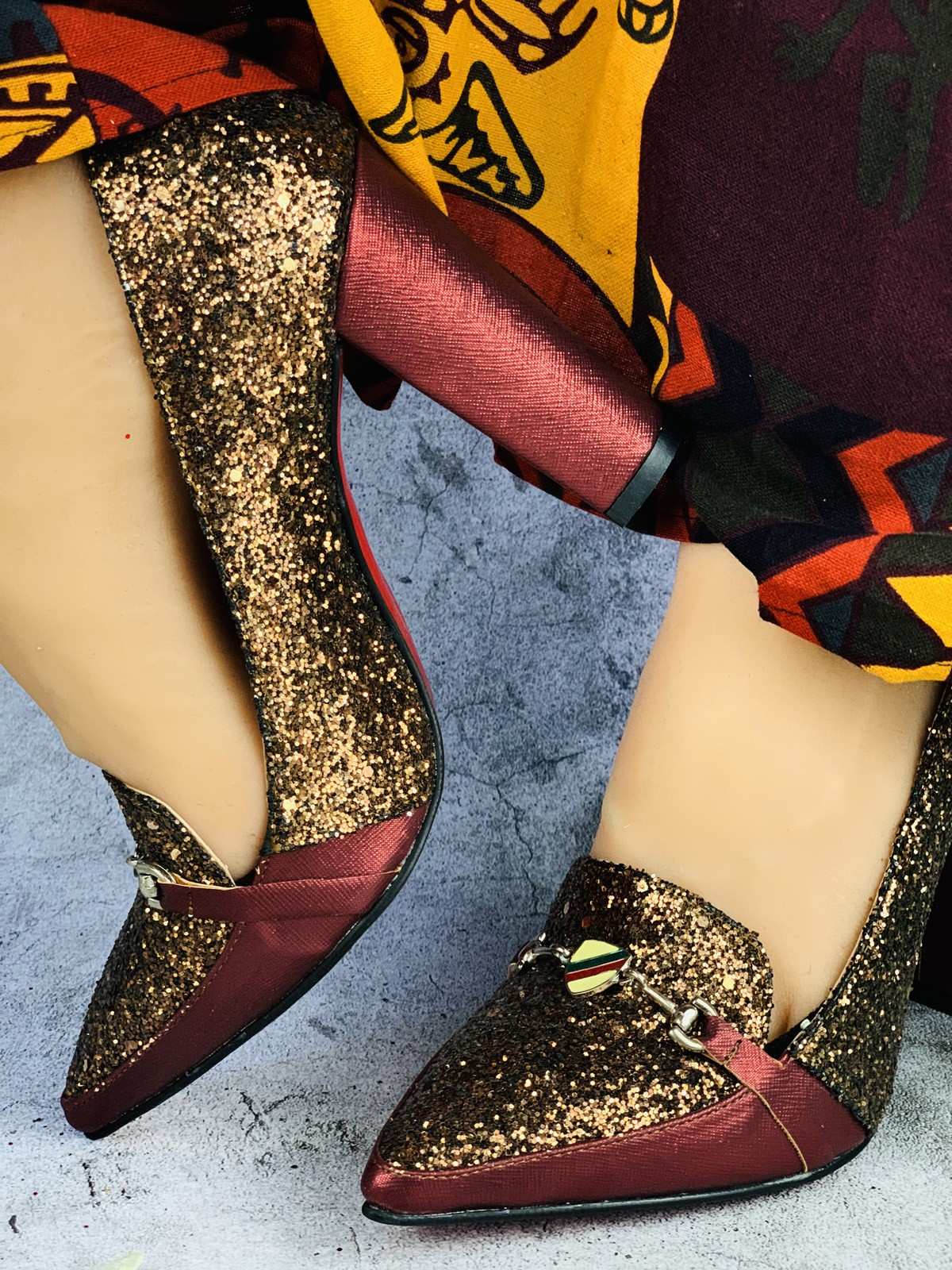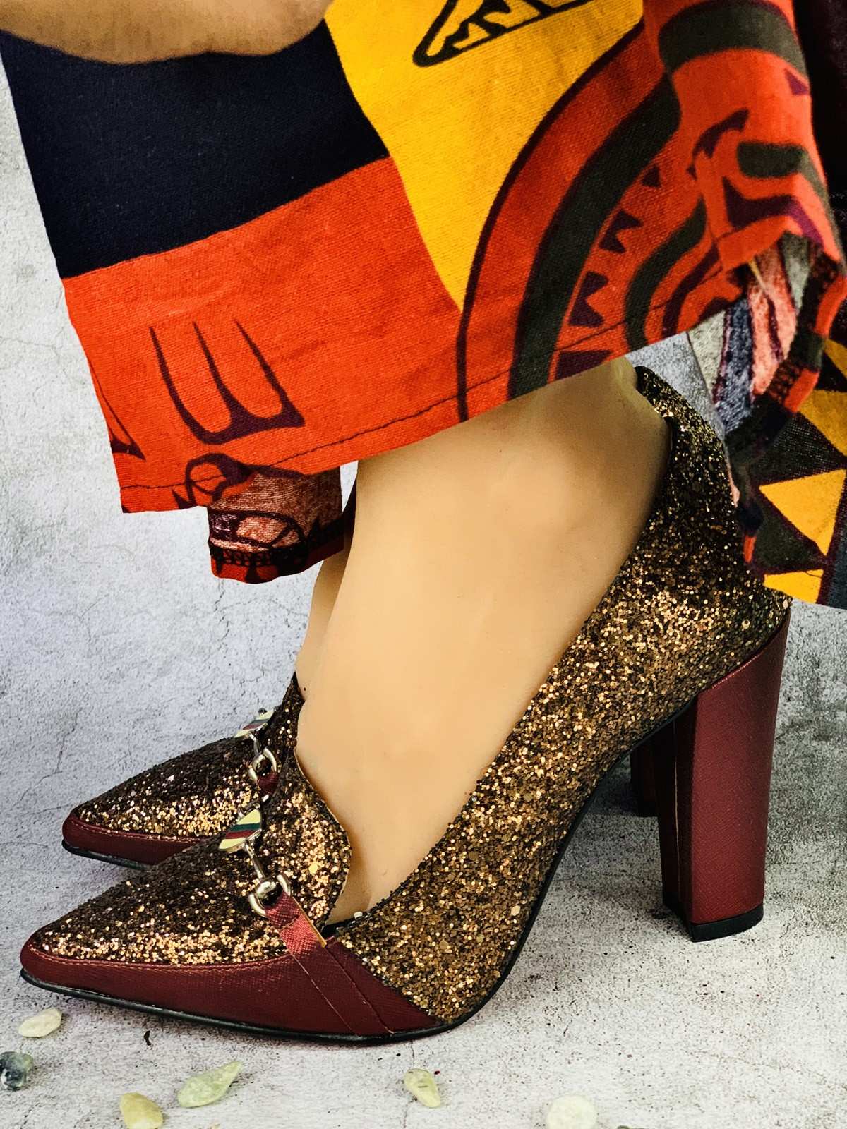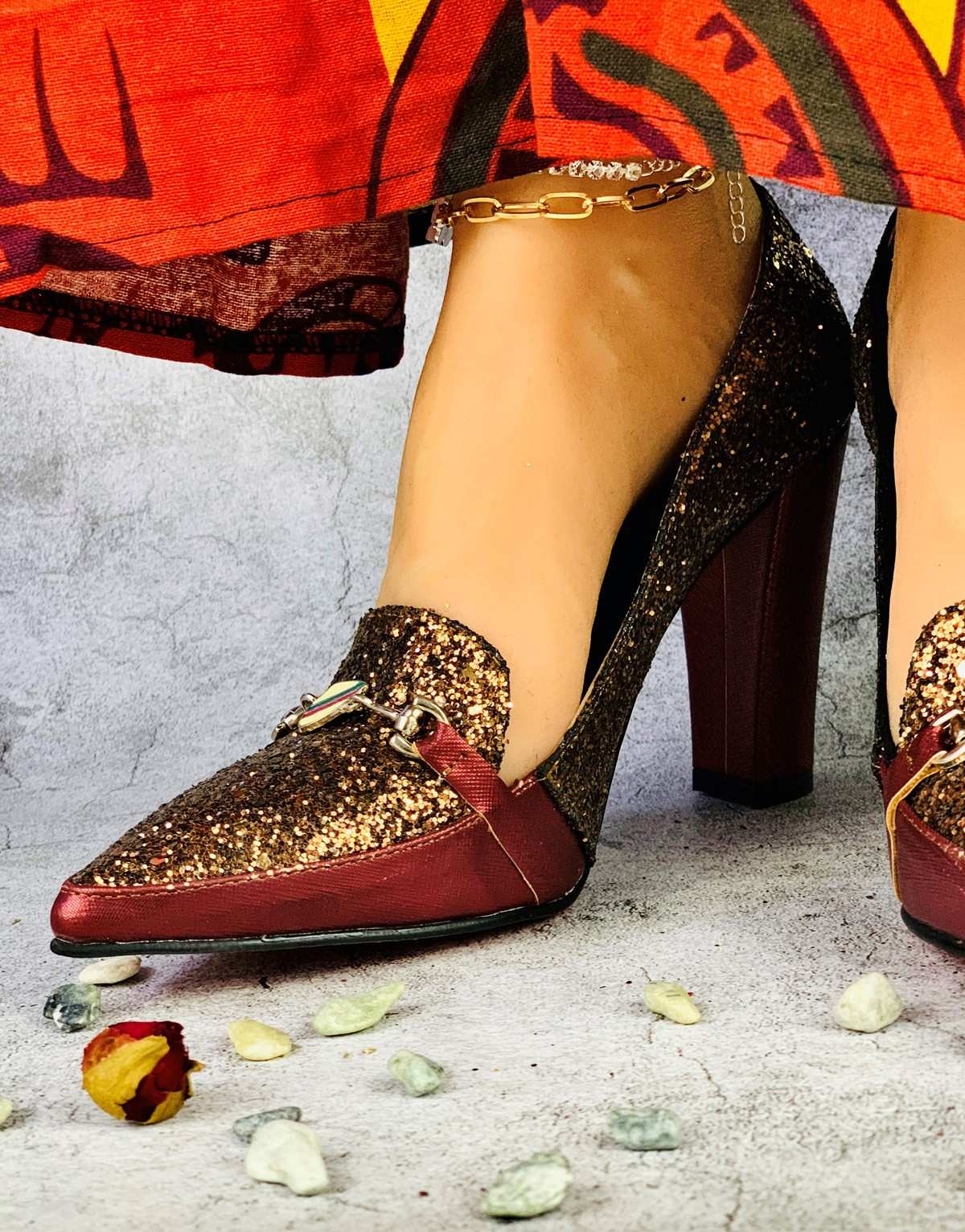حذاء نسائي للمناسبات كعب عالي ذهبي وأحمر لامع