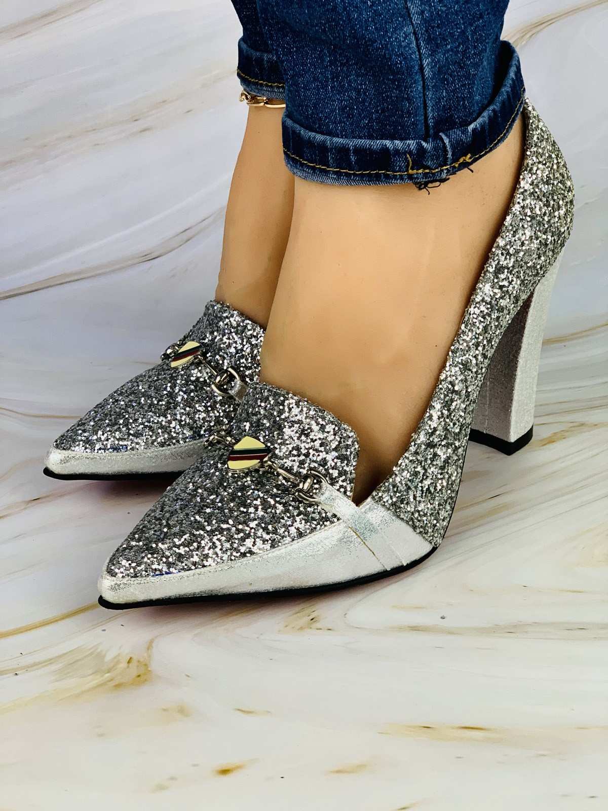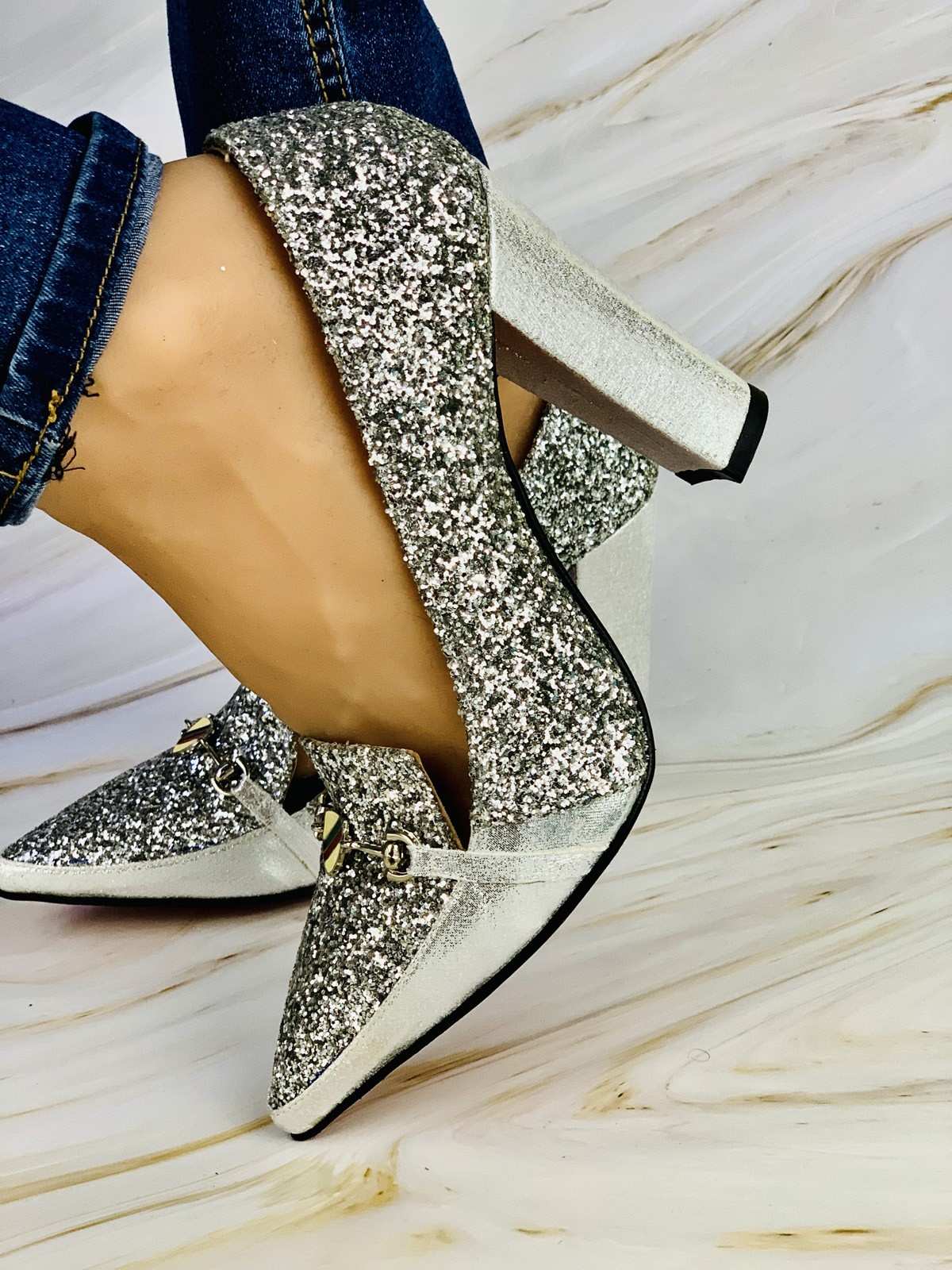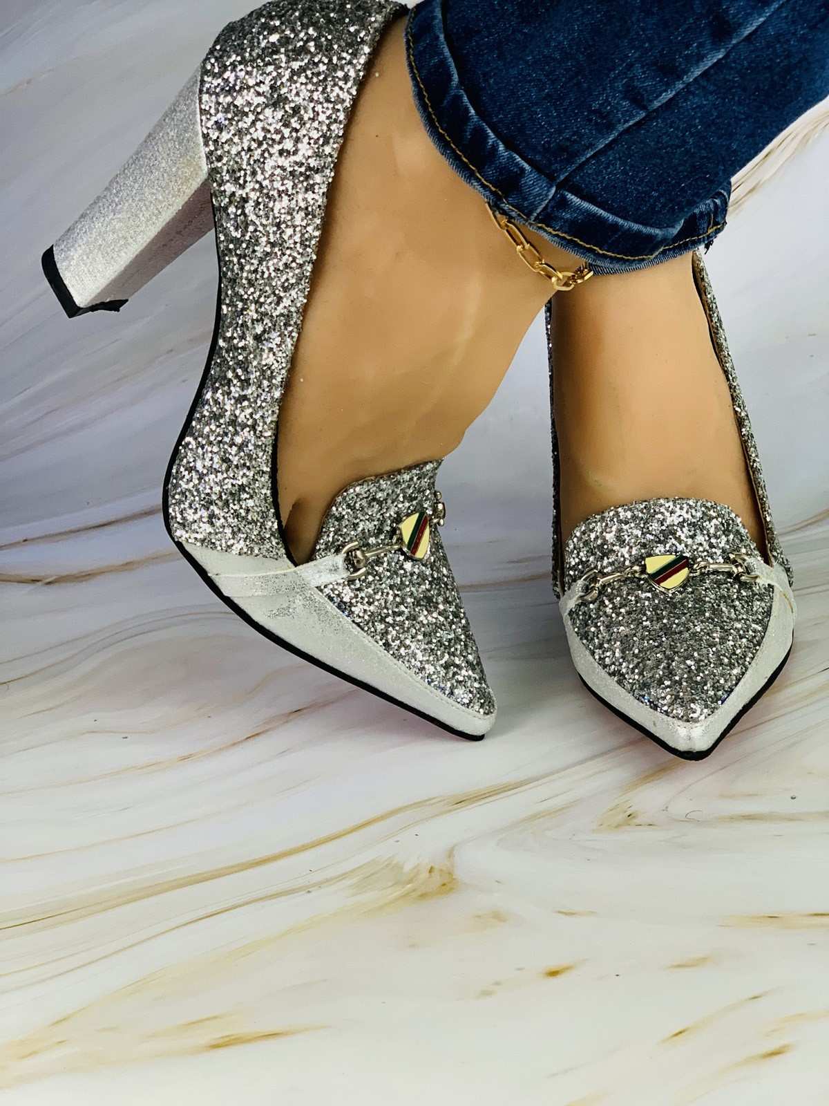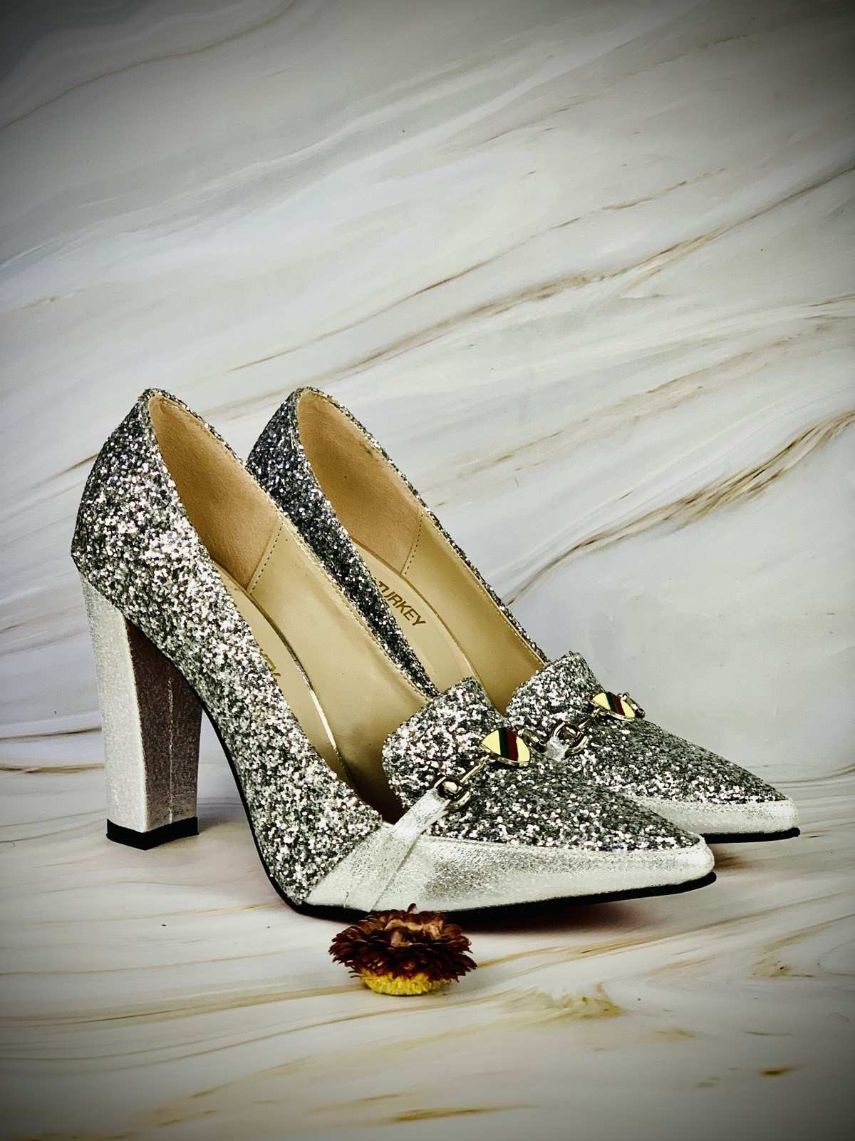 حذاء نسائي بكعب عالي فضي لامع للمناسبات
