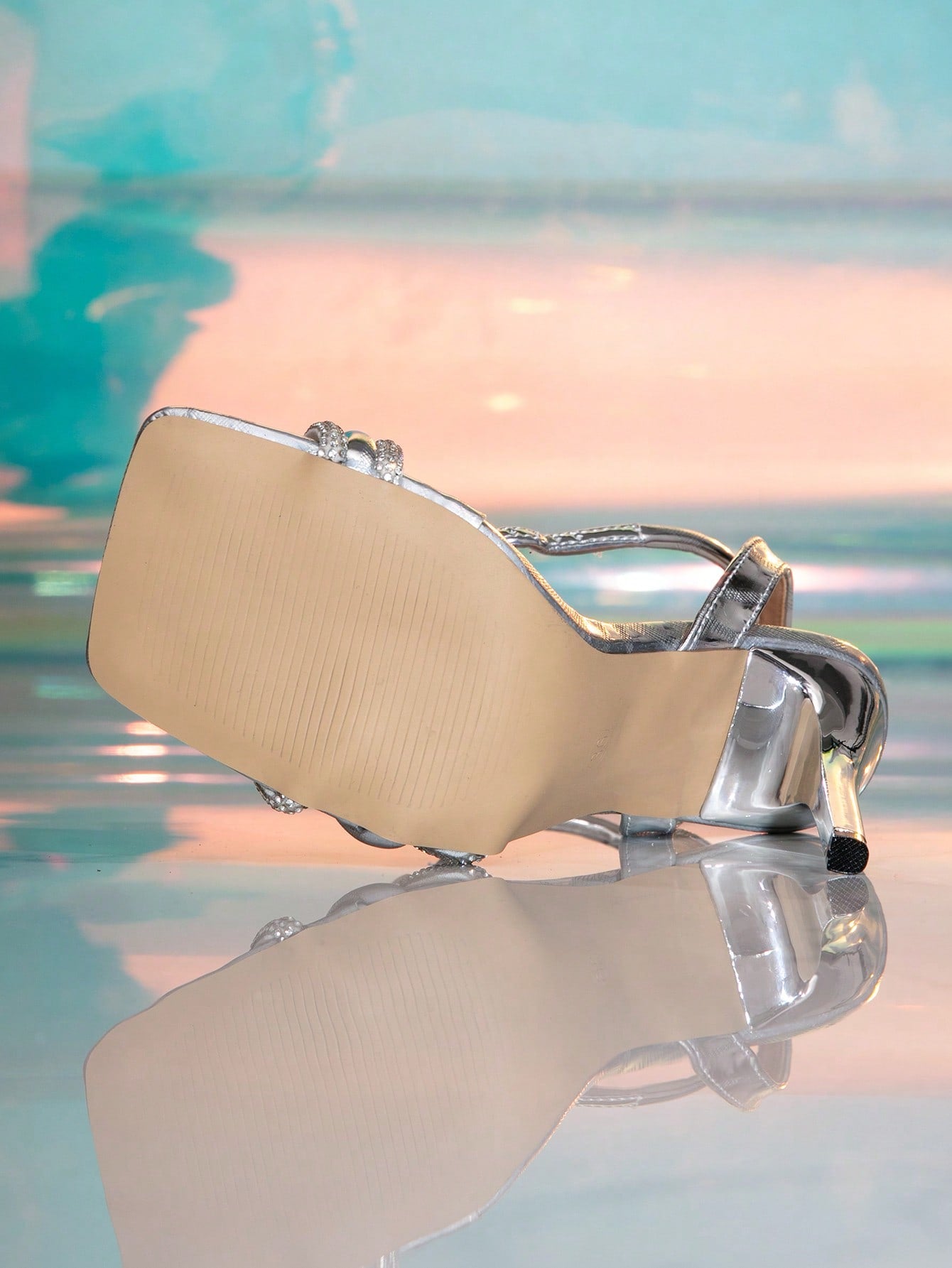 women 2025 Summer French Style Silver Rhinestone Square Toe High Heel Shoes