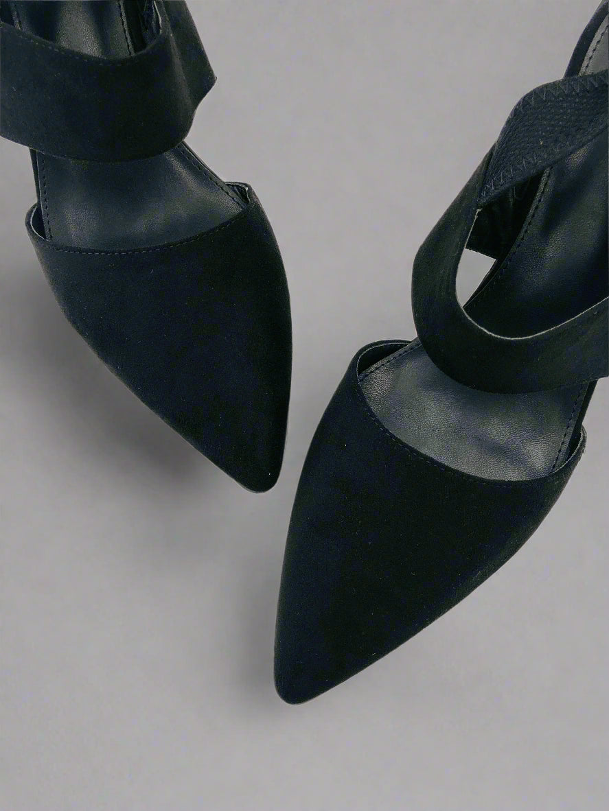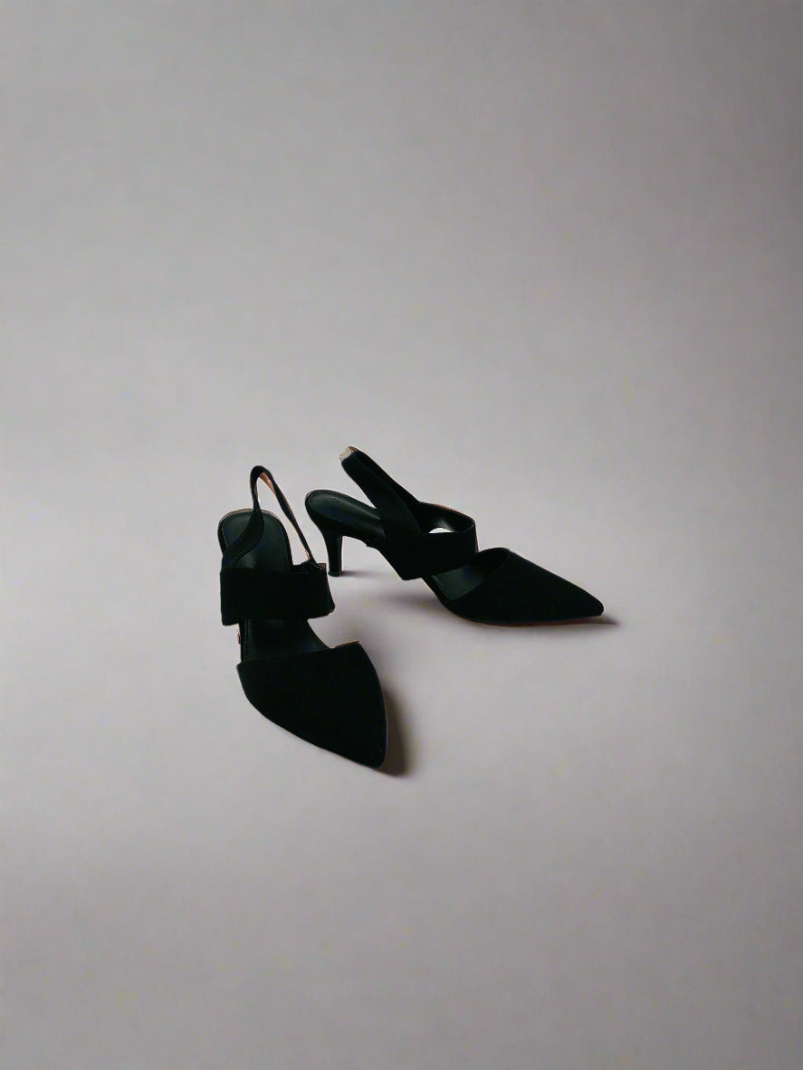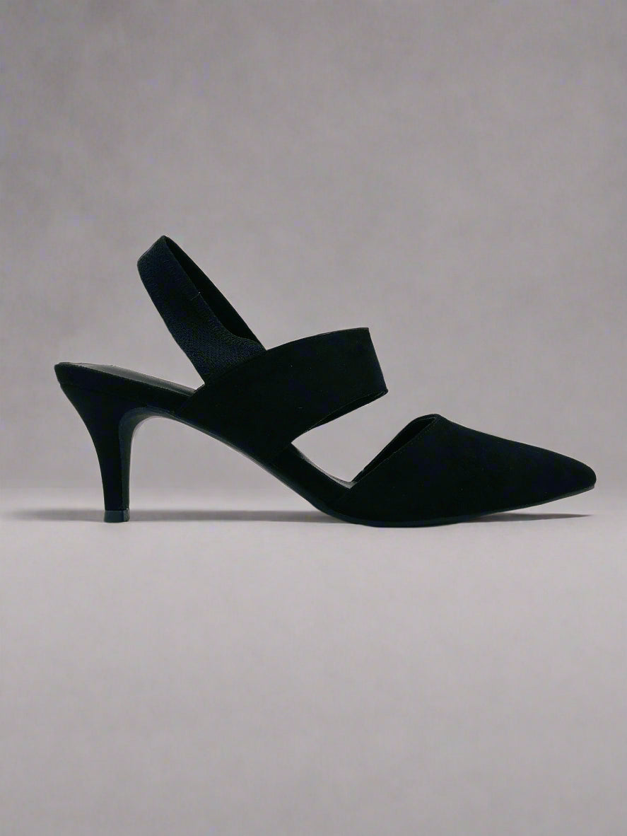 بومبس أسود نسائي بمقدمة مدببة وكعب منخفض مع حزام خلفي. مثالي للأزياء الكلاسيكية.