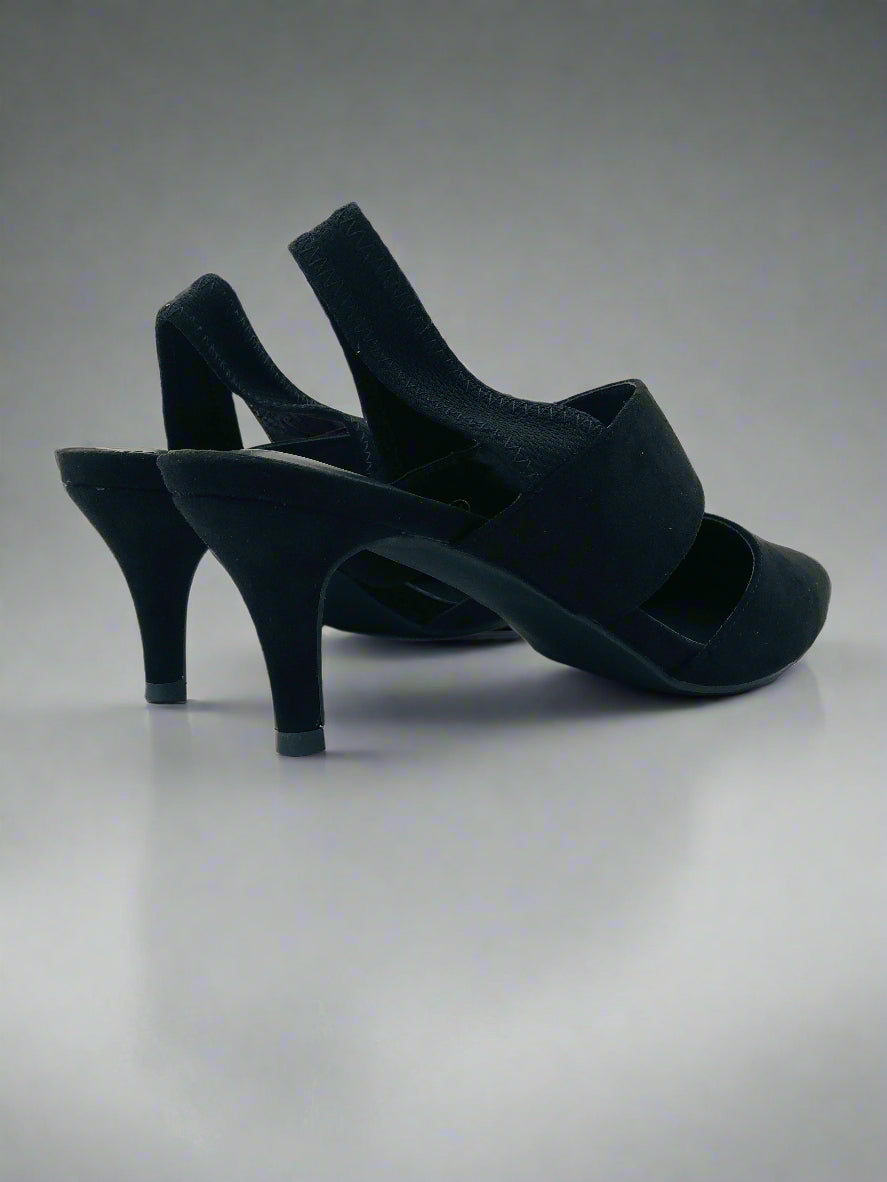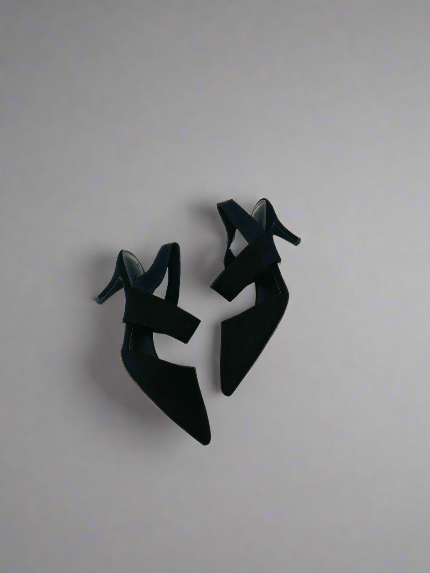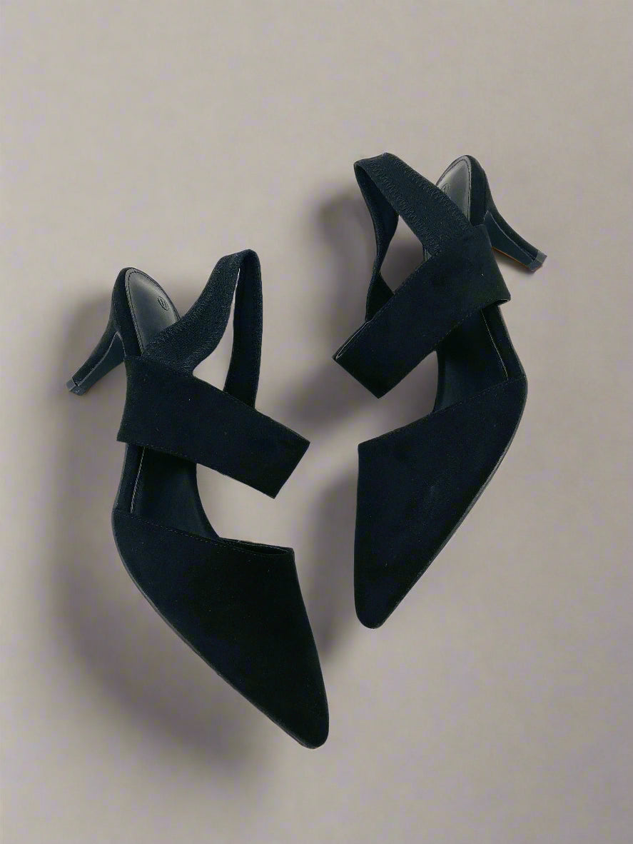 بومبس أسود نسائي بمقدمة مدببة وكعب منخفض مع حزام خلفي. مثالي للأزياء الكلاسيكية.