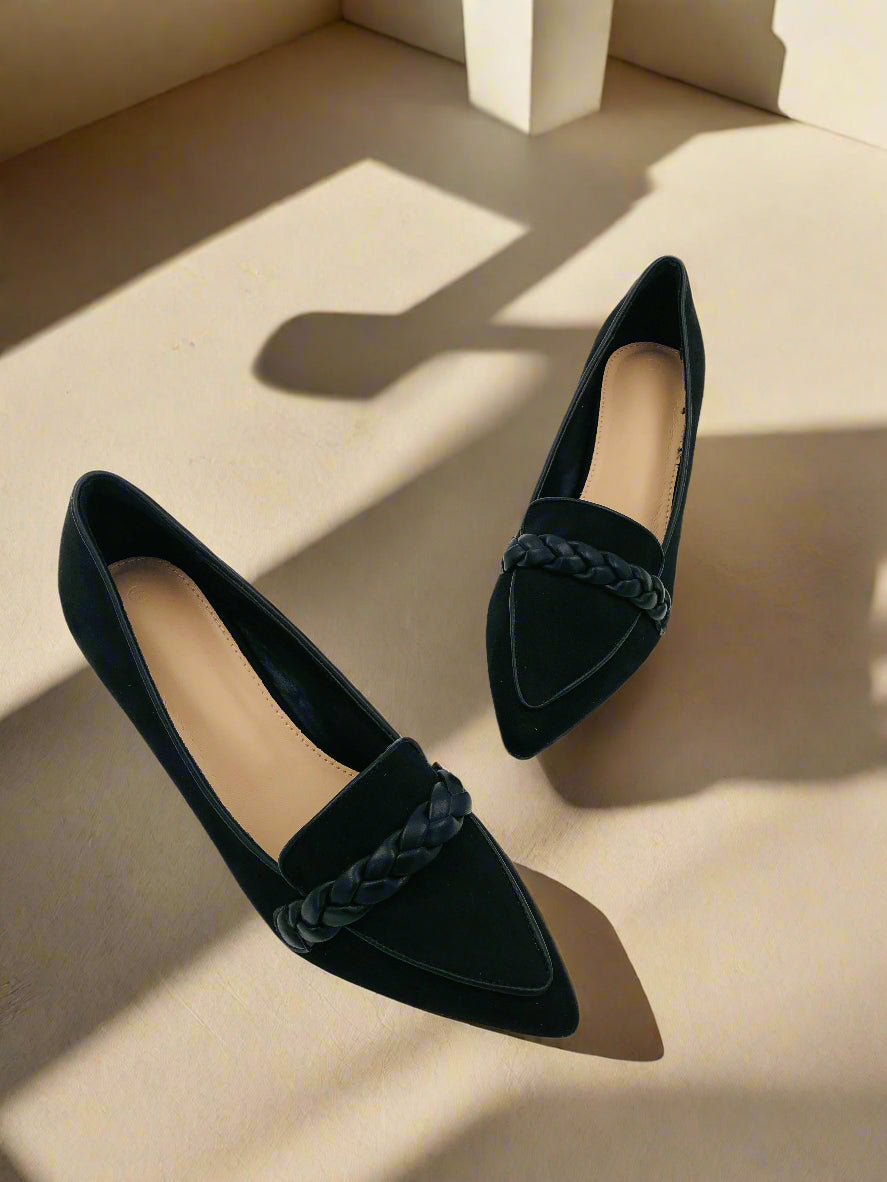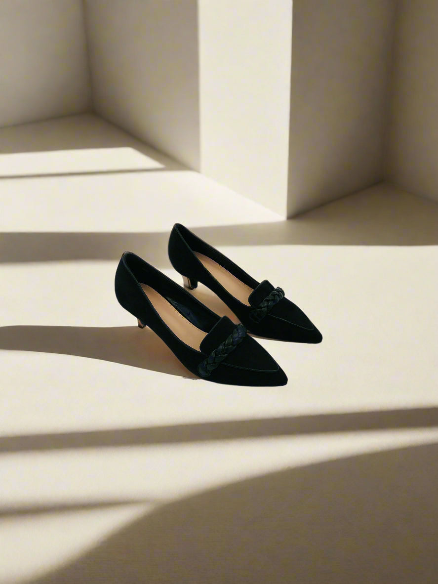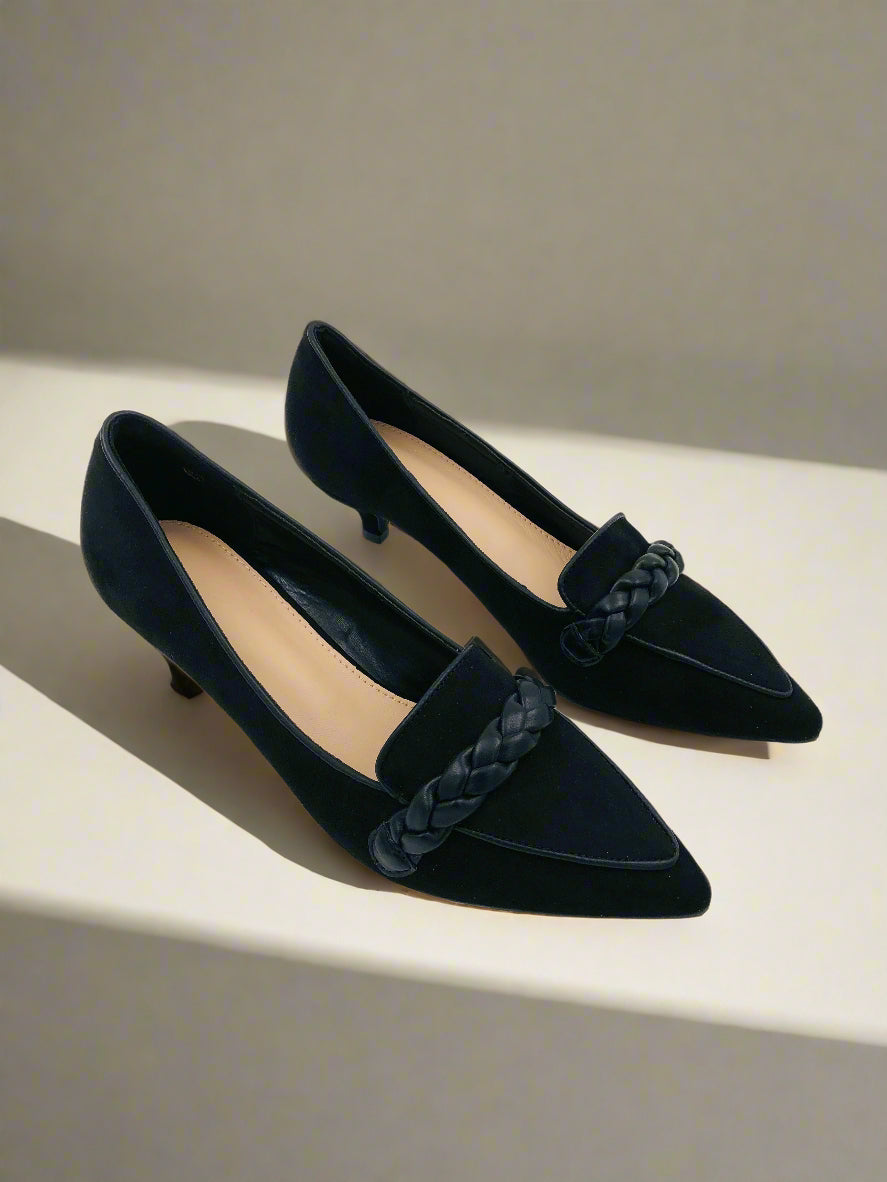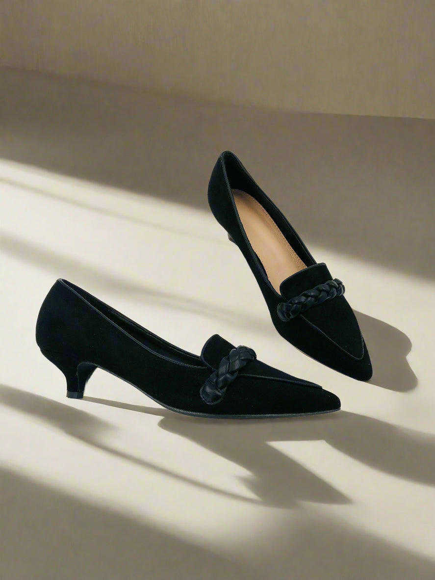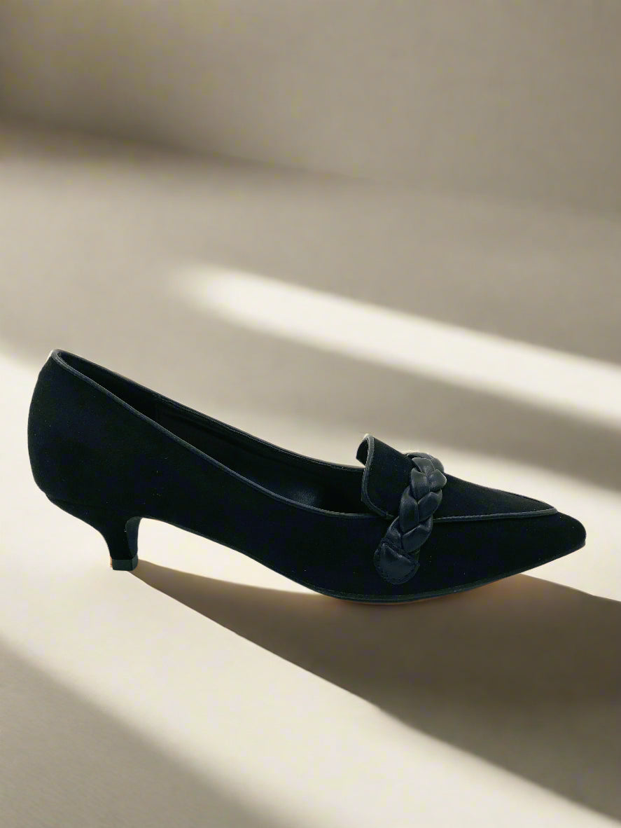 حذاء بكعب صغير للنساء بمقدمة مدببة، مزودة بتفاصيل ضفيرة في الأمام. تصميم سهل الارتداء، مثالية لأي مناسبة.