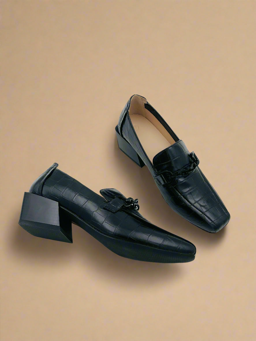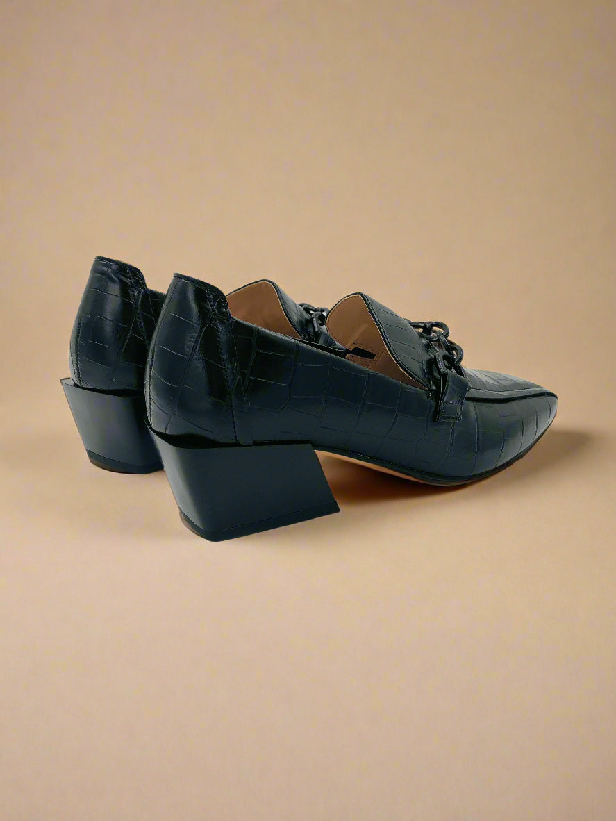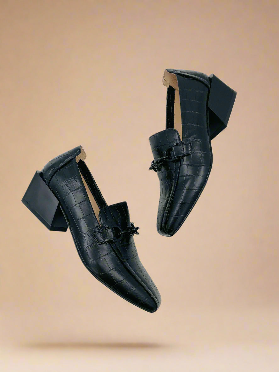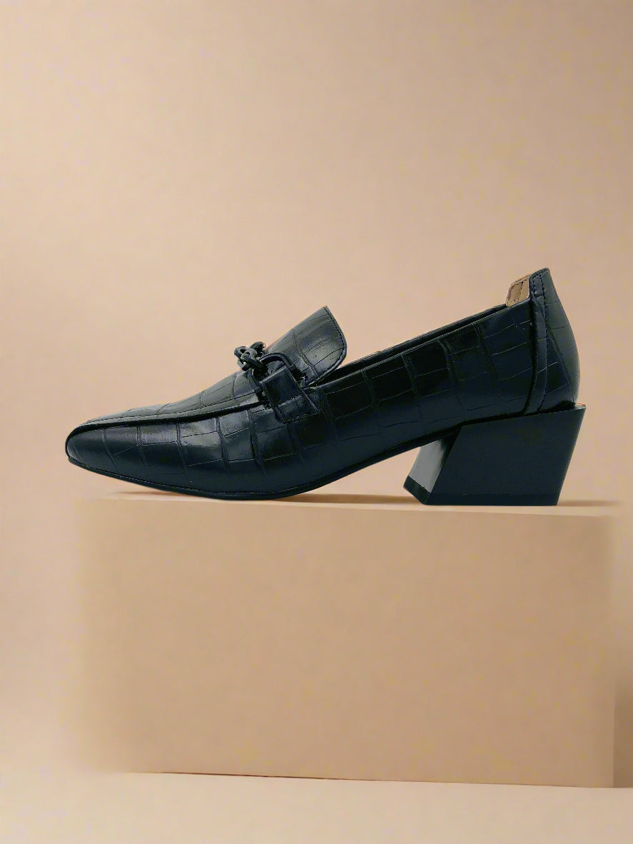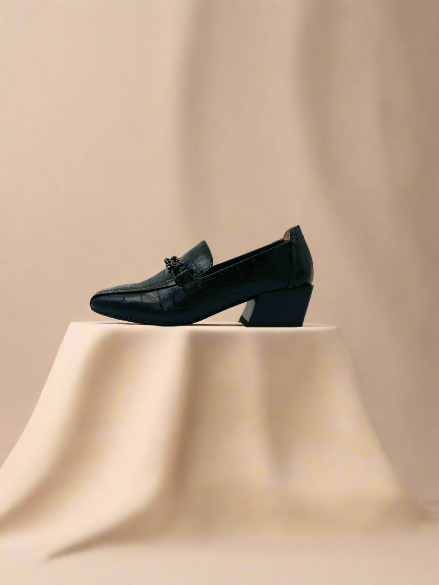 حذاء لوفر كلاسيكي ذو كعب للنساء باللون الأسود يوفر كل من العملية والأناقة.