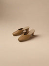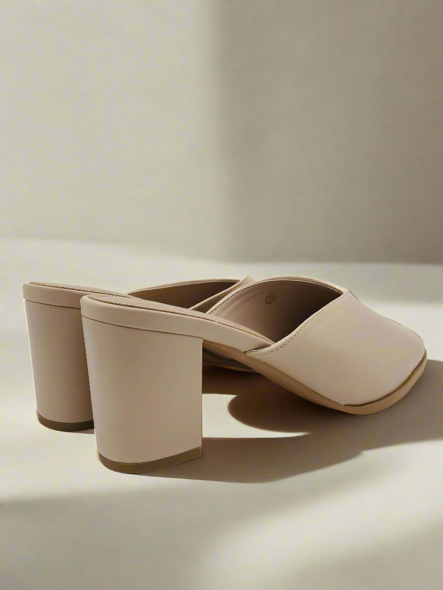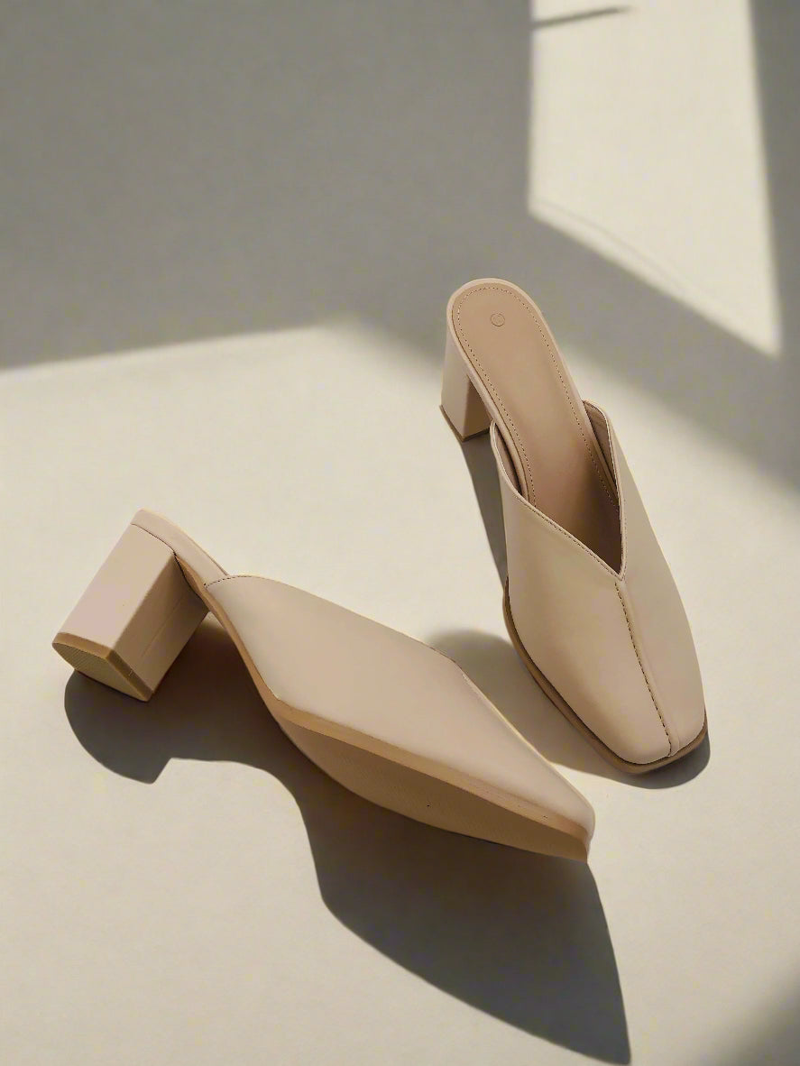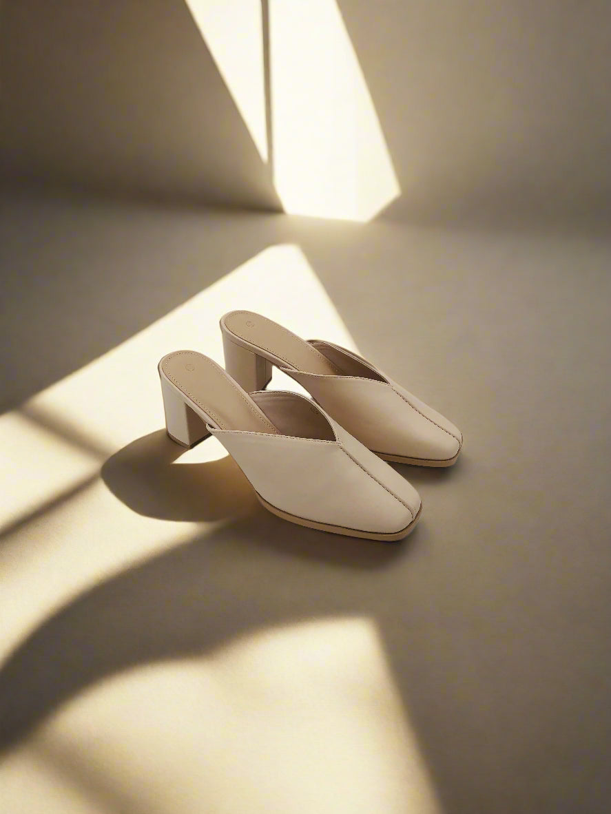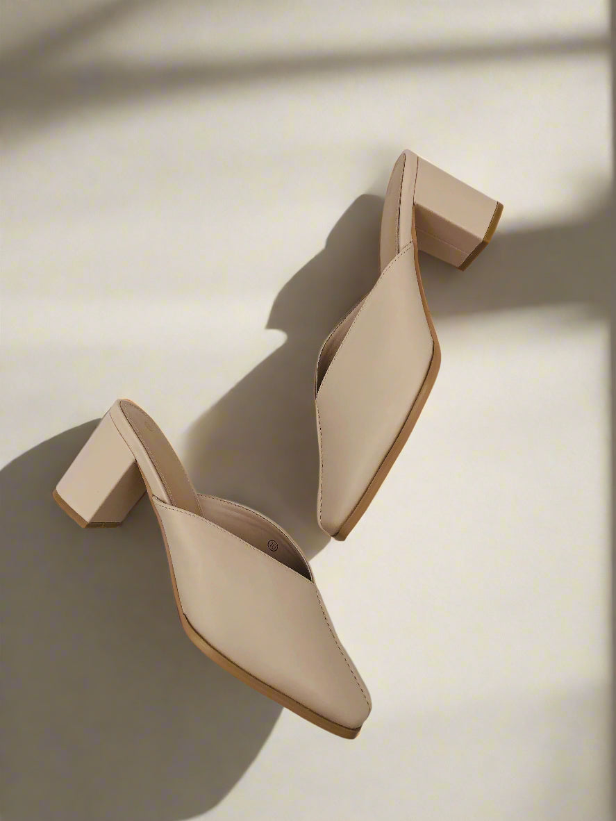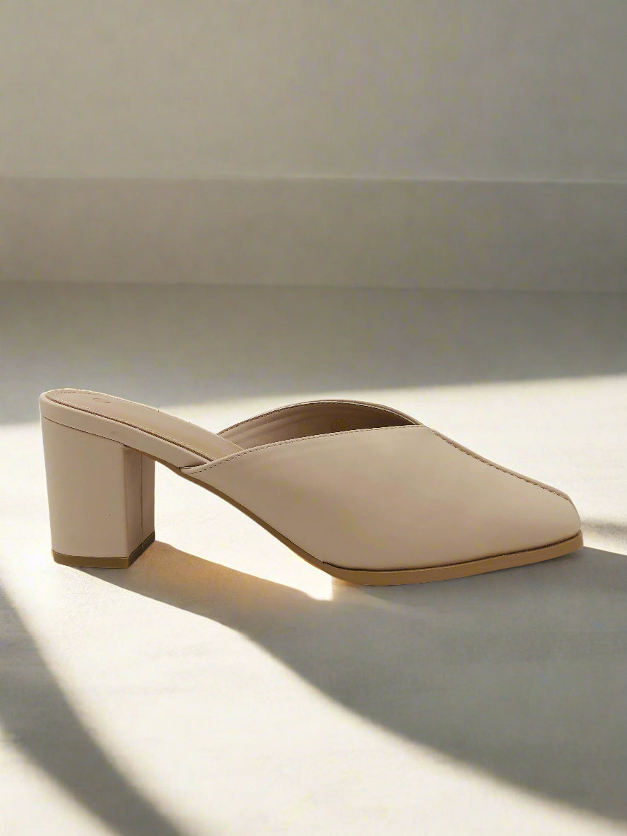 ميولز بيج فاتح كلاسيكية وأنيقة للنساء بكعب متوسط الارتفاع، بتصميم مريح سهل الارتداء ومقدمة مغلقة. مثالية للمكتب والمشي.