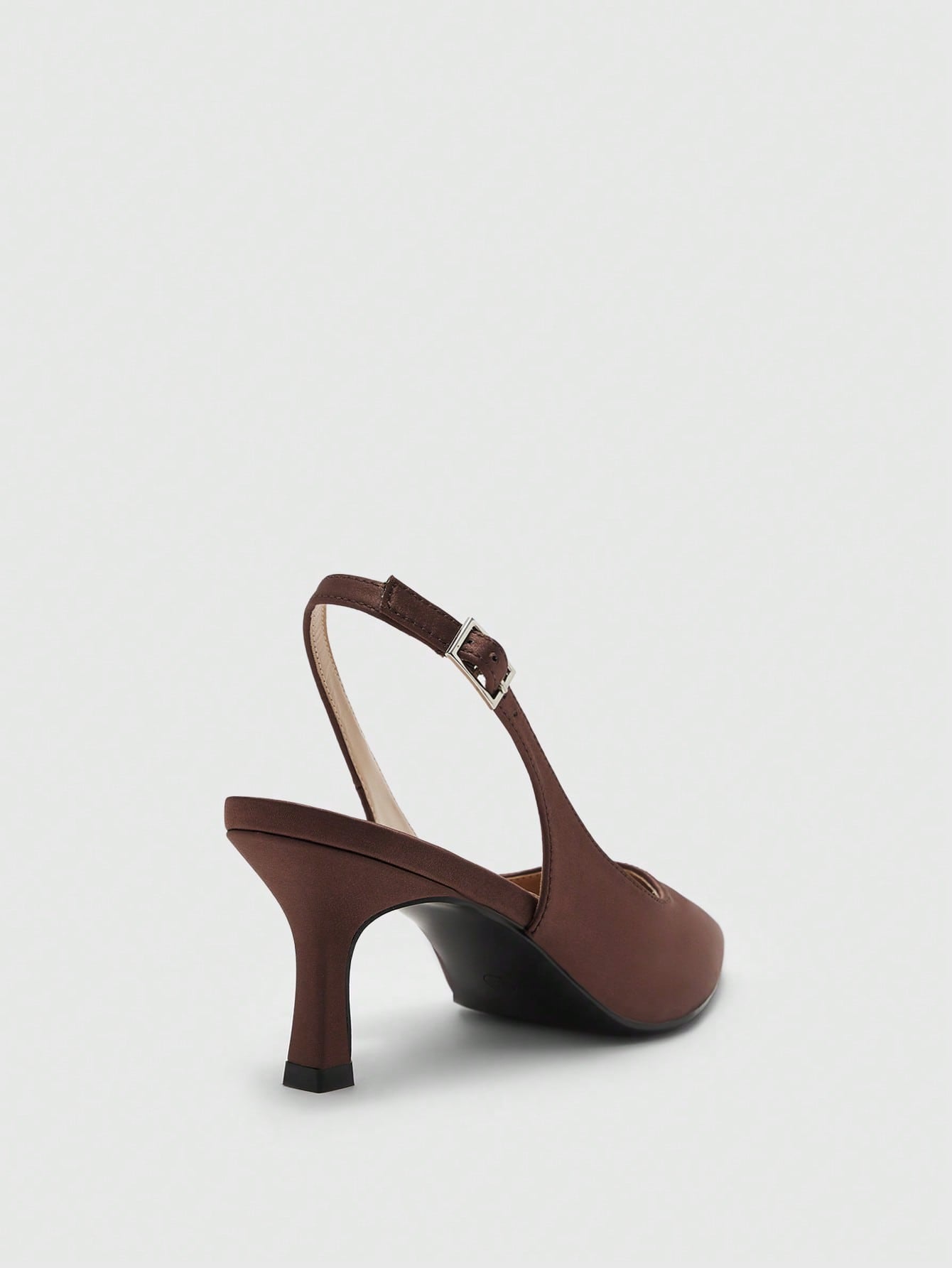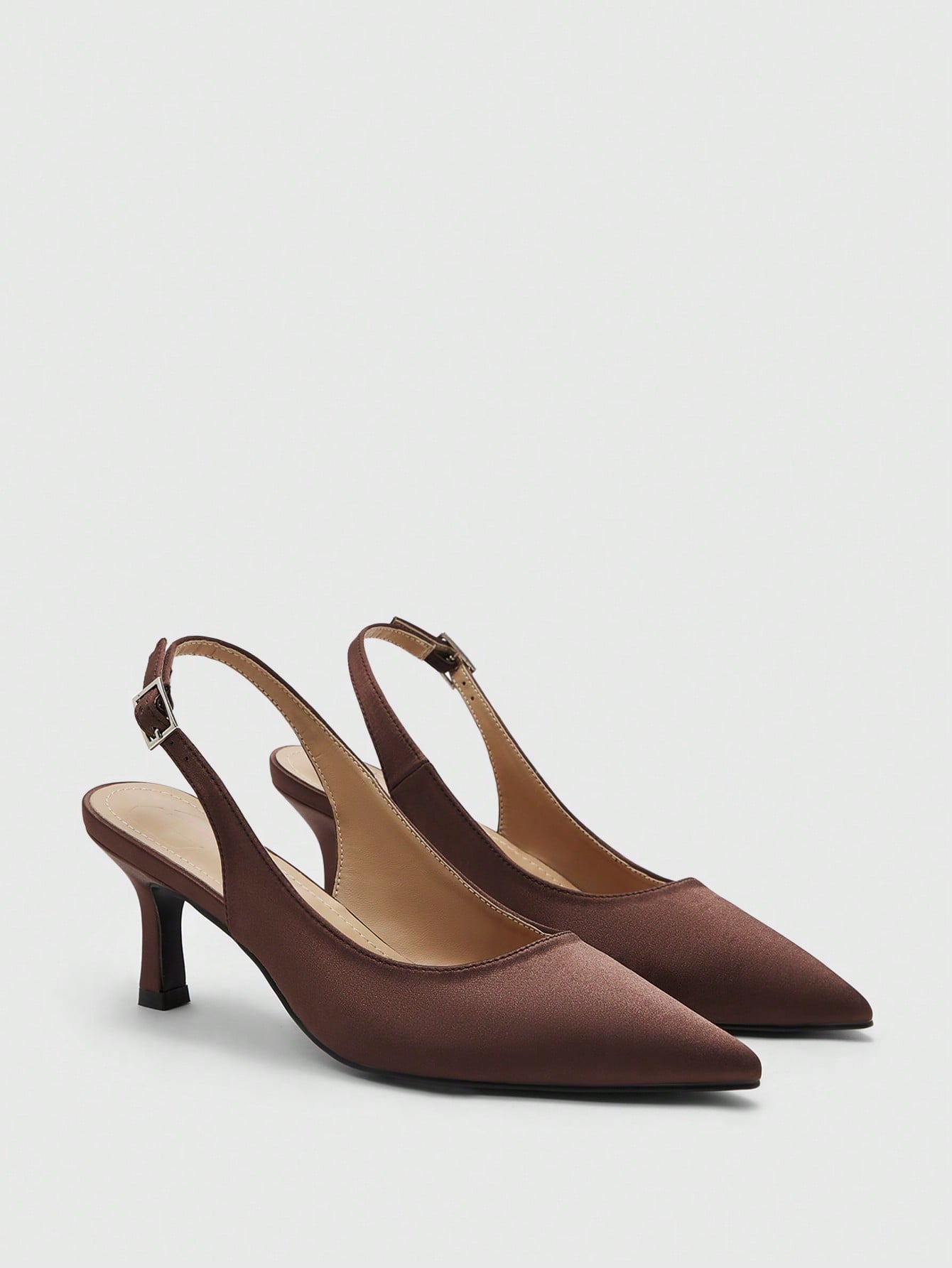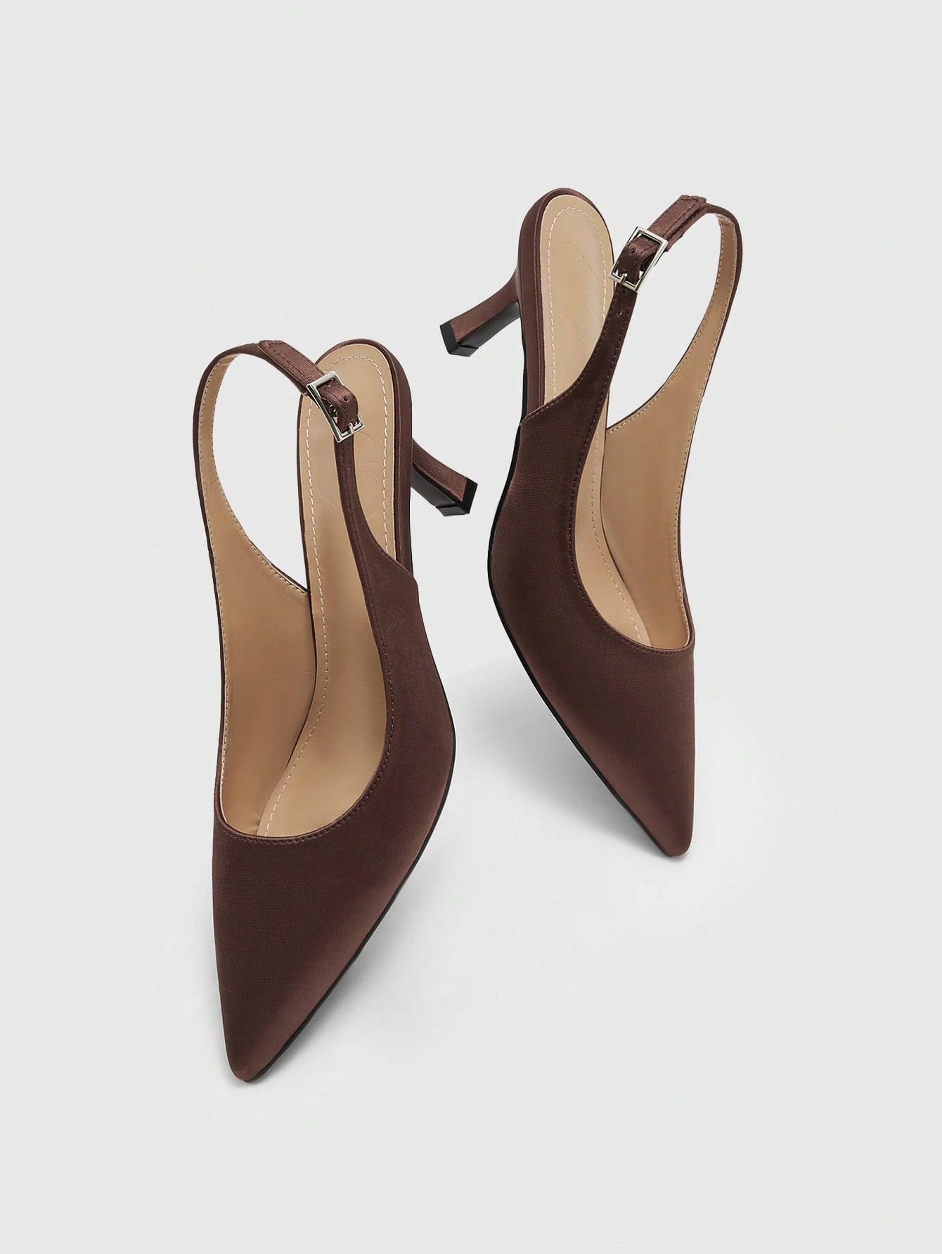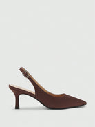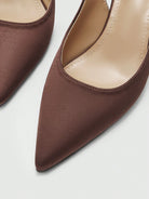 حذاء نسائي أنيق من CUCCOO BIZCHIC، مصنوع من الساتان البني، بكعب عالٍ مدبب من الأمام.