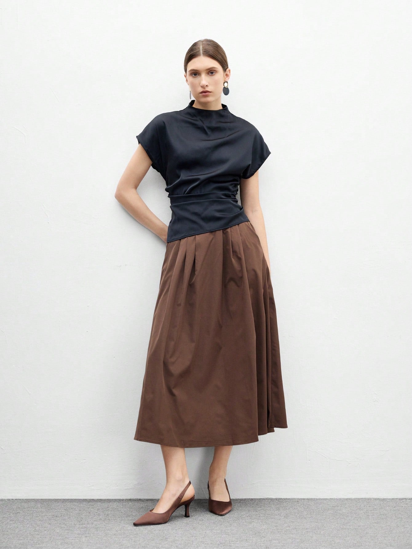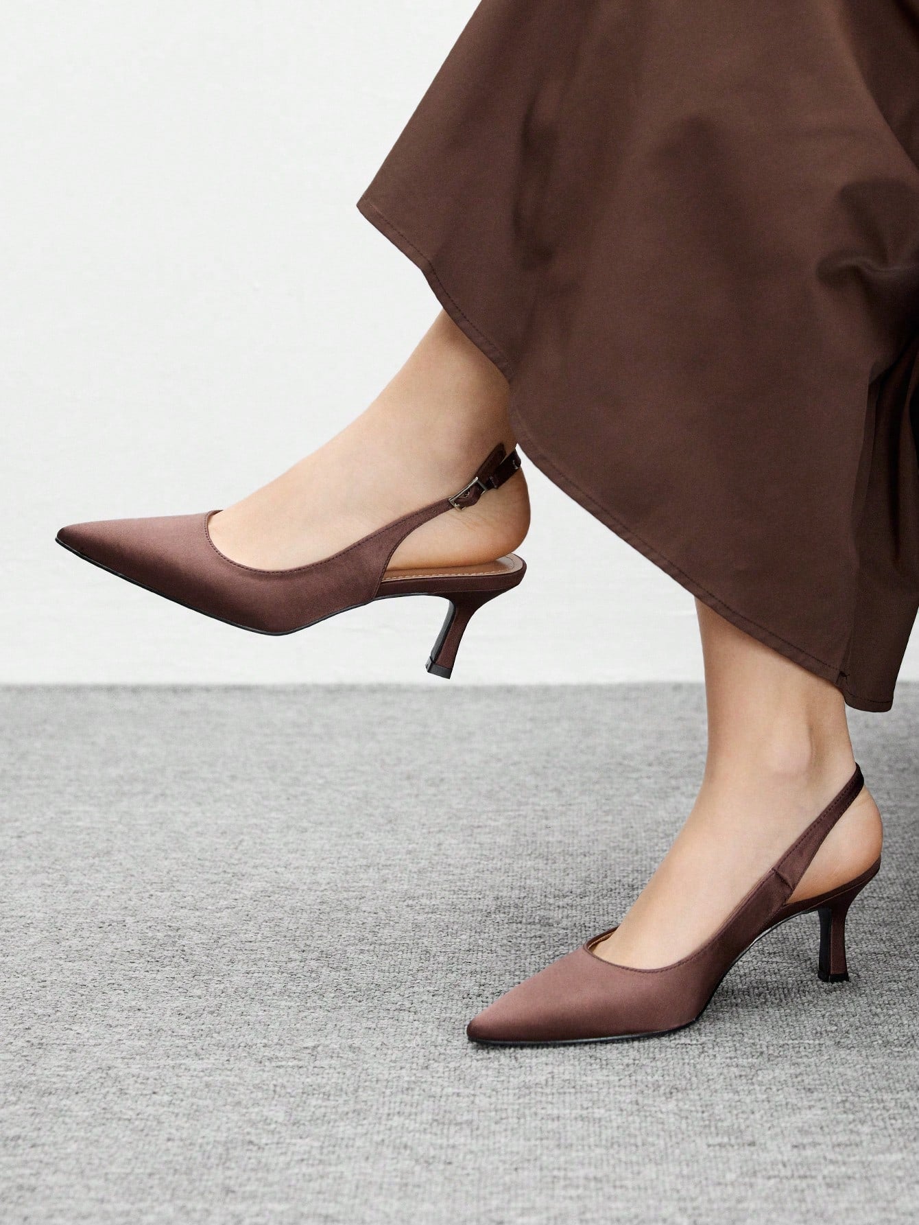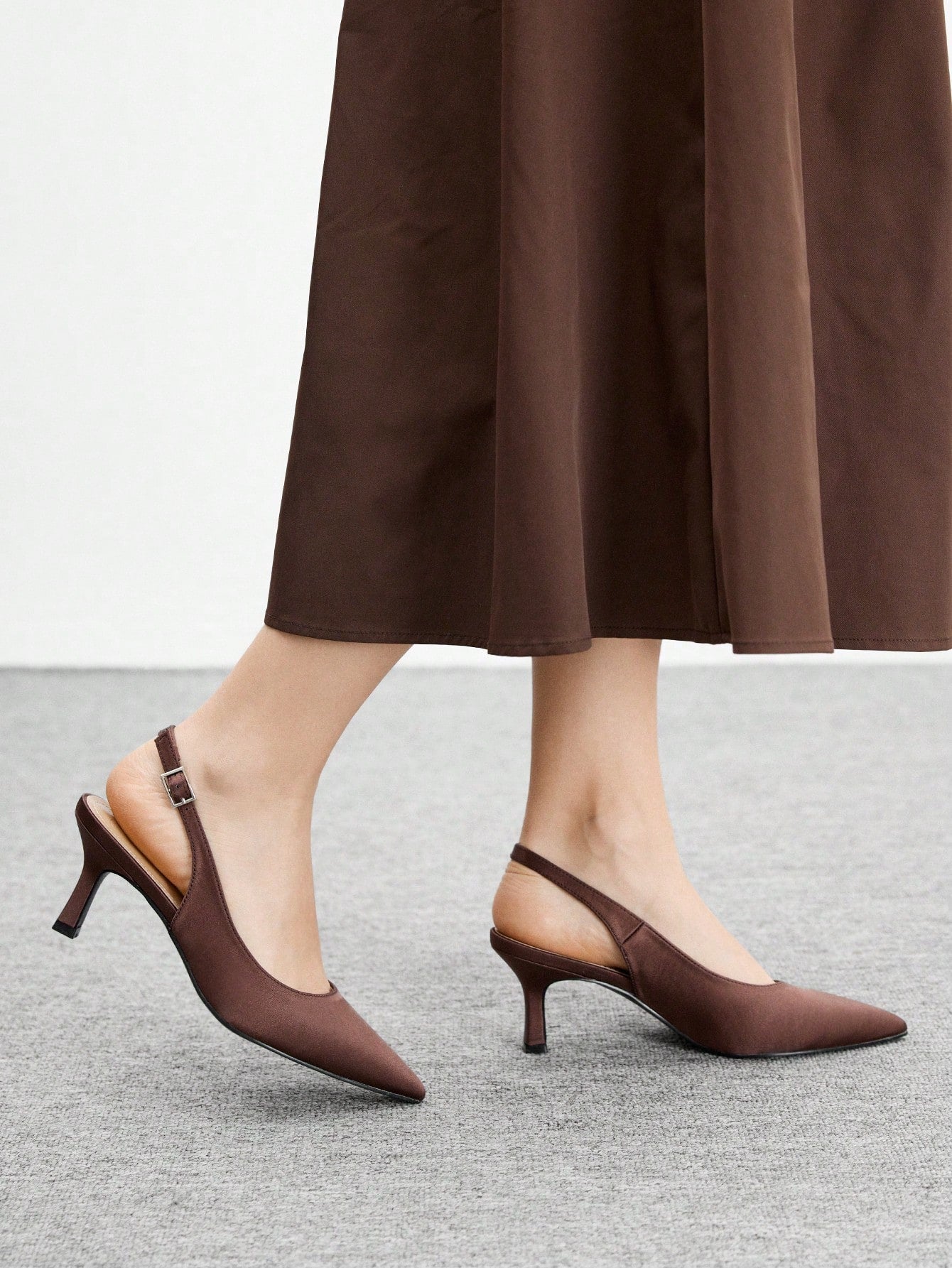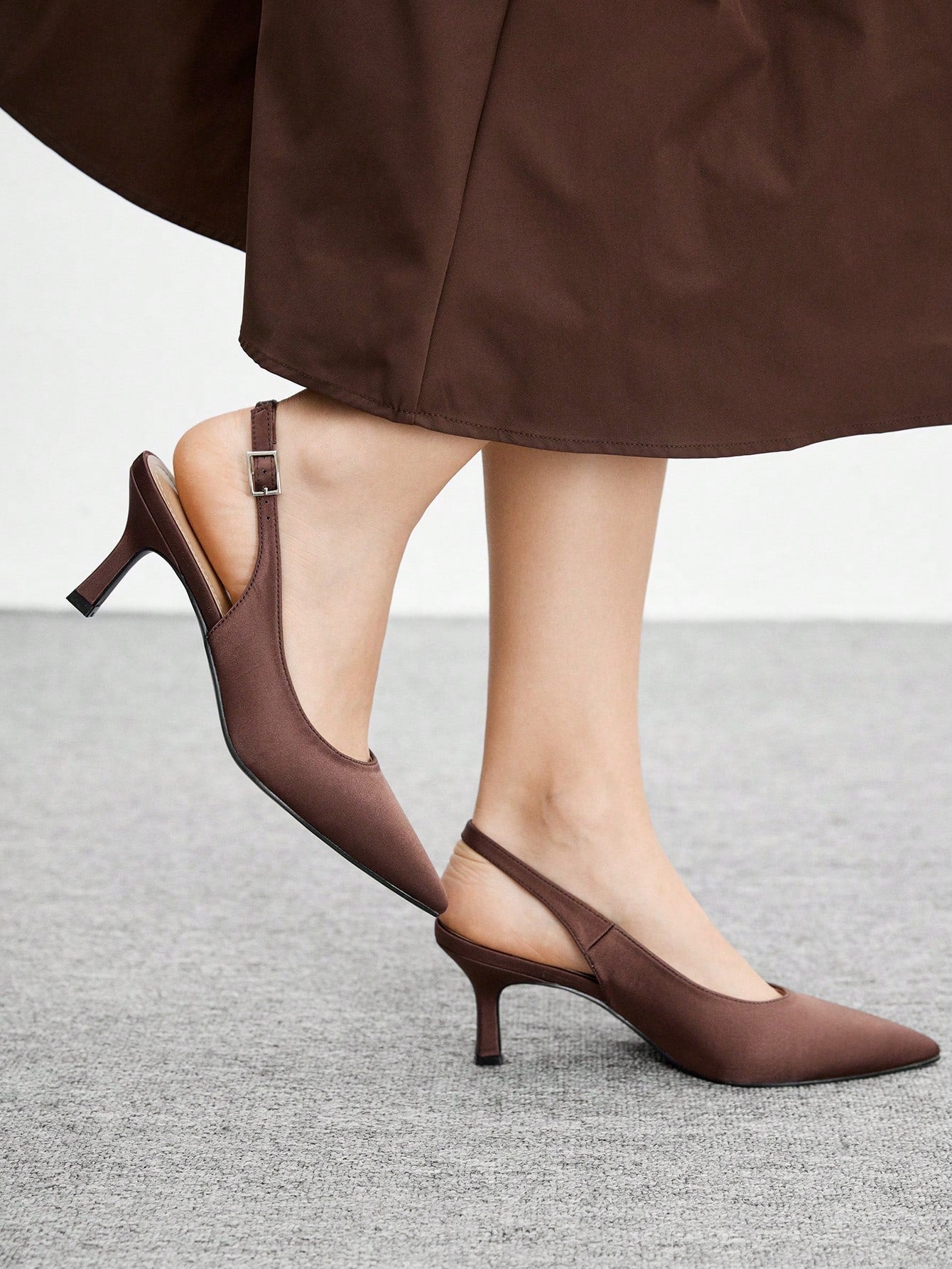 حذاء نسائي أنيق من CUCCOO BIZCHIC، مصنوع من الساتان البني، بكعب عالٍ مدبب من الأمام.