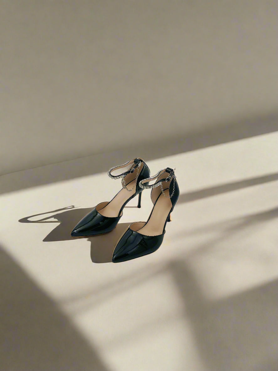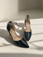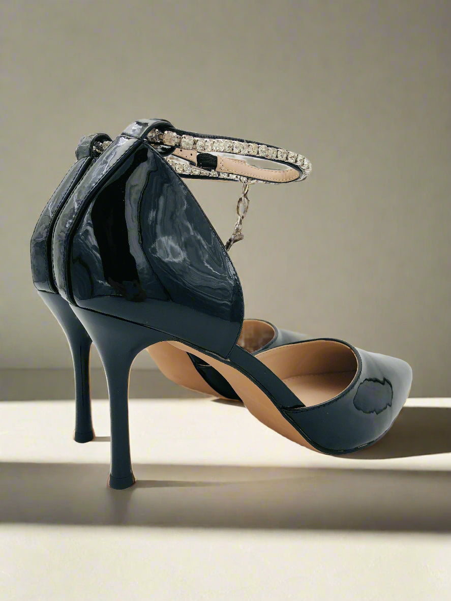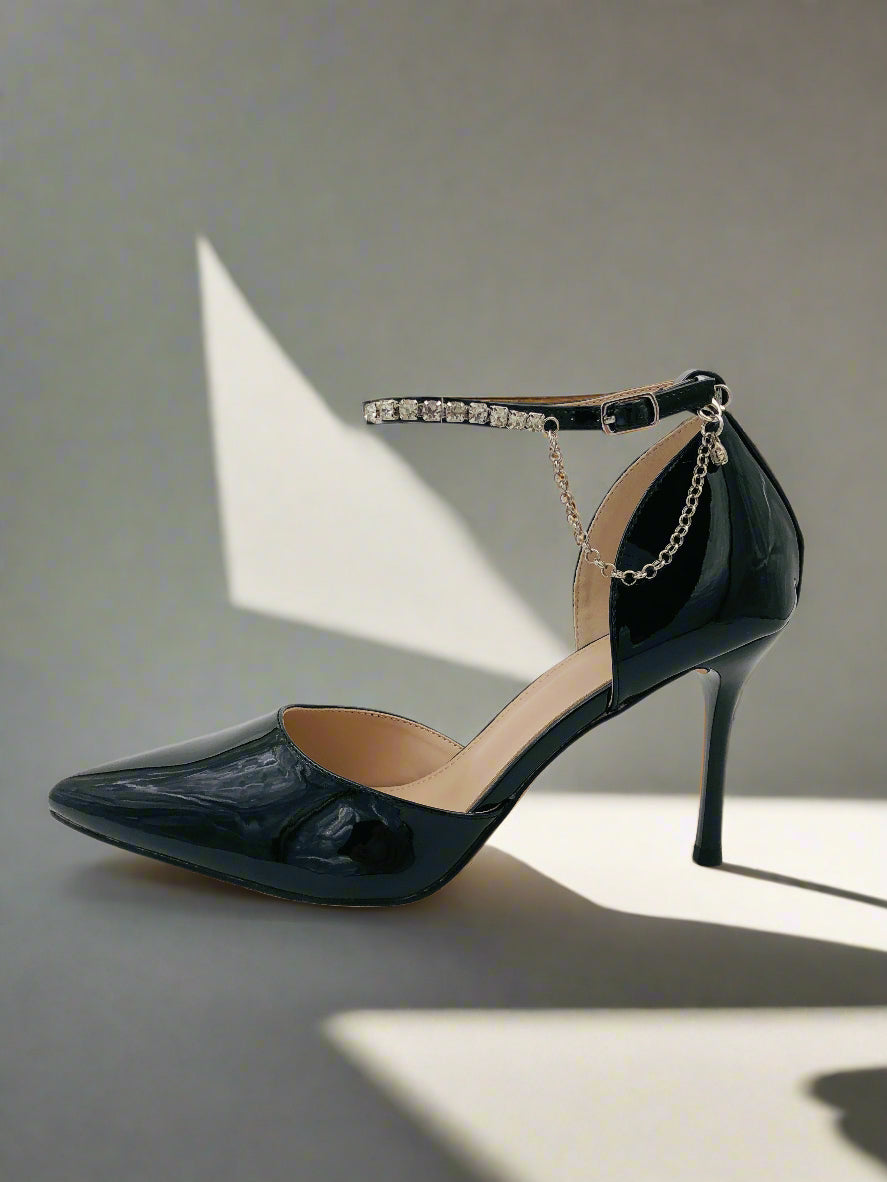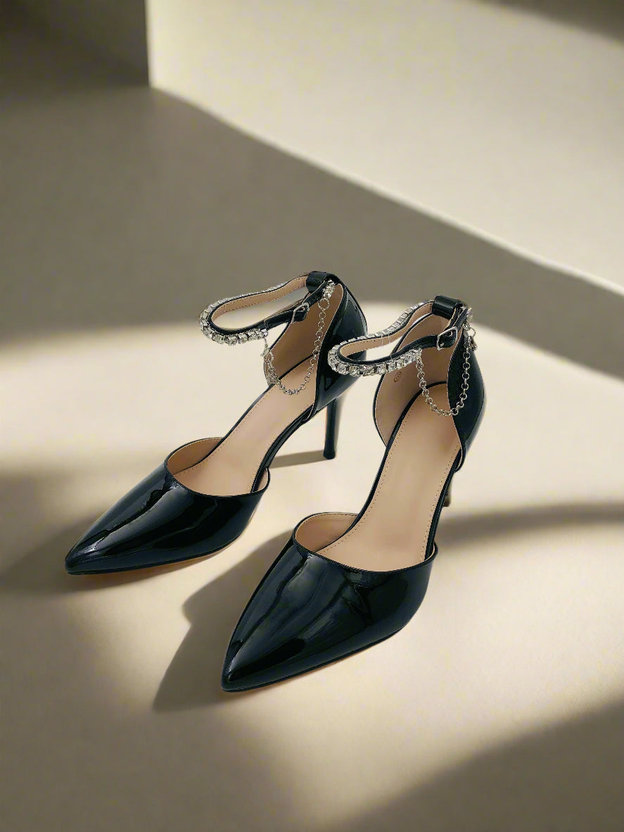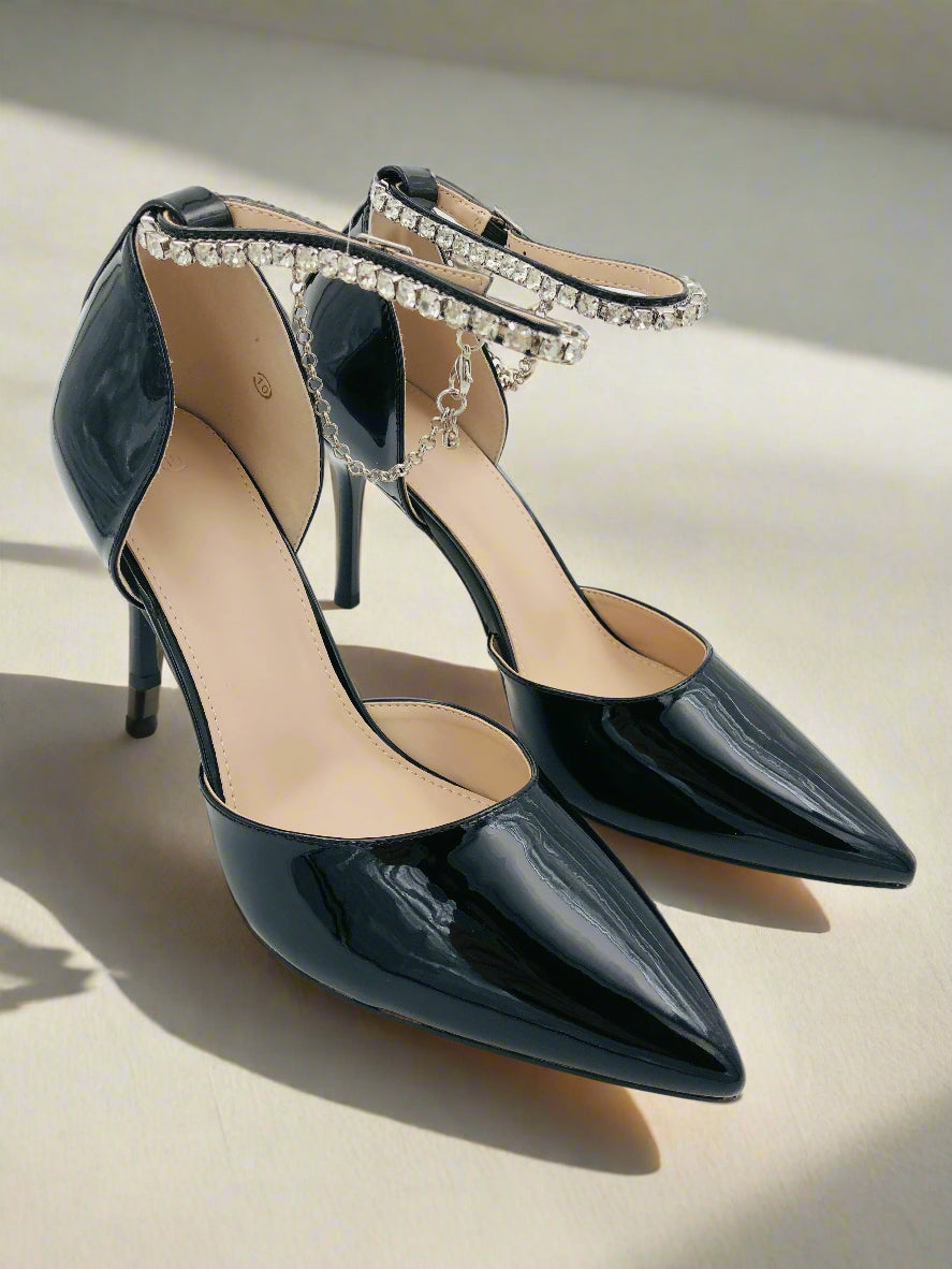 حذاء بومبس ستيلتو أسود ذو مقدمة مدببة للنساء، مزود بسوار كاحل مرصع بالجواهر، مثالي لحفلات الزفاف والمناسبات. يعكس الأنوثة بكل تفاصيله مع كل إطلالة.