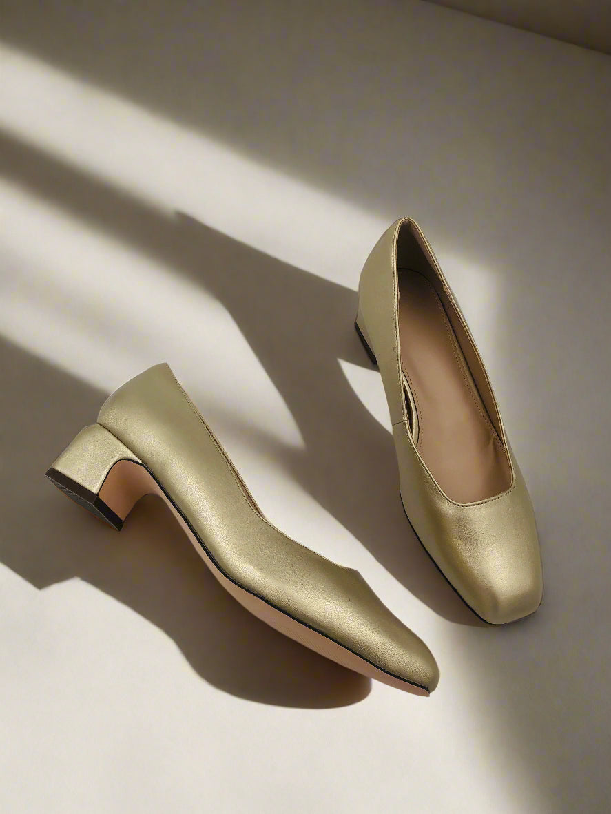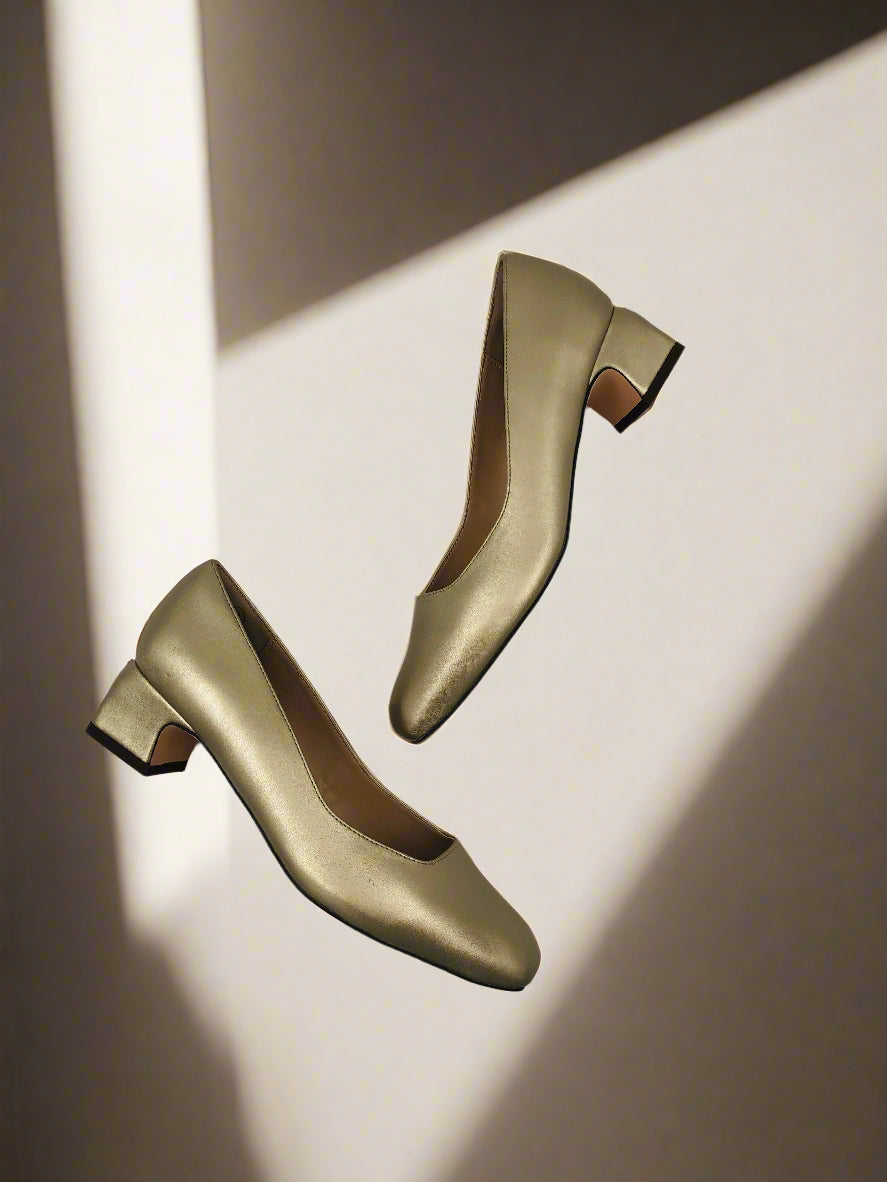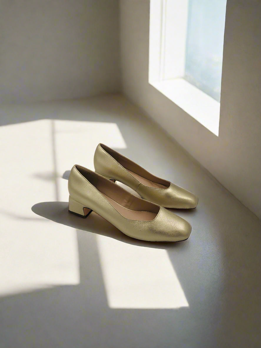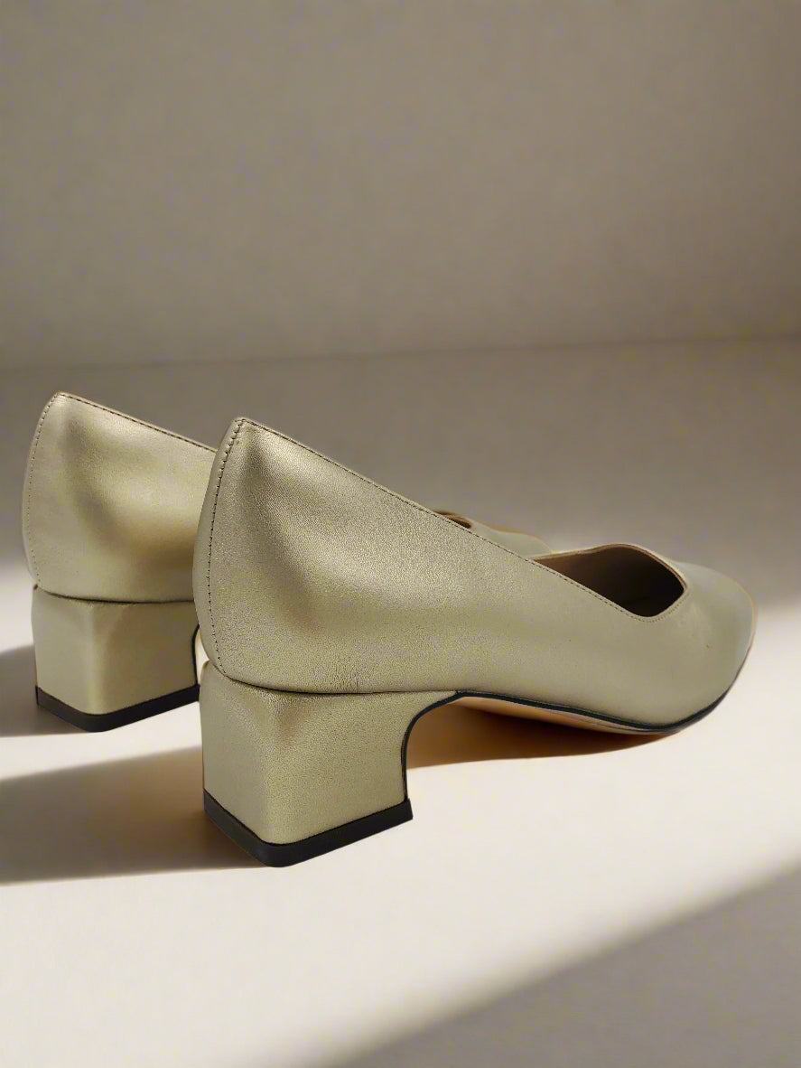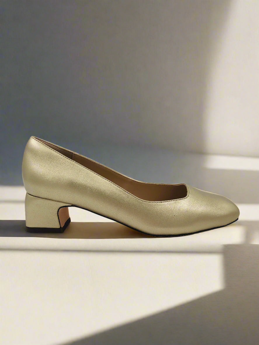 حذاء بومبس ذهبي بمقدمة مدورة وكعب سميك منخفض، مريح وعصري. مثالي للمناسبات الرسمية وغير الرسمية.