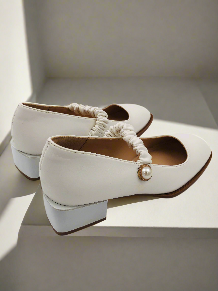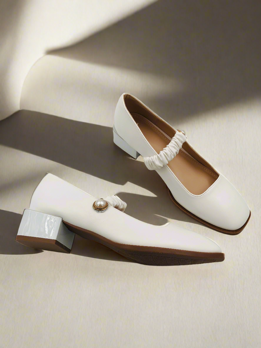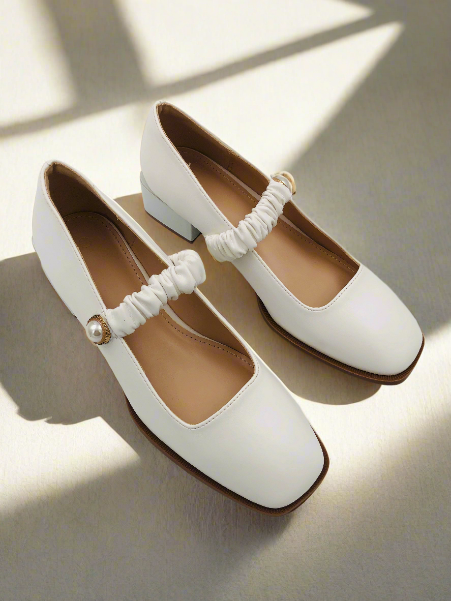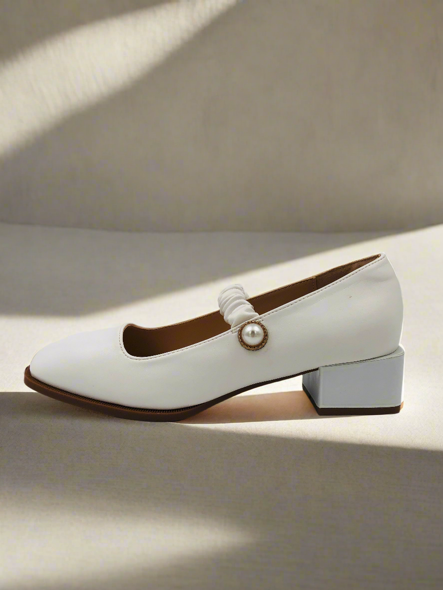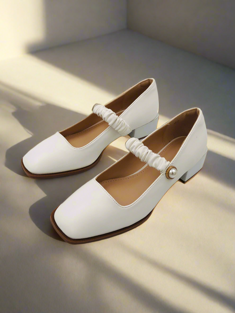 حذاء بومبس ماري جين أبيض للنساء بكعب سميك منخفض، ومقدمة مربعة، مع شريط صغير على مشط القدم. مناسبة لجميع الفصول.