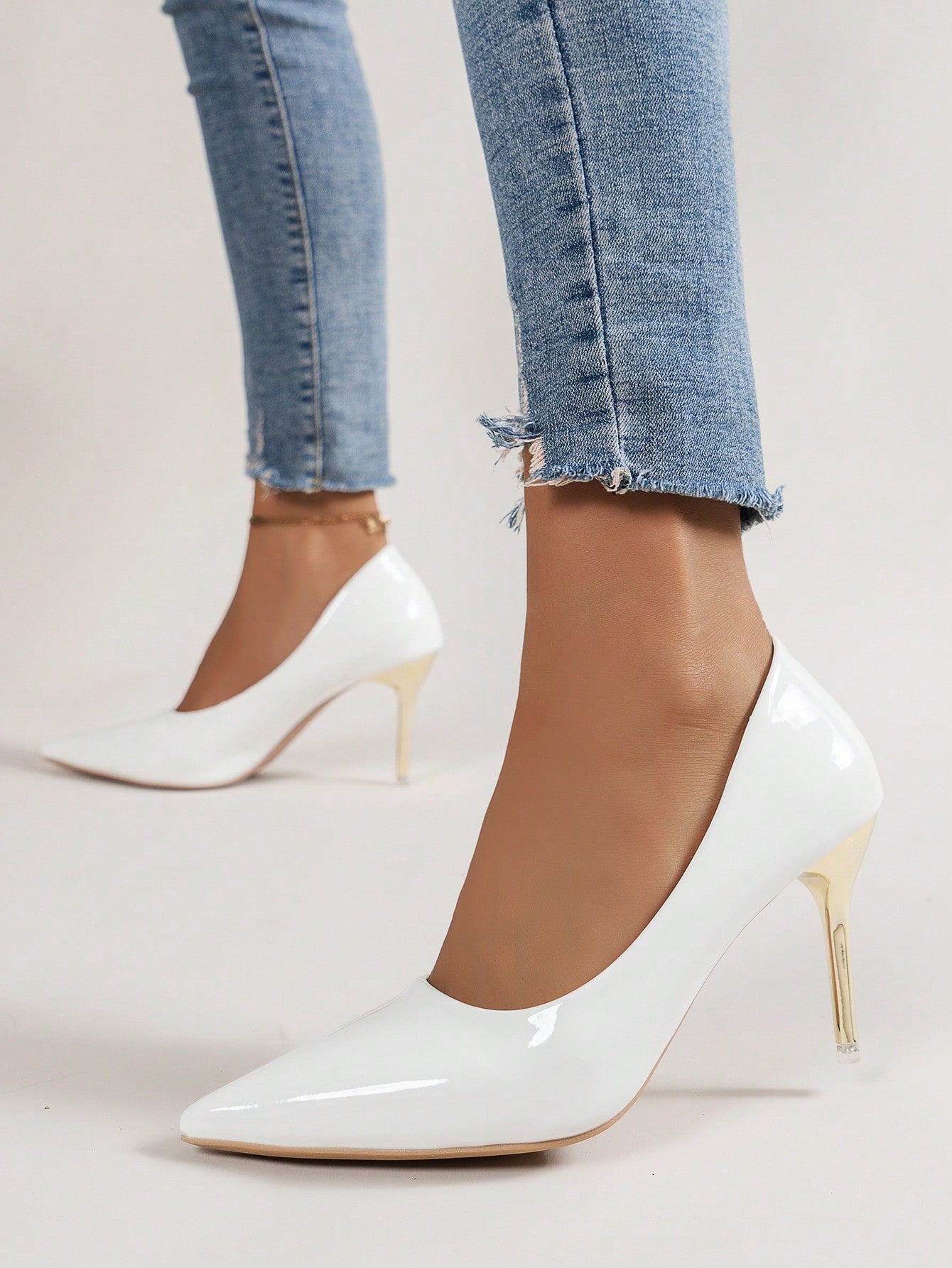 White Pointed Shiny Patent Leather Electroplating High-Heeled Shoes For Women's Formal Outfit, Elegant