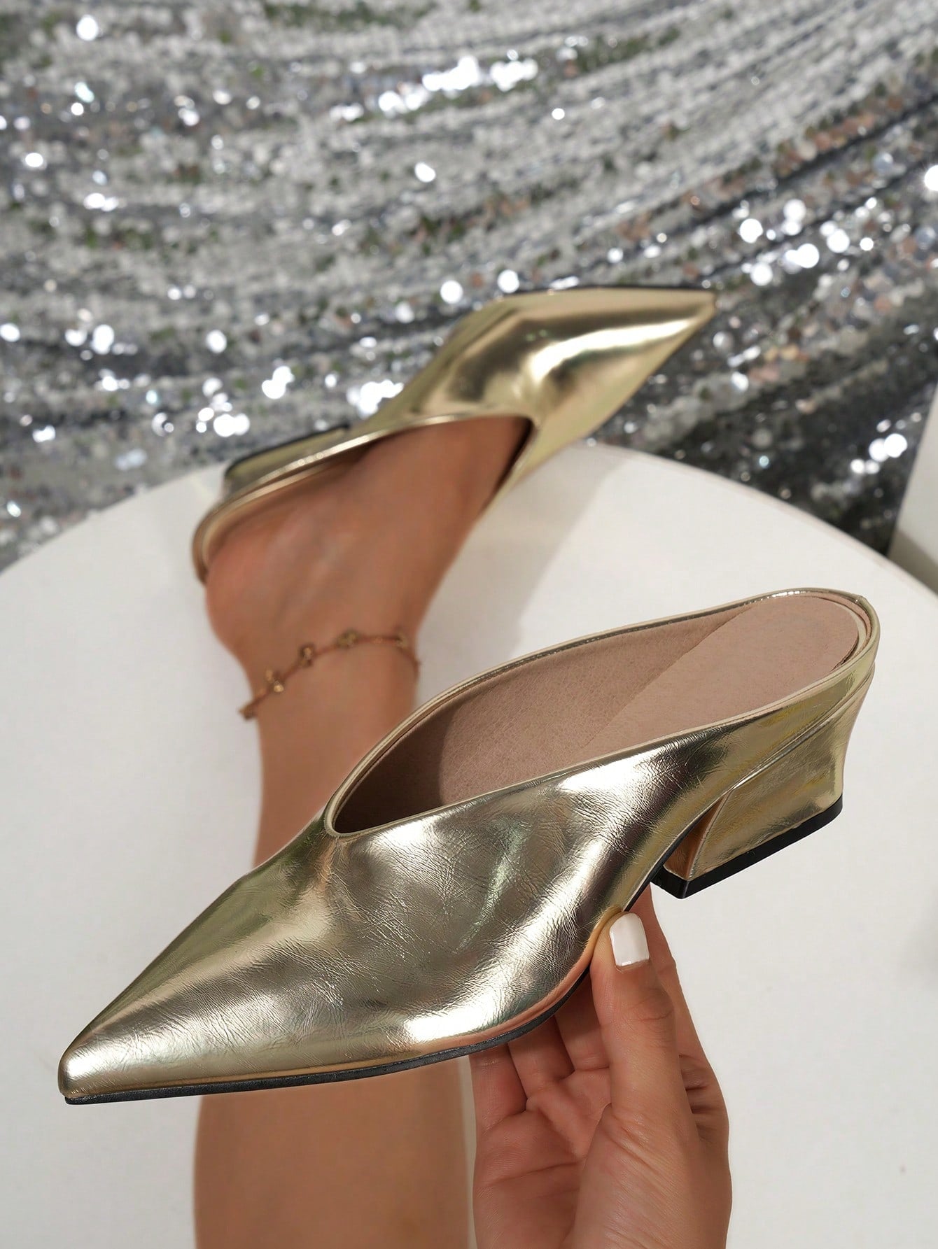 women Women Wide Last Spring And Summer Fashionable Pointed Toe Deep Mouth Asymmetric Heel Mule Heel Shoes With Elegant And Comfortable Gold PU Leather High Heels