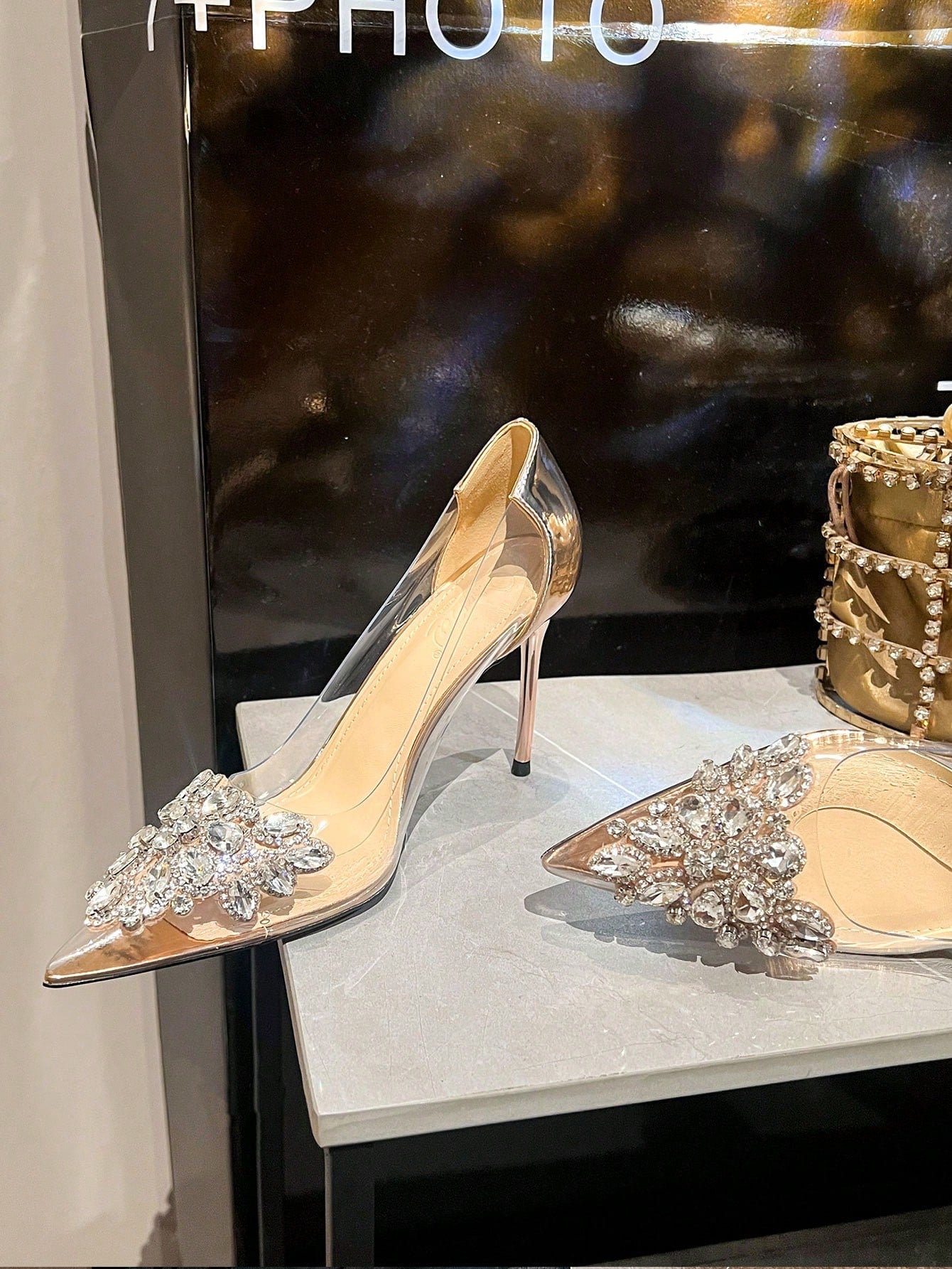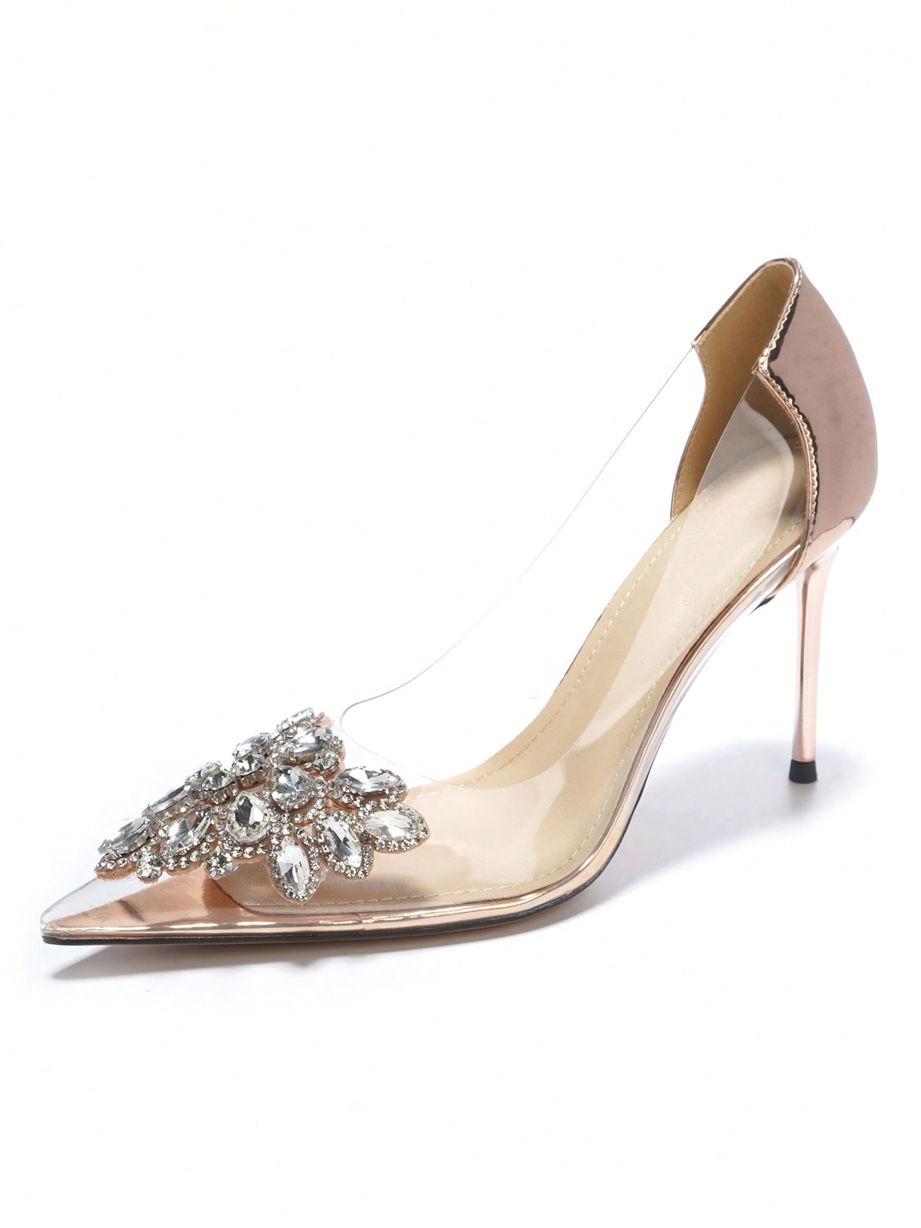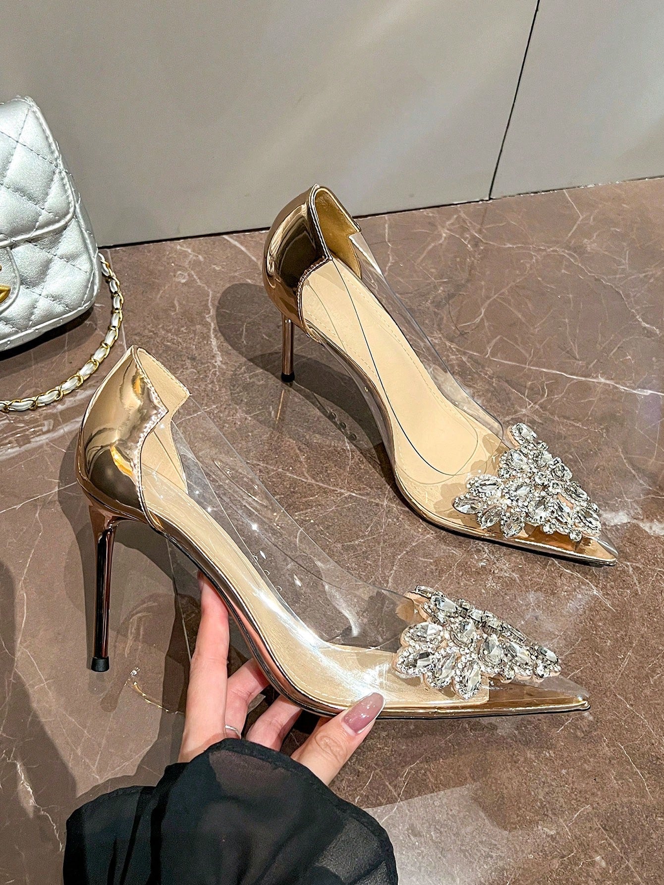 حذاء نسائي بكعب عالٍ شفاف ومقدمة مدببة ومزين بالكريستال مصنوع يدويًا