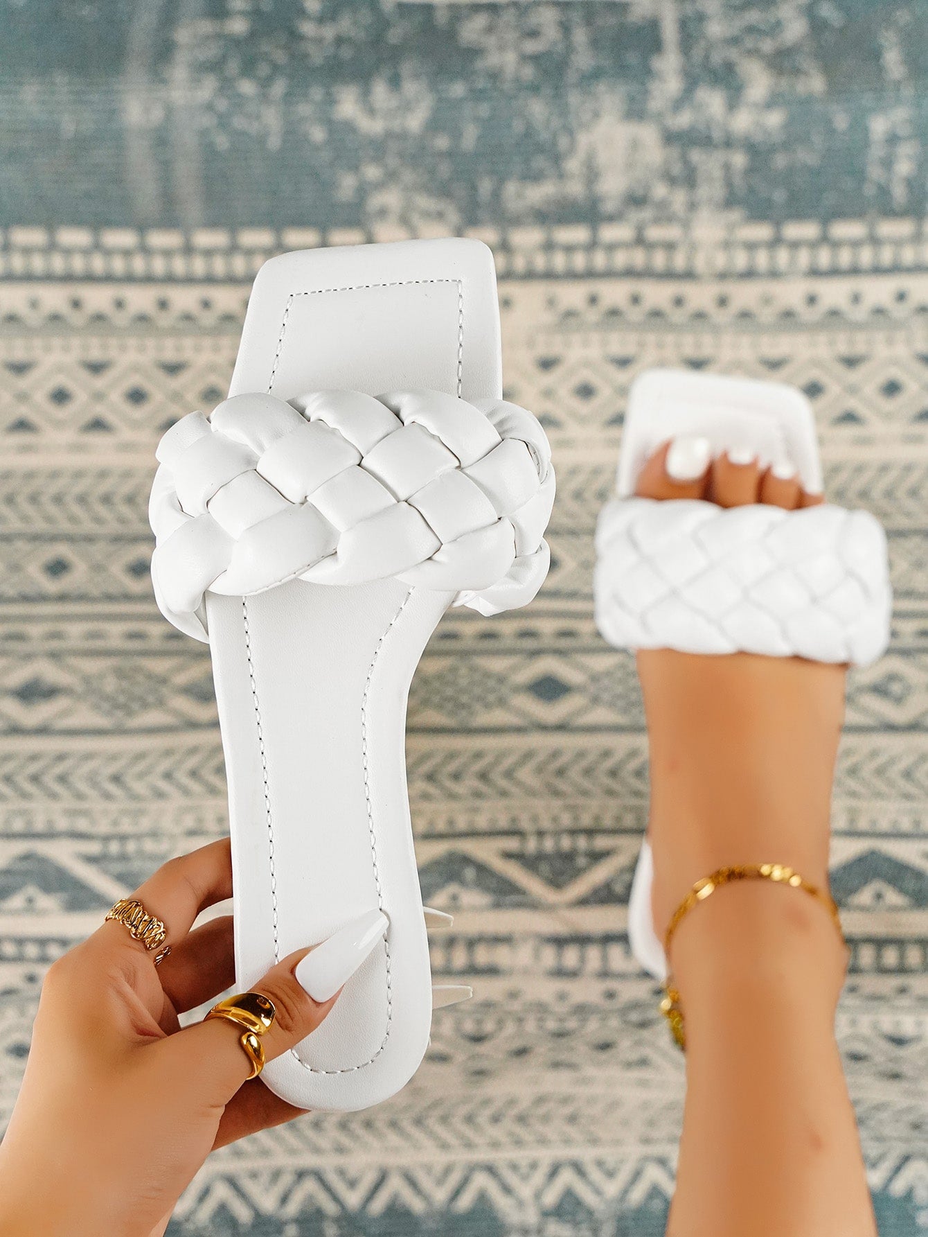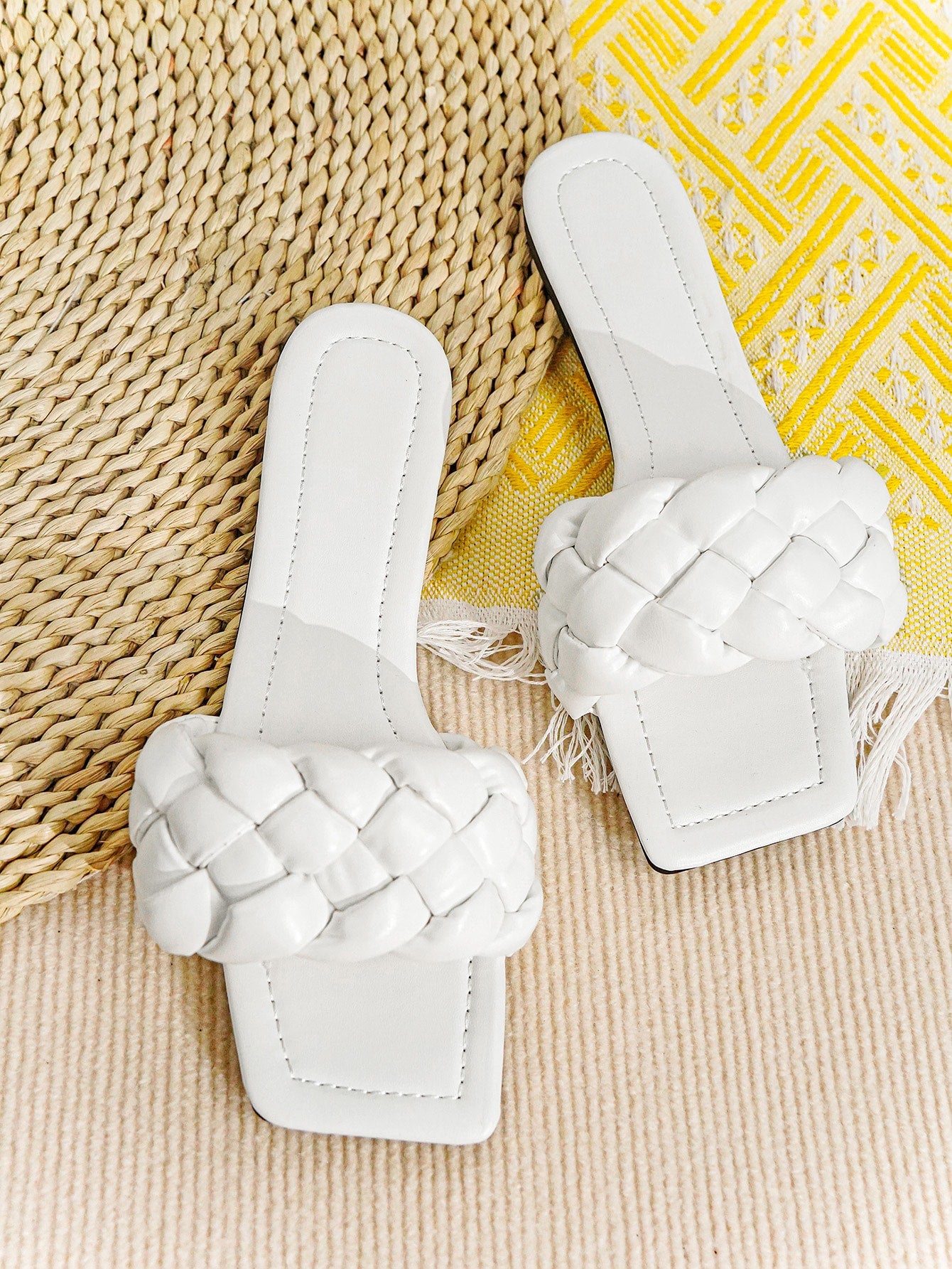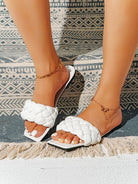 صندل نسائي أبيض بتصميم مضفر، مفتوح من الأمام، مسطح، مثالي للعطلات