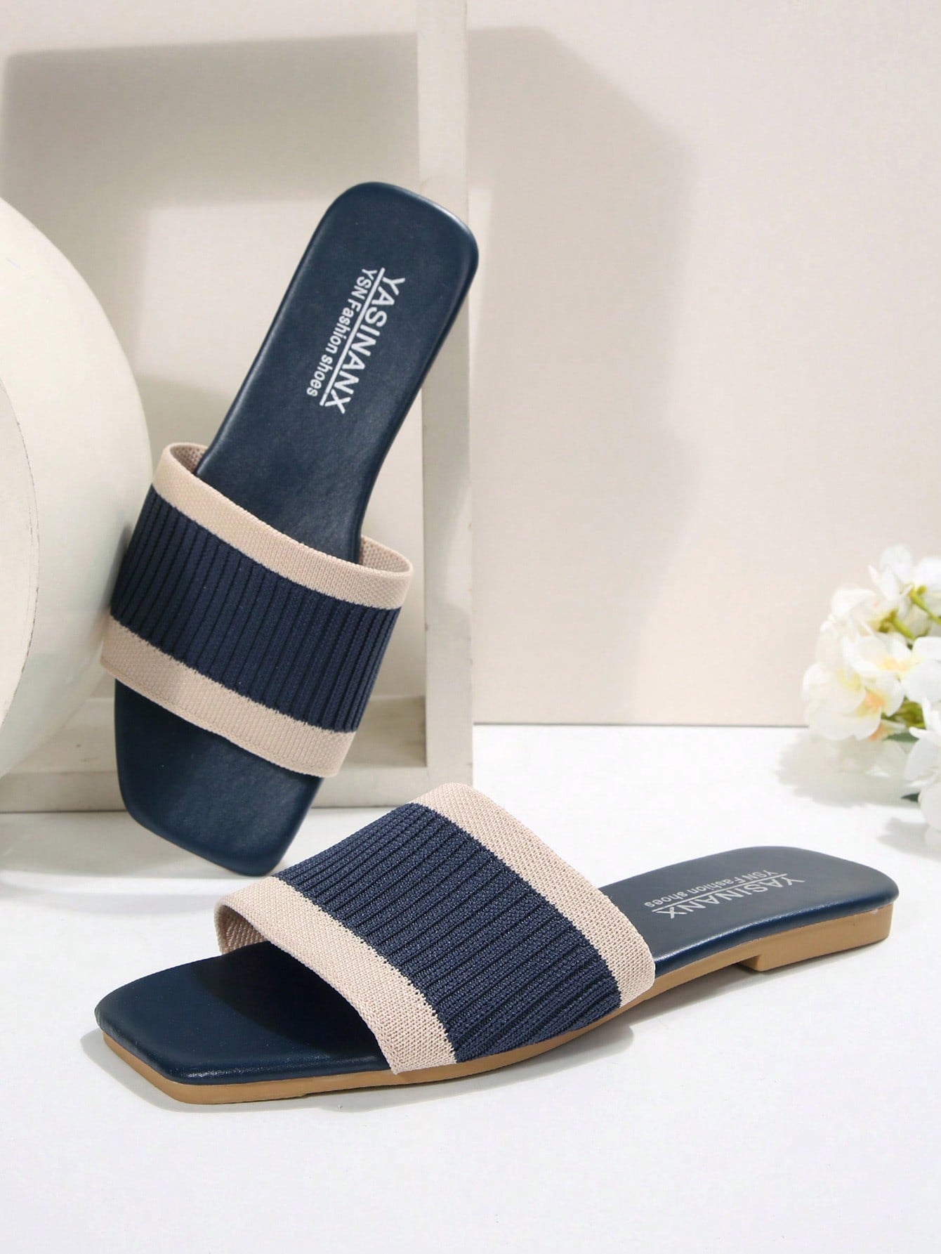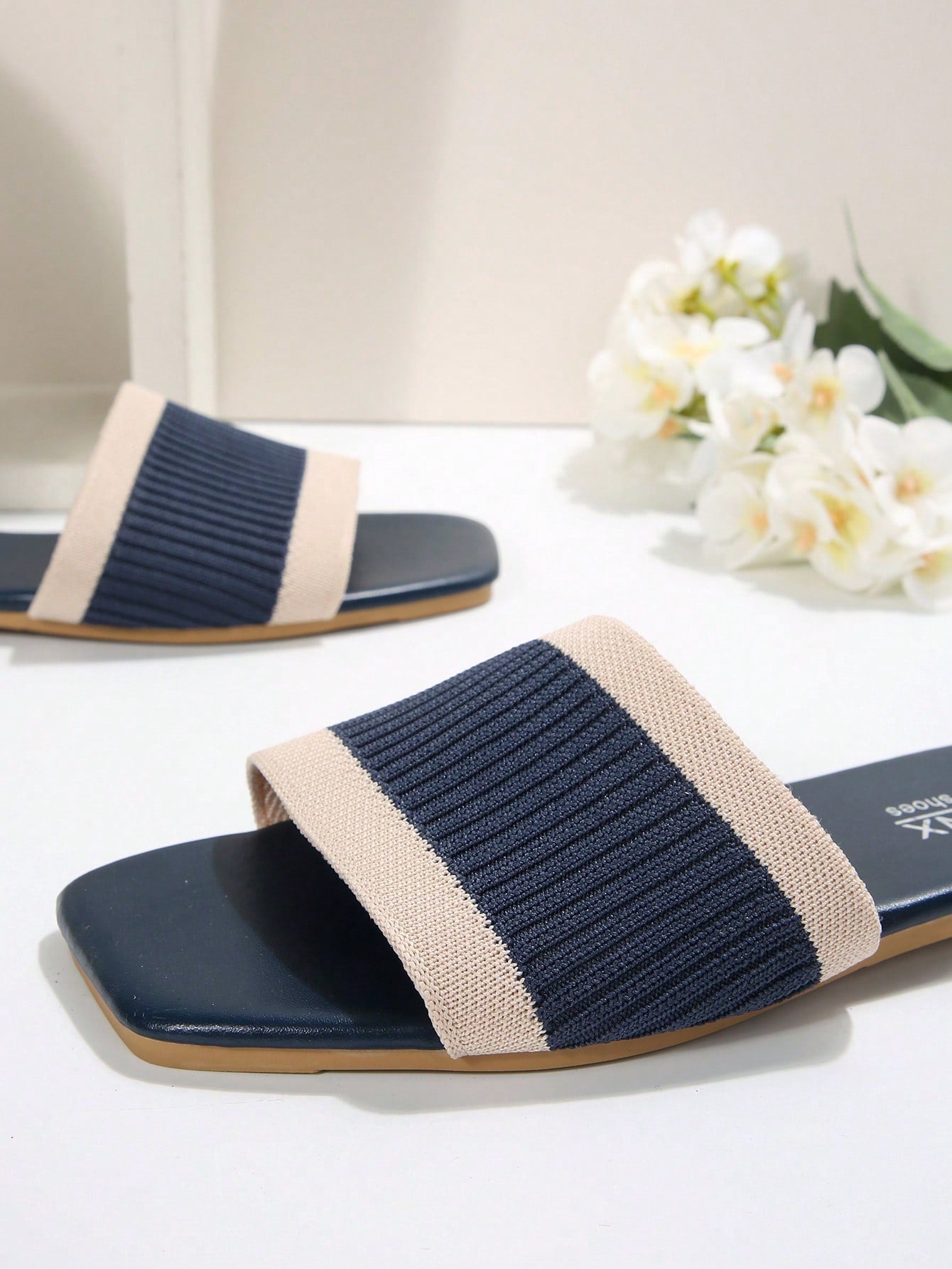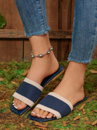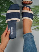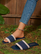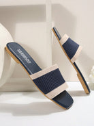 صنادل نسائية زرقاء منسوجة ومضلعة، شباشب صيفية، أحذية شاطئ مسطحة. شباشب نسائية