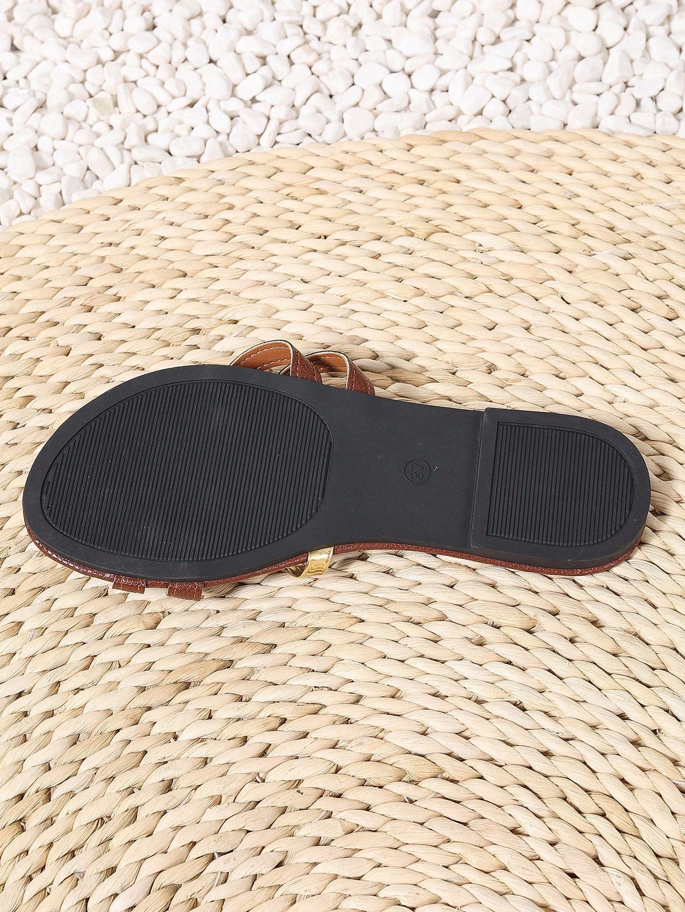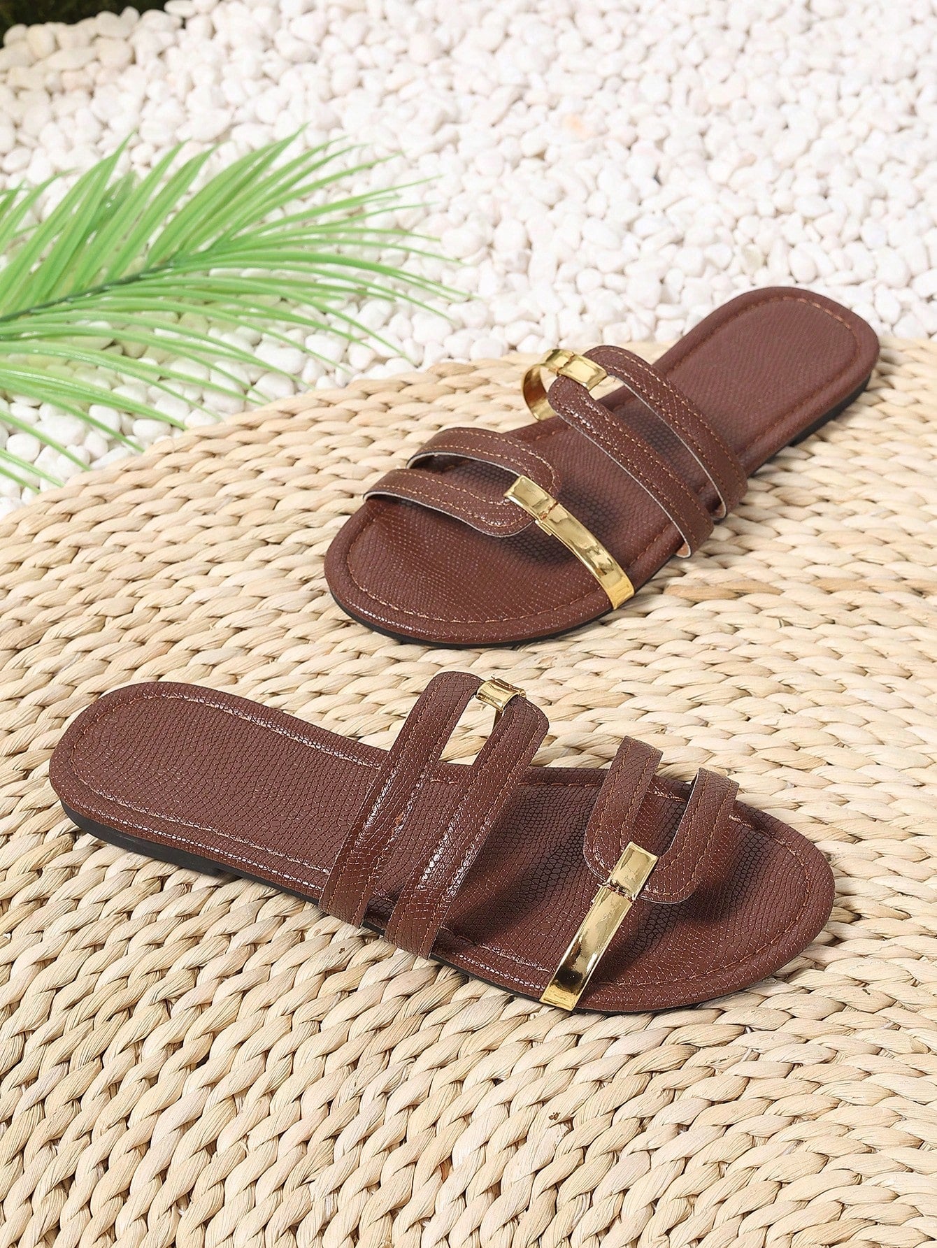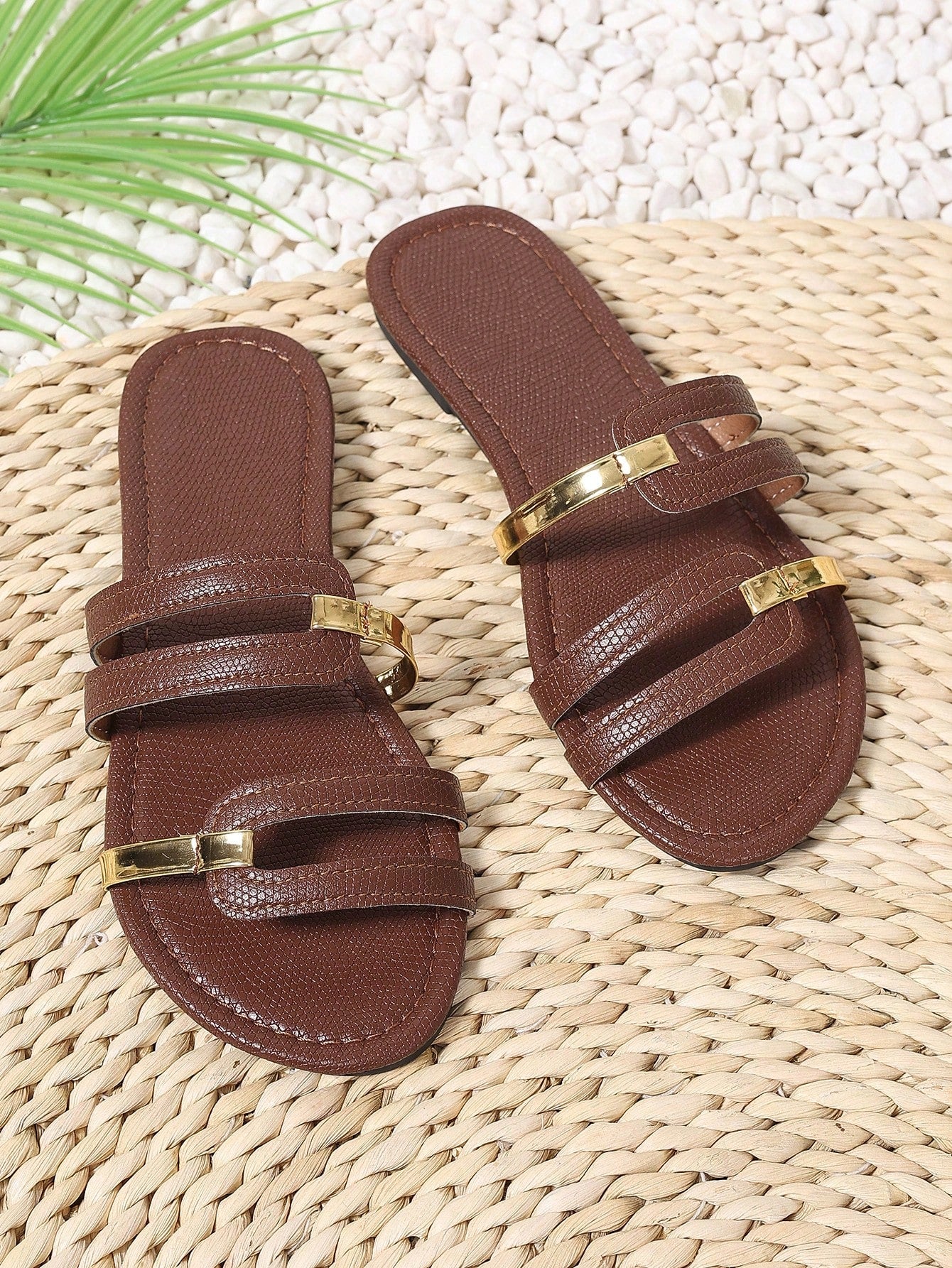شباشب نسائية صيفية جديدة ذات مقدمة مستديرة مسطحة مانعة للانزلاق ومقاومة للتآكل ومزينة بخطوط ذهبية مفتوحة من الأمام باللون البني