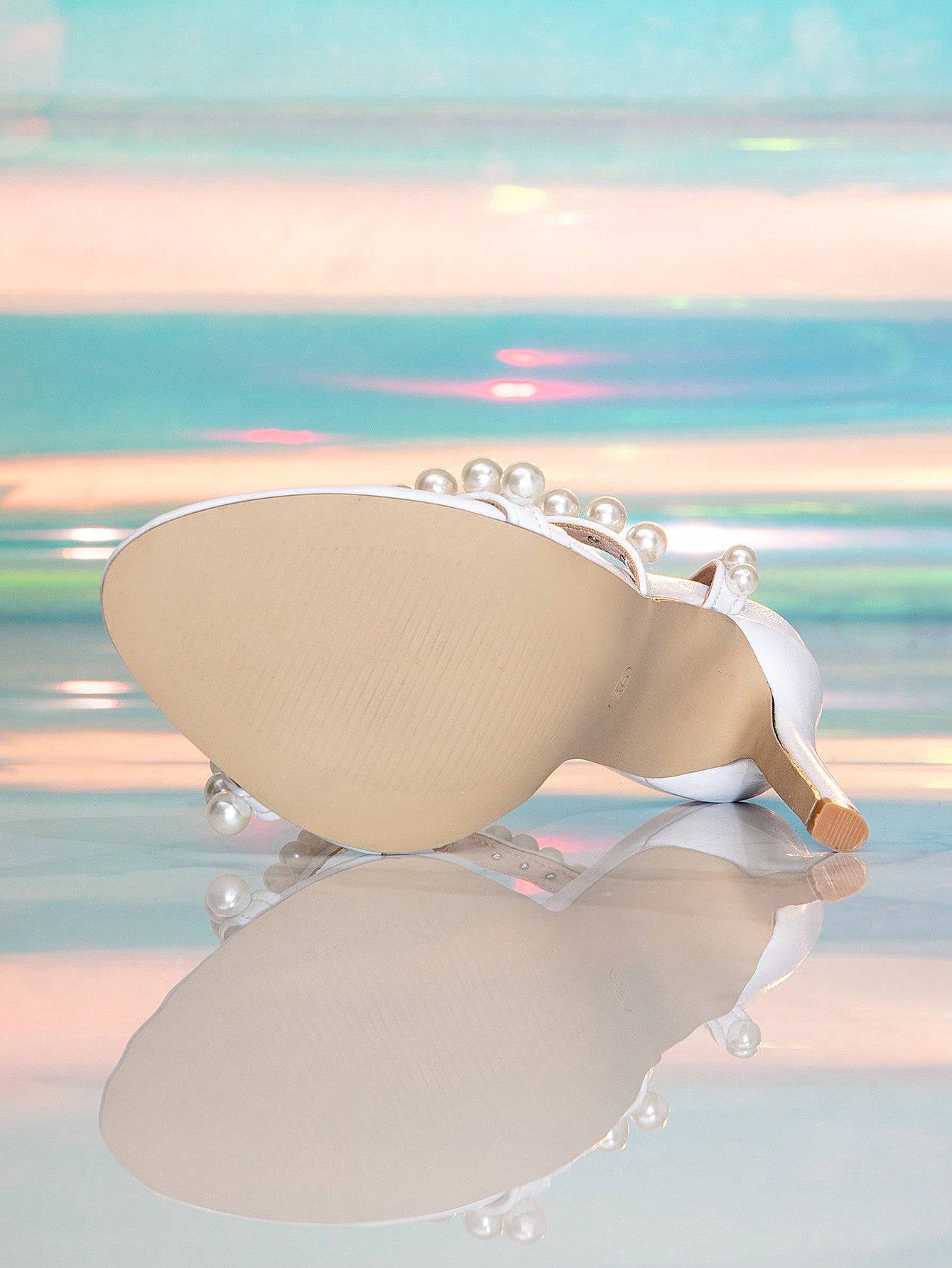 حذاء زفاف نسائي جديد أنيق مزين بأحجار الراين واللؤلؤ، بكعب رفيع ومقدمة مستديرة، مع حزام مرصع باللؤلؤ.