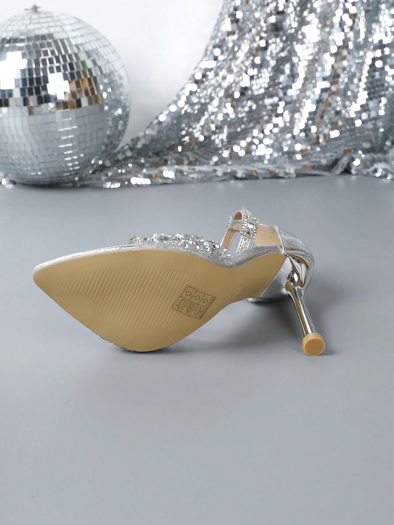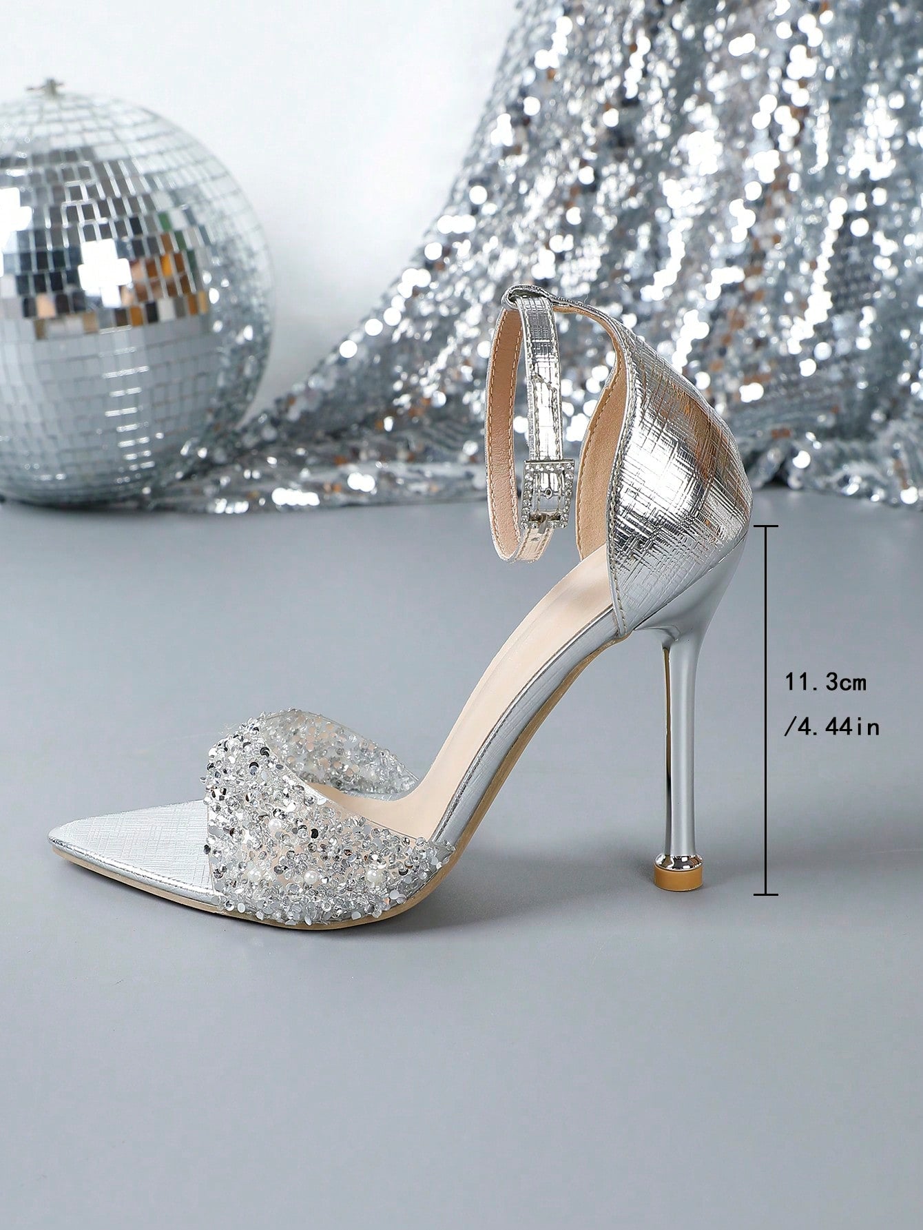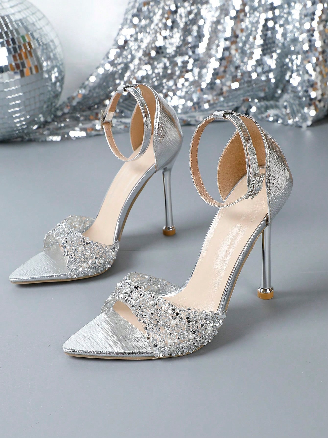 women Pointed Toe High Heel Shiny Crystal Metal Sandals