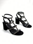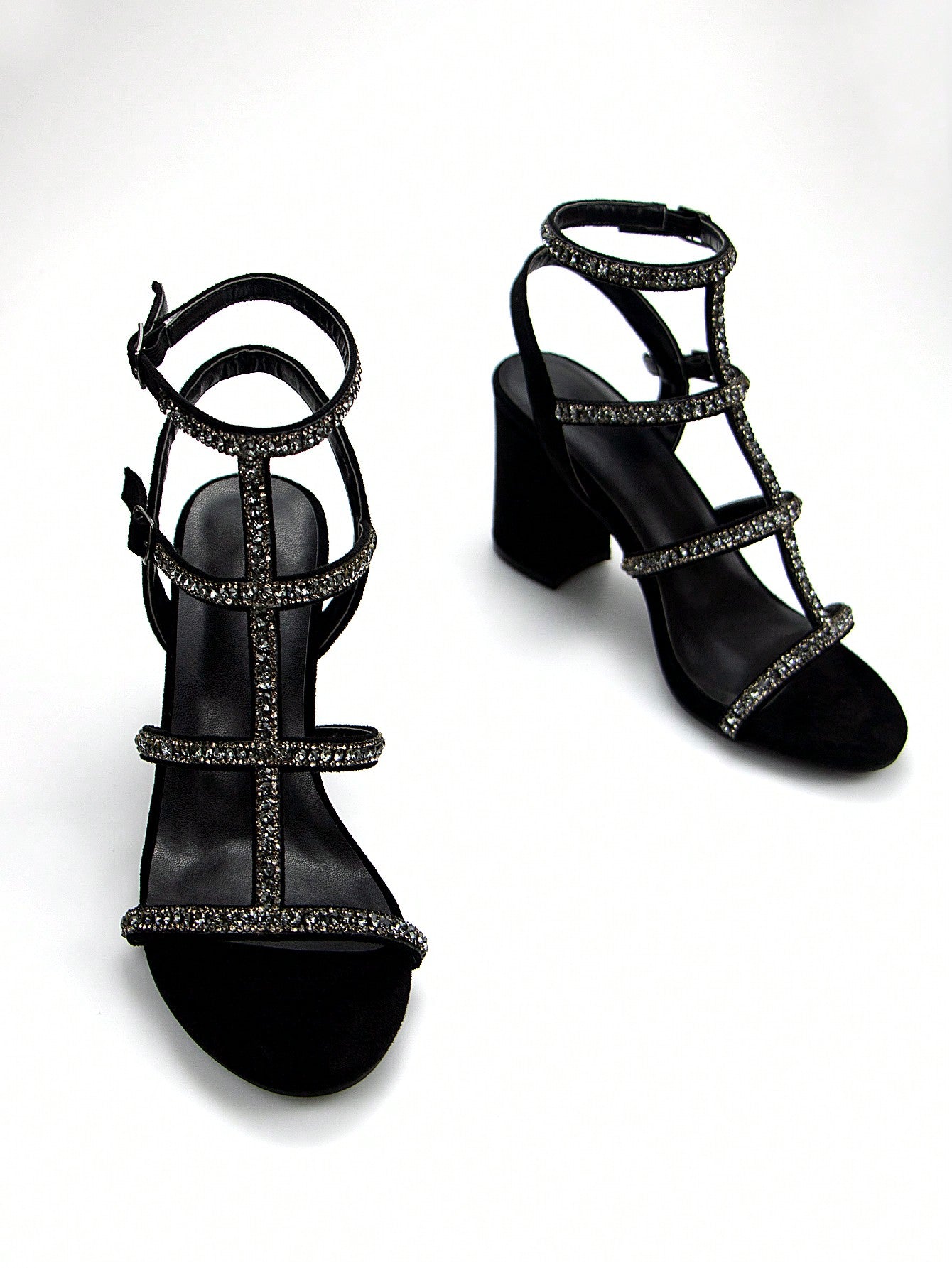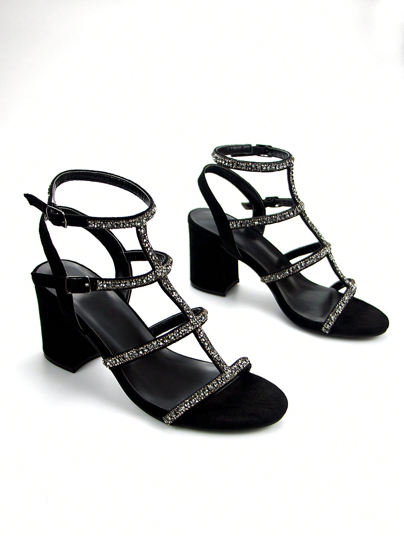 women Women Classic Elegant Rhinestone Thin Strap Black Velvet Fashion Chunky Heels With Round Toe