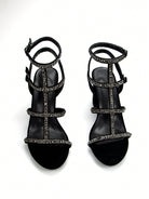 حذاء نسائي كلاسيكي أنيق من المخمل الأسود بحزام رفيع مرصع بأحجار الراين وكعب سميك مع مقدمة مستديرة