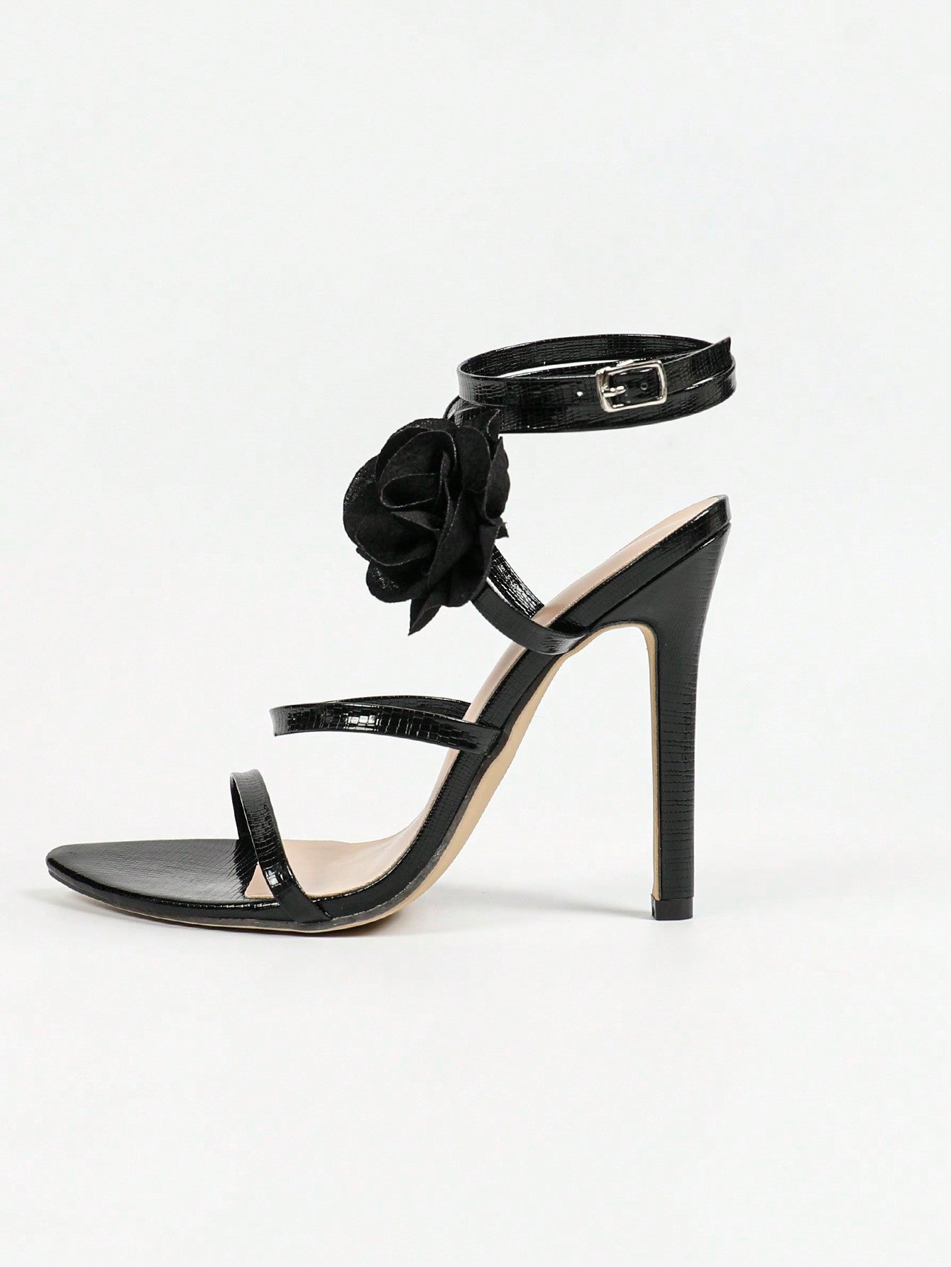صنادل نسائية بكعب عالٍ باللون الأسود بحزام متقاطع ثلاثي الأبعاد ومشبك وأصابع مفتوحة وجذابة ورومانسية لحفلات الزفاف