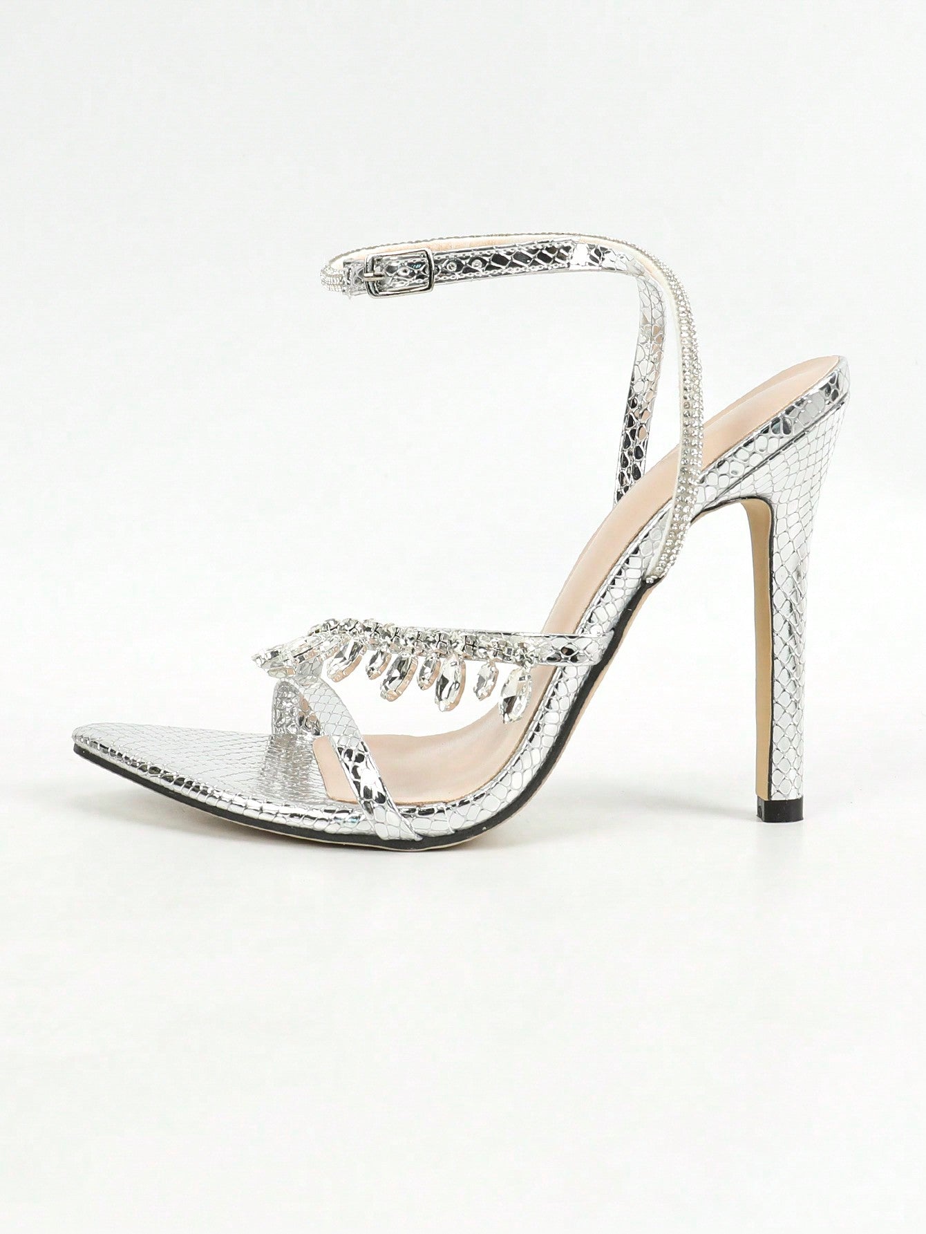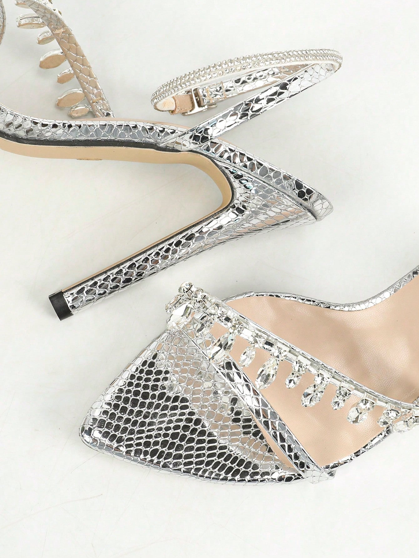 صندل نسائي بكعب عالٍ مدبب من الأمام وحزام كاحل متقاطع ومزين بسلسلة ألماس وأحجار الراين
