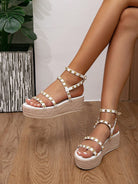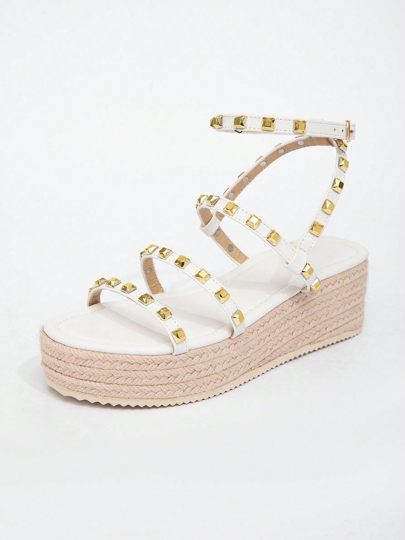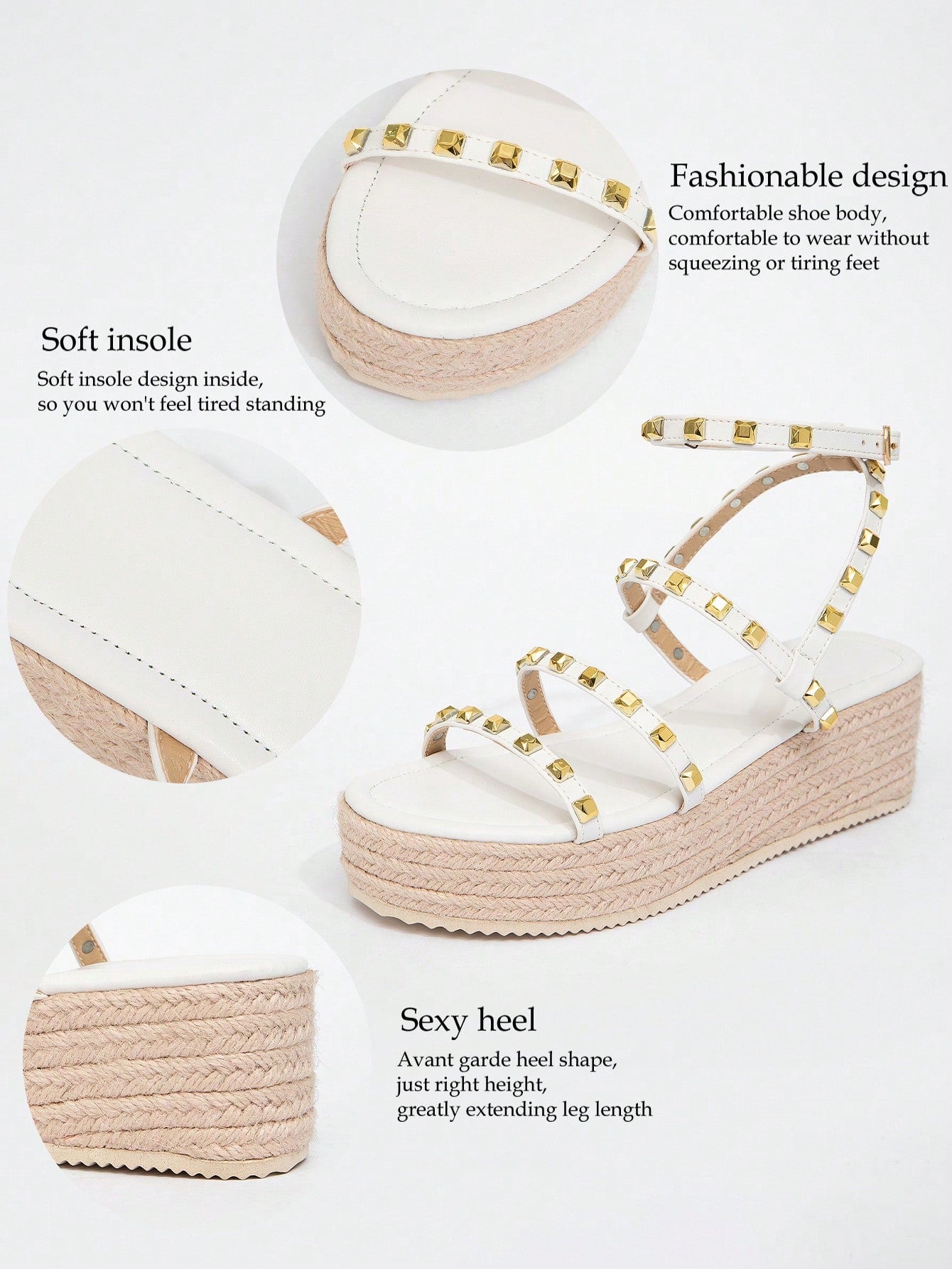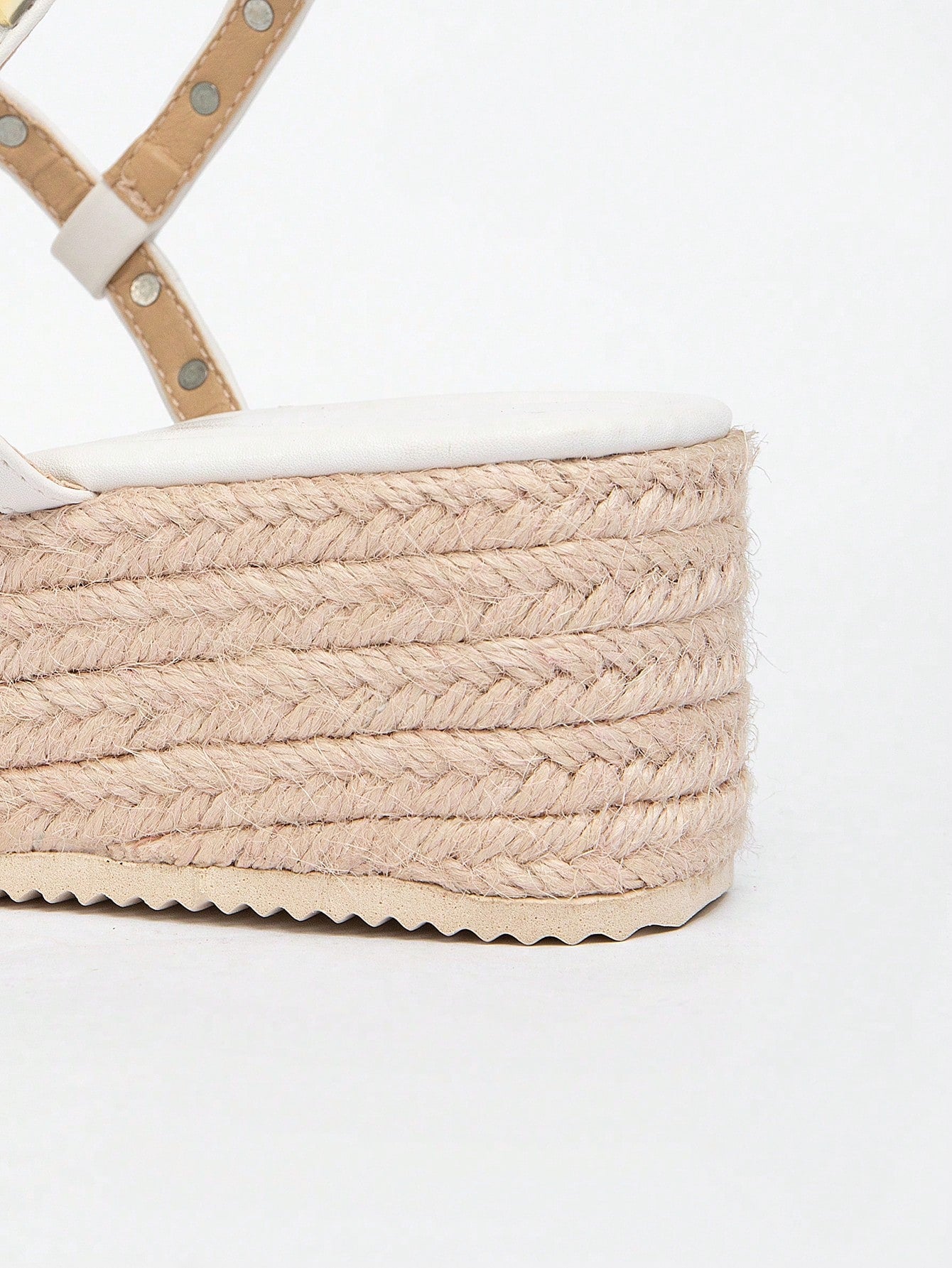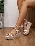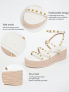 صندل نسائي بكعب إسفيني منسوج مقاوم للماء مع حزام حبل مفتوح من الأمام
