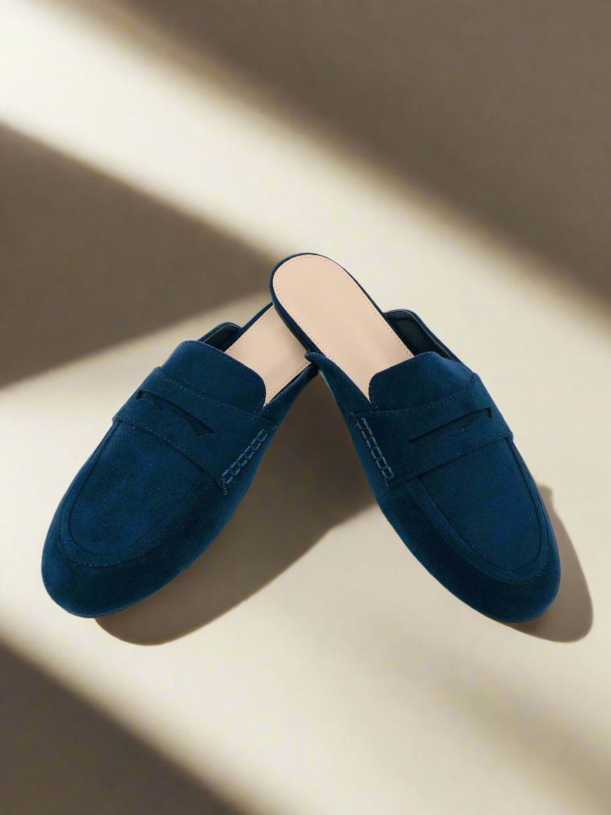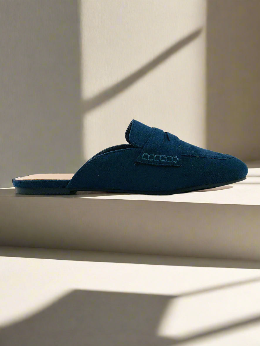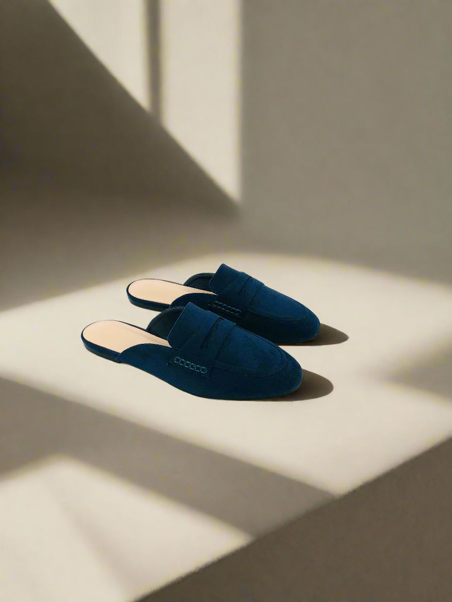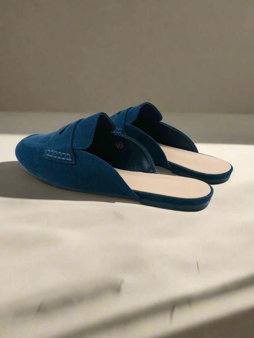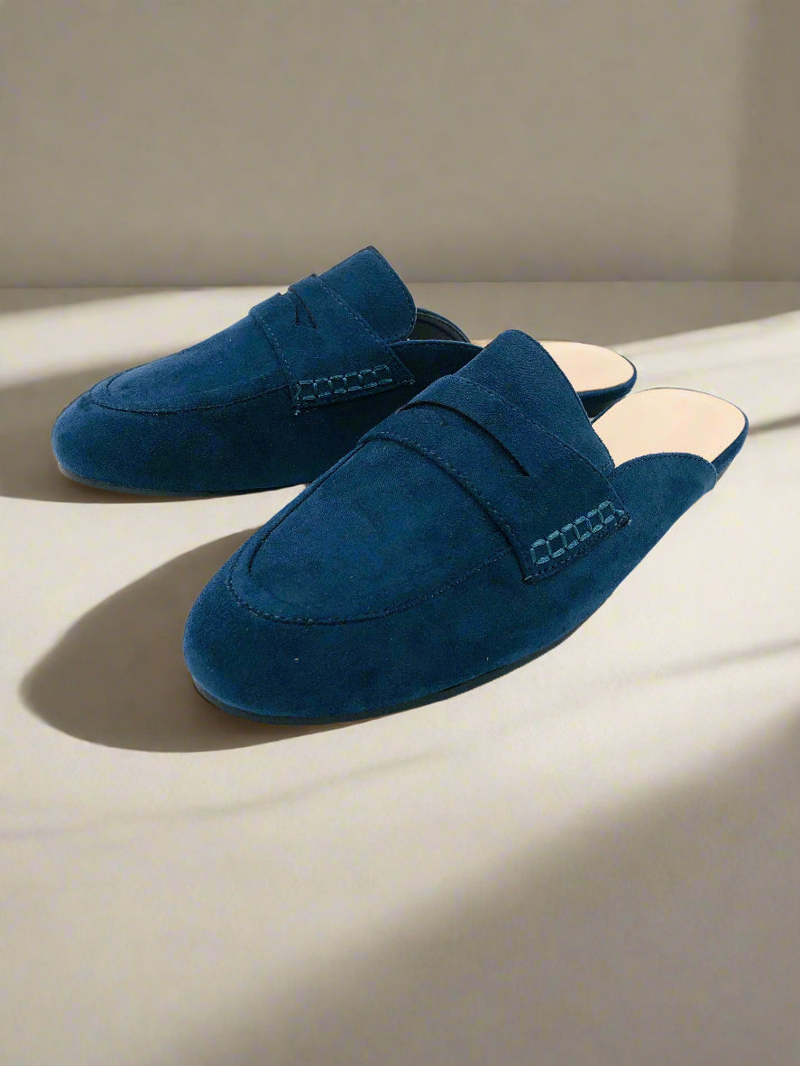 نعال أزرق مريح وعملي، مثالي للاستخدام اليومي. تصميمه المسطح والمقدمة الدائرية يوفران راحة قصوى للقدم.