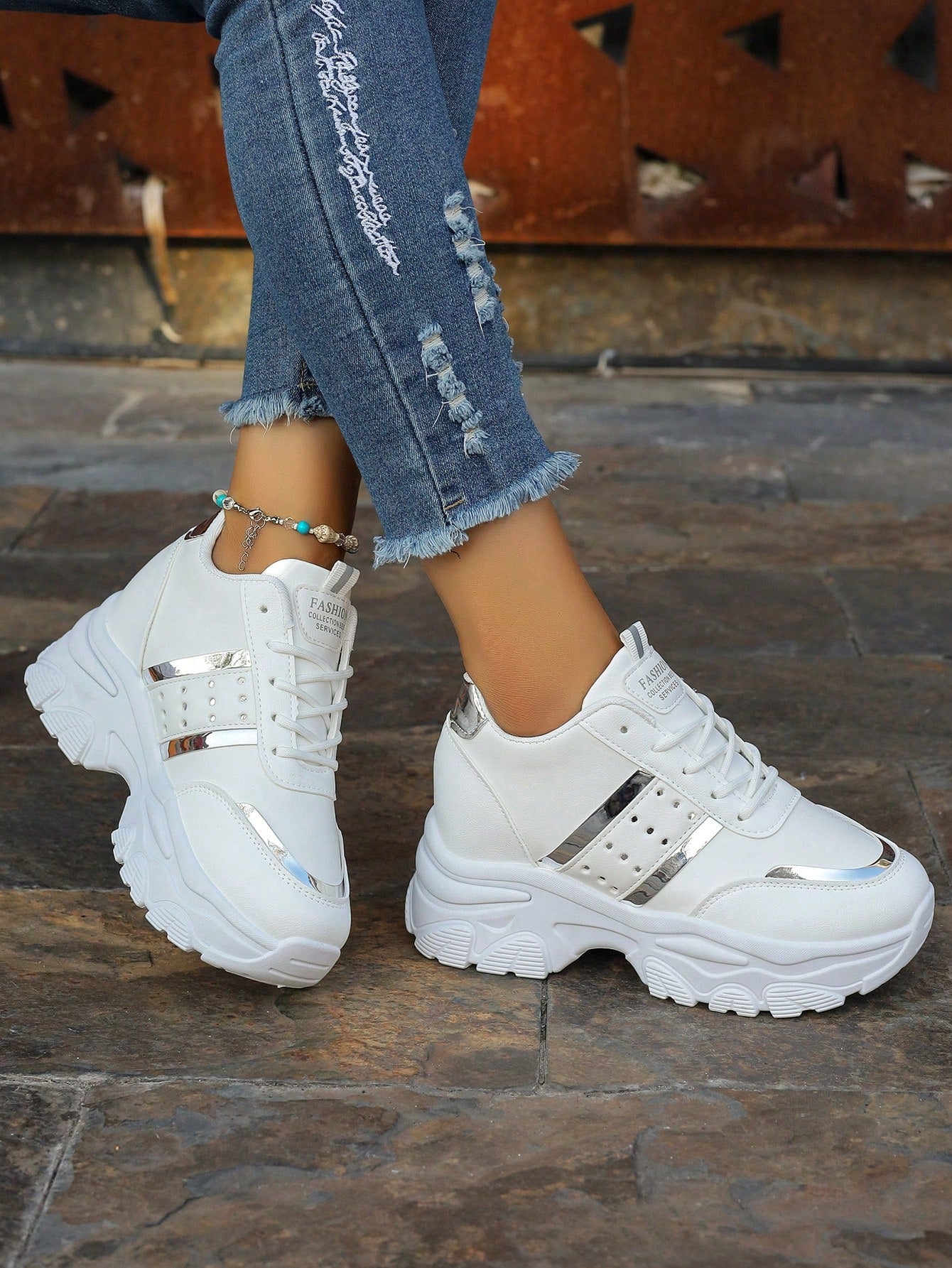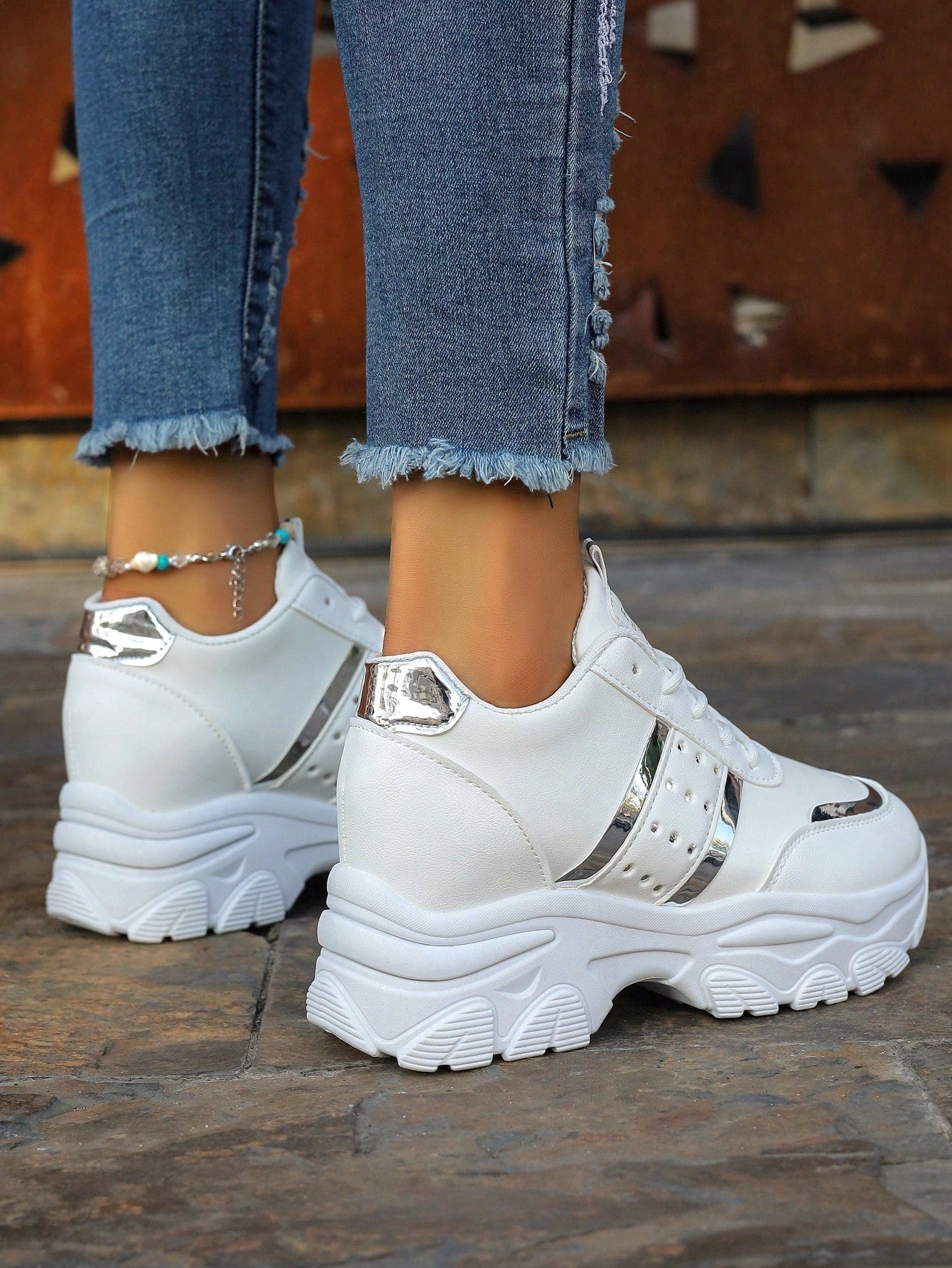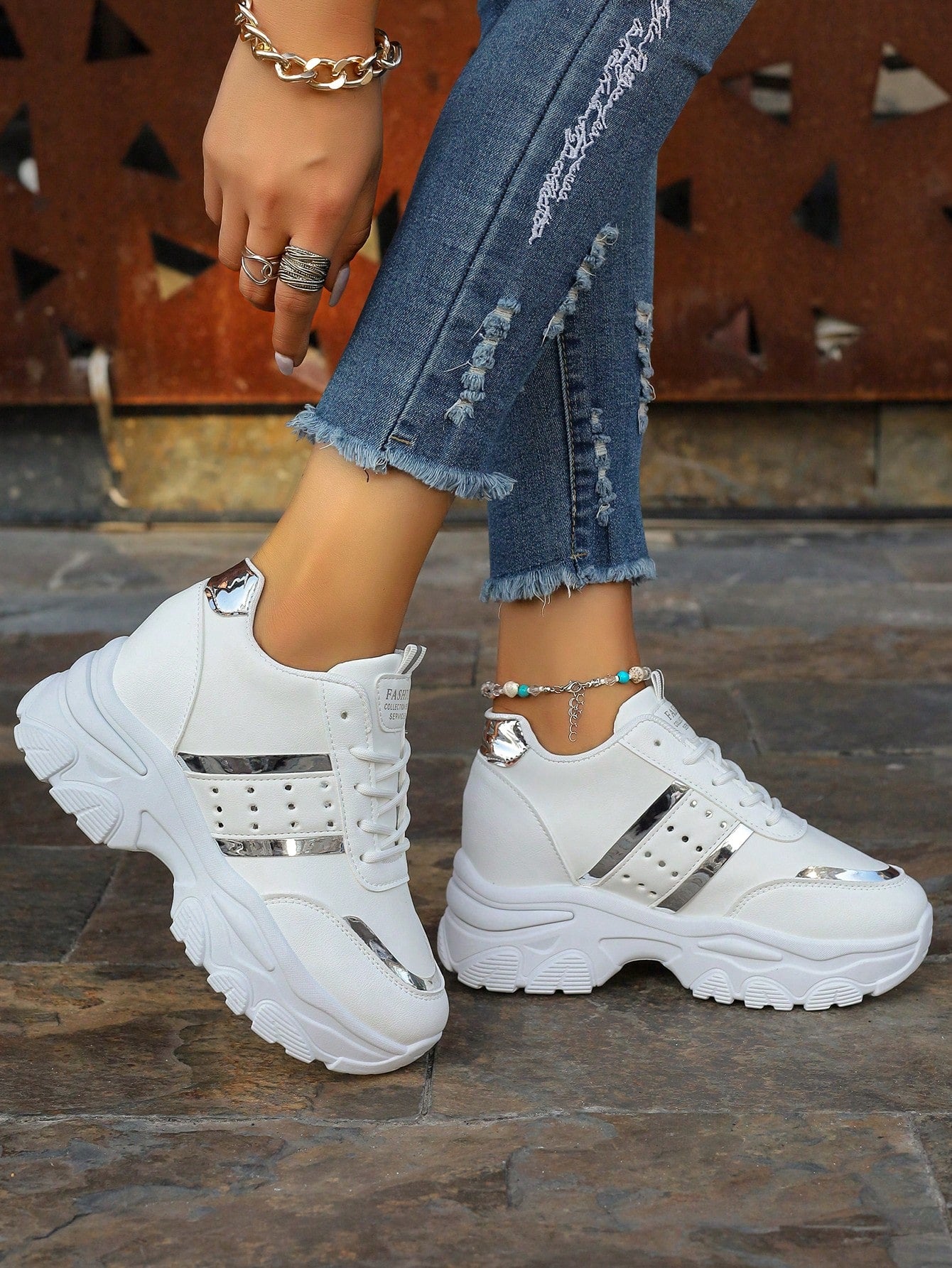 زوج واحد من الأحذية الرياضية النسائية البيضاء الجلدية الكاجوال ذات النعل السميك والمنصة، مع نعل داخلي مخفي.